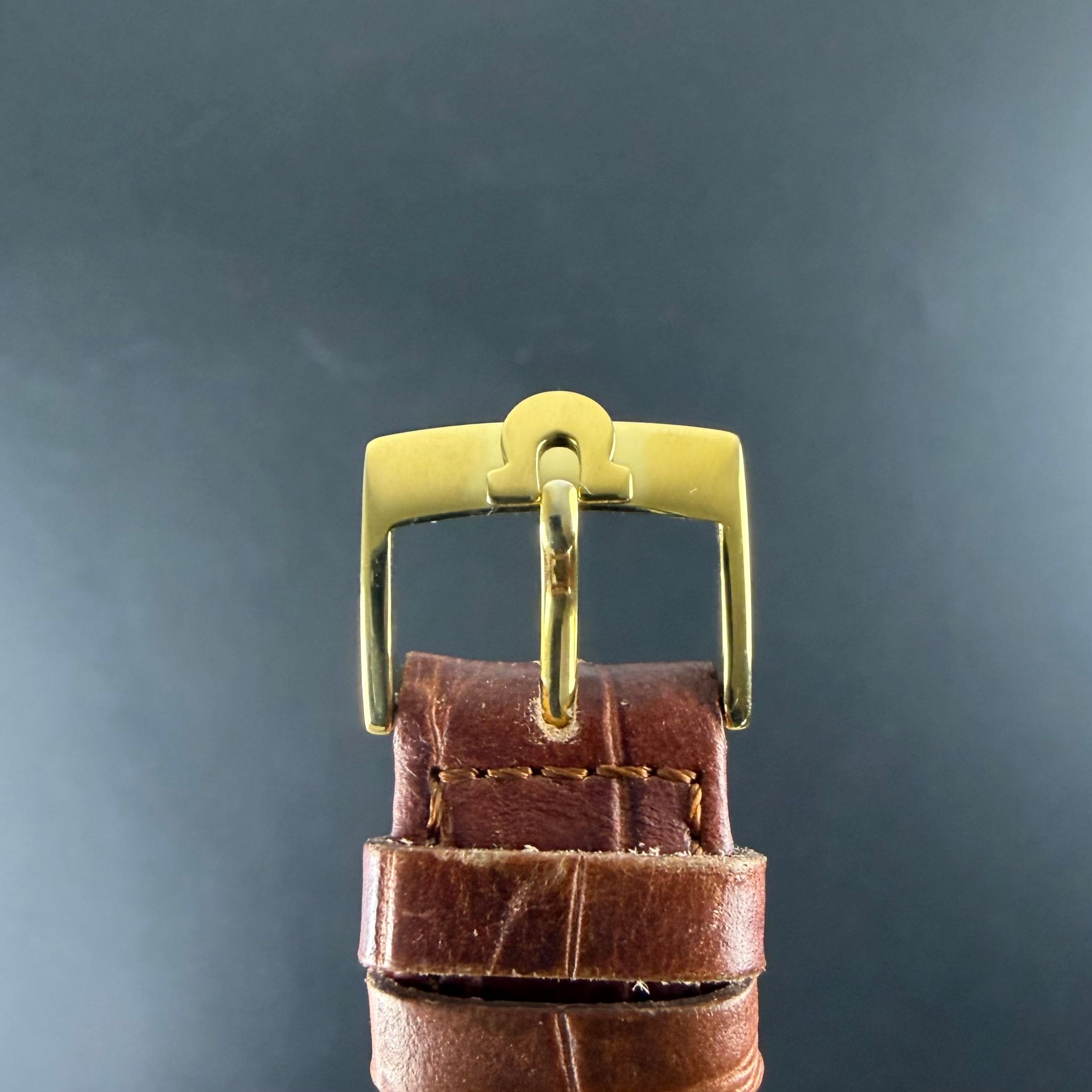 This vintage Omega Genève, produced in 1972, features a stunning white dial with a vertical brushed finish. The stainless steel case is gold-plated and in excellent condition, retaining its sharp edges. Inside is the automatic caliber 1022 movement with a Day-Date function, displaying weekdays in English. The movement is in outstanding condition, having been serviced in November 2025 and now running flawlessly. The watch is paired with a new brown calf leather strap with a crocodile grain motif by Hoders, which is anti-allergic and water-resistant. Overall, this beautifully preserved and fully original timepiece, apart from the new strap, makes an exceptional dress watch.Year of production: 1972