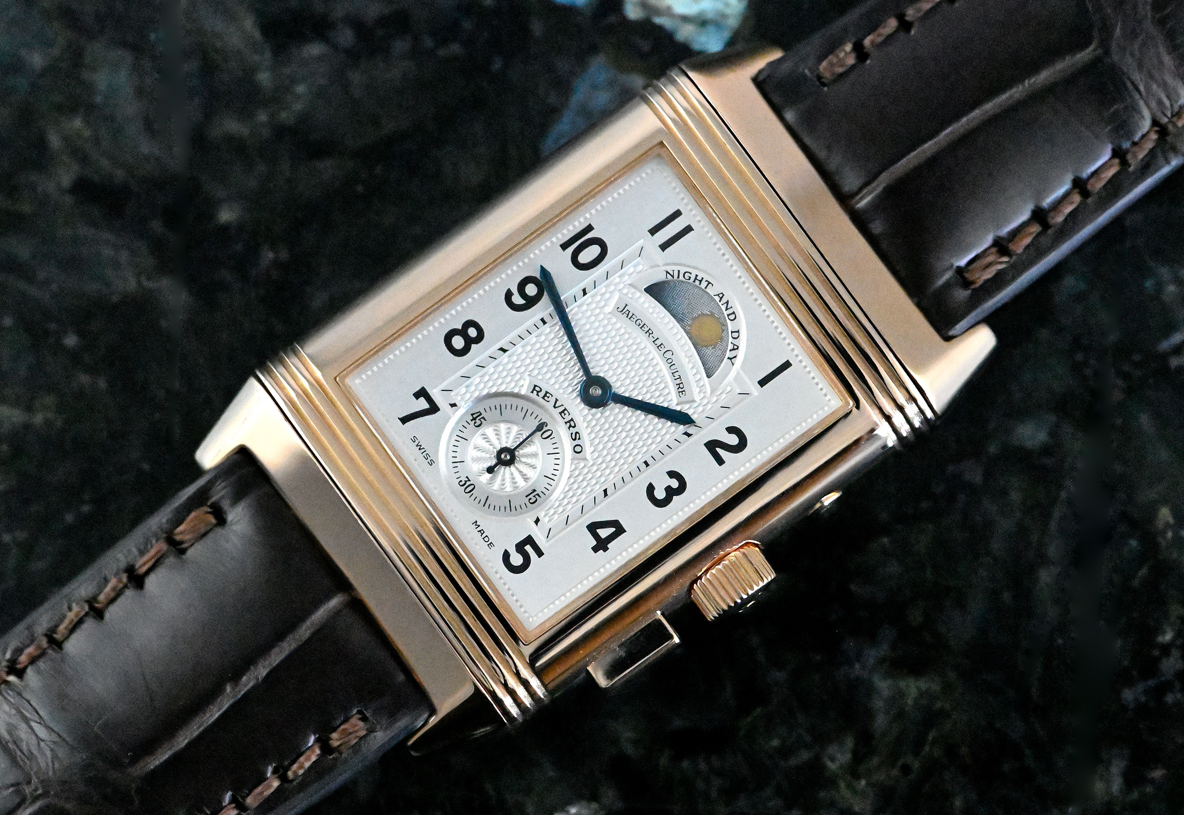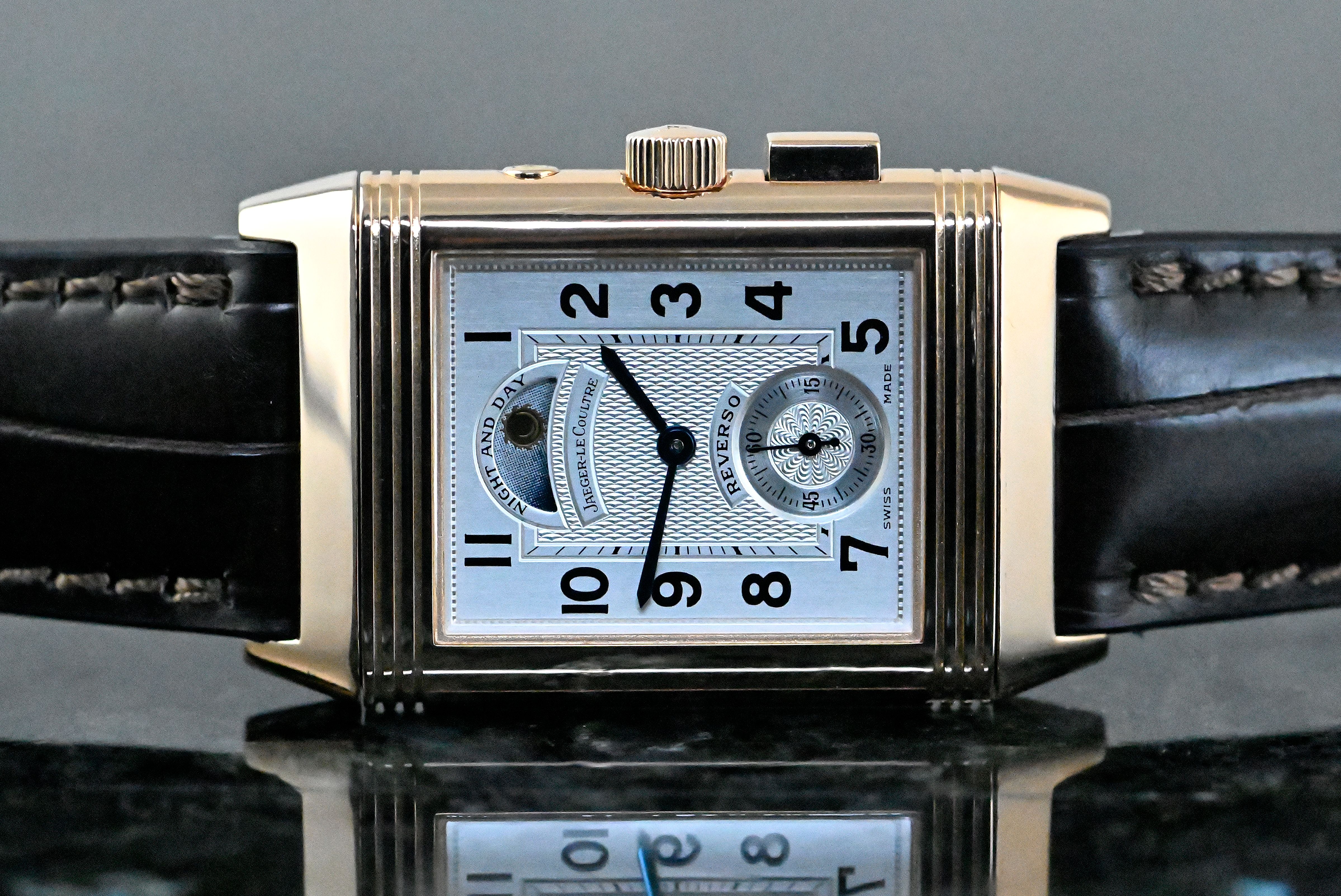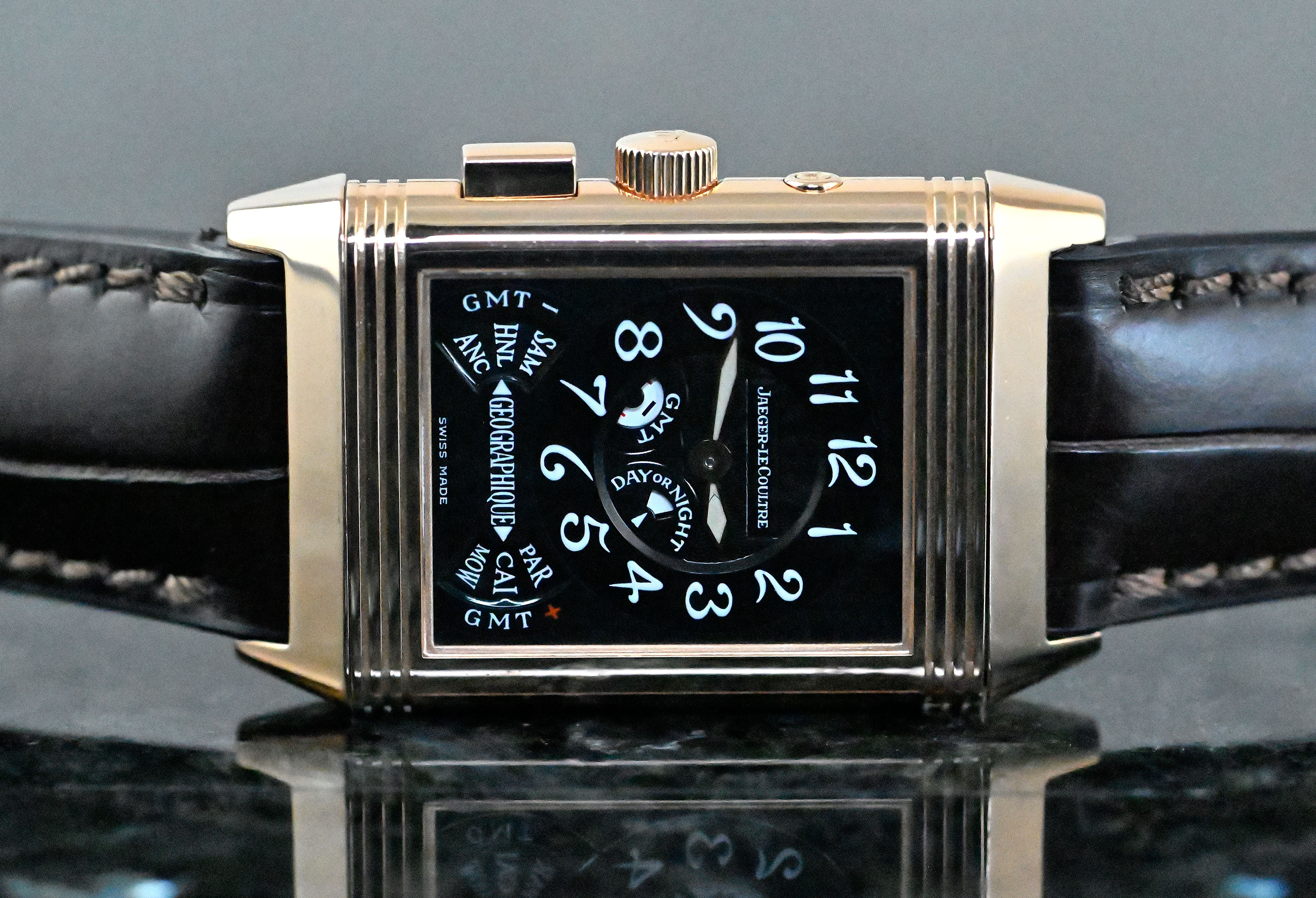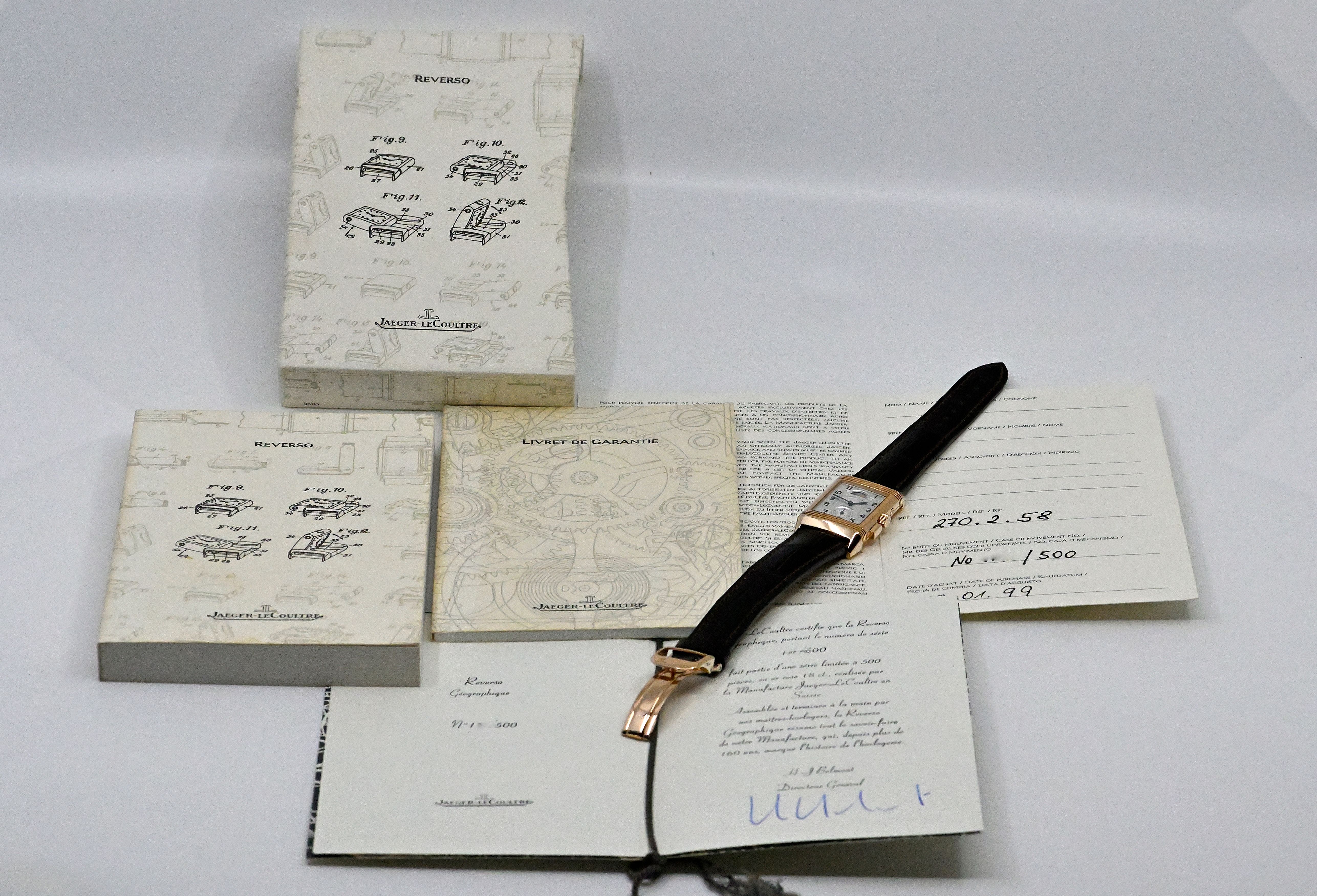 Limited edition Jaeger-LeCoultre Reverso Géographique | reference 270.2.58 | in 18k rose gold from 1999 | JLC hand-wound calibre 858 (base calibre 854) | following functions: Hours – minutes – small seconds – day and night display – second time zone – 24-hour display | produced in a limited series of only 500 pieces | in addition to the Géographique - five other variants were also produced in limited editions of 500 pieces: Tourbillon, Septantieme, Chronograph, Minute Repeater and Perpetual Calendar | reversible case that can be swivelled 180° | dimensions of 41 x 25 mm | new dark brown alligator strap with the original JLC folding clasp in 18k rose gold | serviced by our master watchmaker in November 2025 | very good condition | the watch comes with the following accessories / documents: original warranty certificate (sold in January 1999 by WEMPE Hamburg) – Livret de Garantie – Certificat D' Authenticite with limited edition number – description / operating instructions for the Reverso.