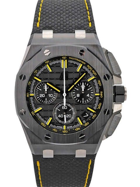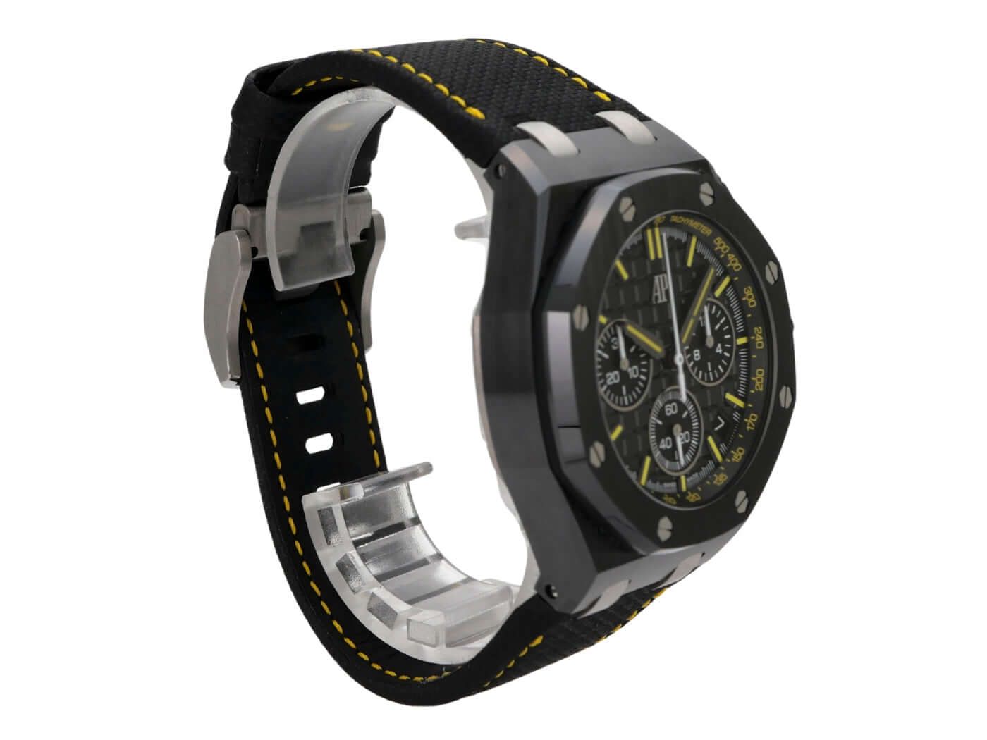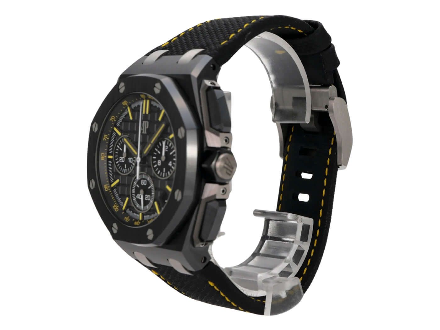 Audemars Piguet Royal Oak Offshore Chronograph 26420CE.OO.A005VE.01Housing made of Polished and satin-finished ceramic, case diameter 43 mm, case height 14.4 mm, black ceramic bezel, black rubber strap with titanium pin buckle, additional yellow leather strap, black dial with luminous indices, black subdials, tachymeter scale, automatic movement, manufacture caliber 4401 with 40 jewels, frequency 28,800 A/h, power reserve approx. 70 hours, chronograph, date display, flyback function, anti-reflective sapphire crystal, screwed display back, water-resistant up to 10 bar, limited to 500 pieces.
