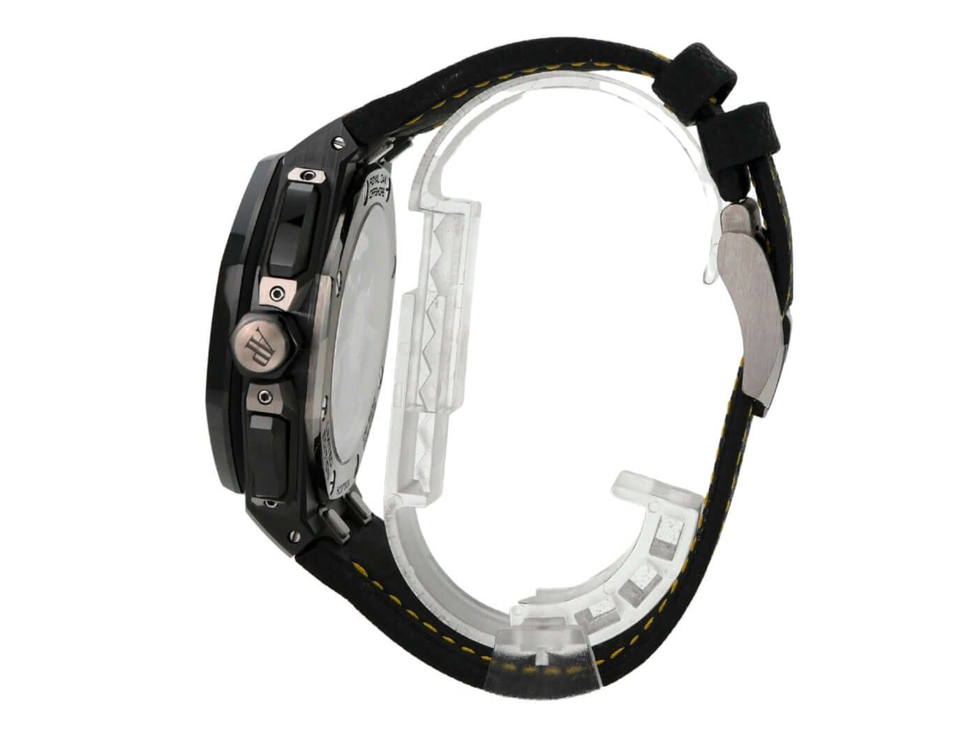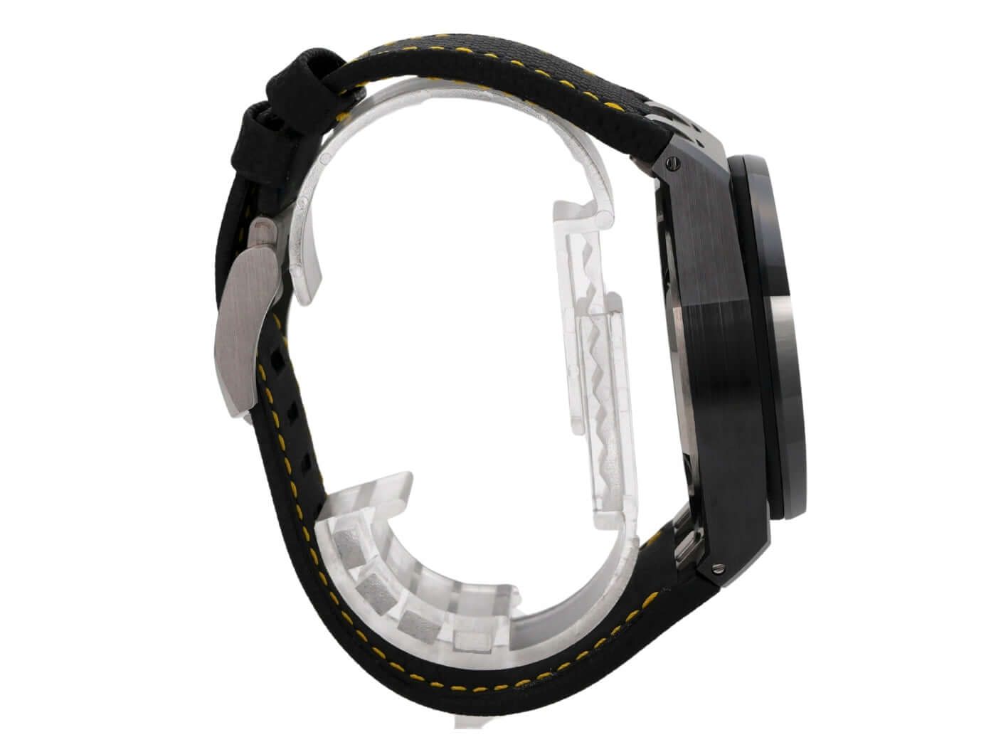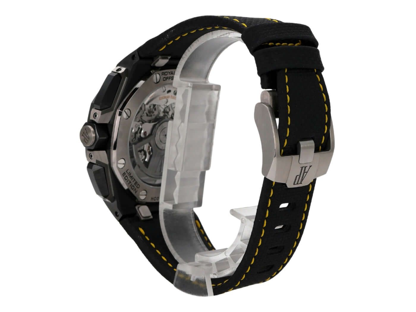 Audemars Piguet Royal Oak Offshore Chronograph 26420CE.OO.A005VE.01Housing made of Polished and satin-finished ceramic, case diameter 43 mm, case height 14.4 mm, black ceramic bezel, black rubber strap with titanium pin buckle, additional yellow leather strap, black dial with luminous indices, black subdials, tachymeter scale, automatic movement, manufacture caliber 4401 with 40 jewels, frequency 28,800 A/h, power reserve approx. 70 hours, chronograph, date display, flyback function, anti-reflective sapphire crystal, screwed display back, water-resistant up to 10 bar, limited to 500 pieces.