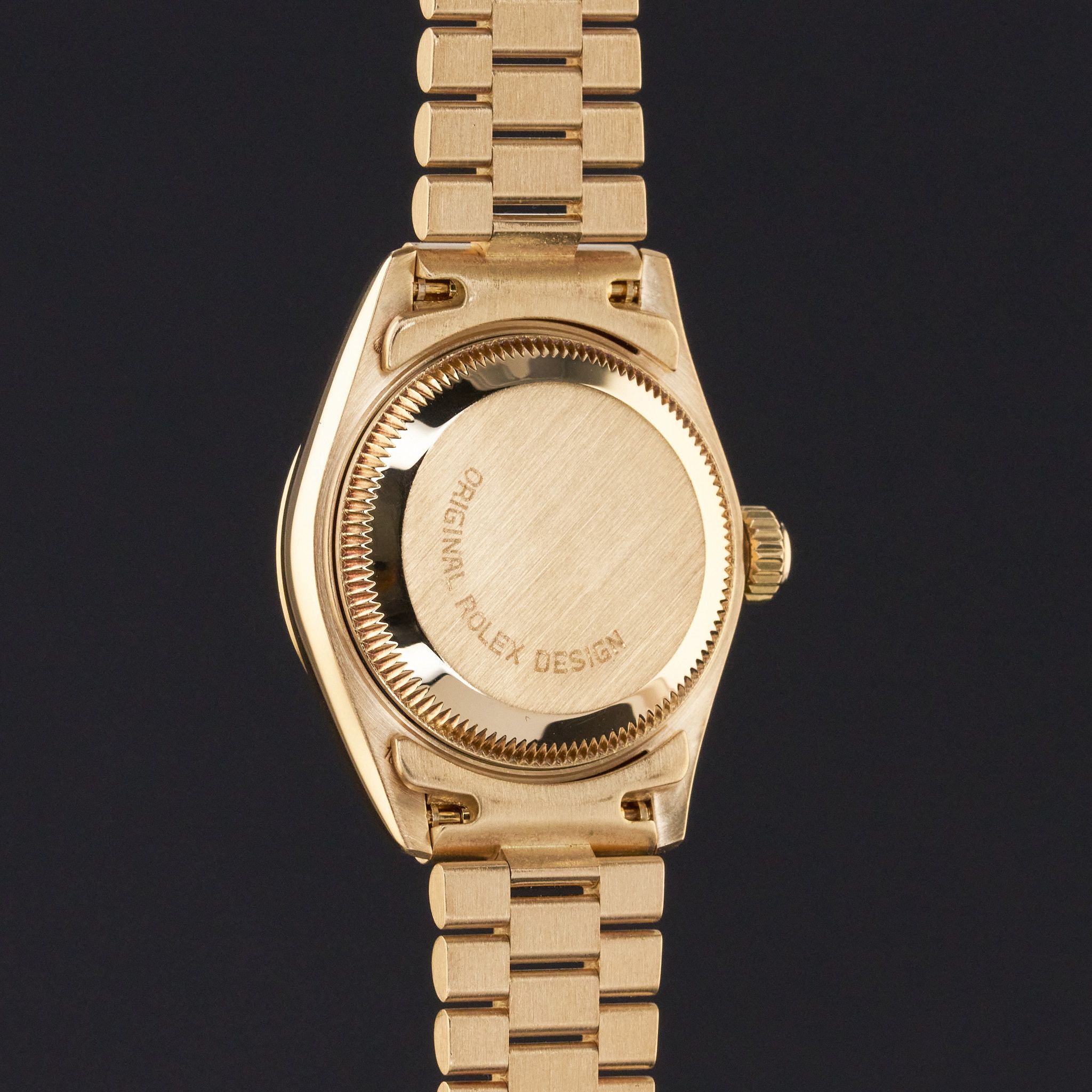Diese Rolex Lady-Datejust 69178 verfügt über ein lapislazuli-farbenes Zifferblatt und ist aus 18K Gelbgold gefertigt, mit einem Produktionsjahr von 1991.