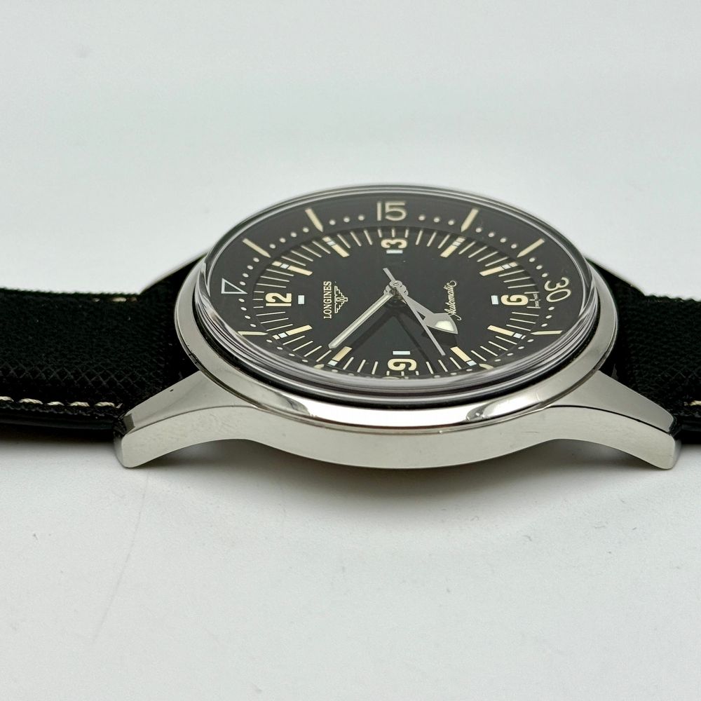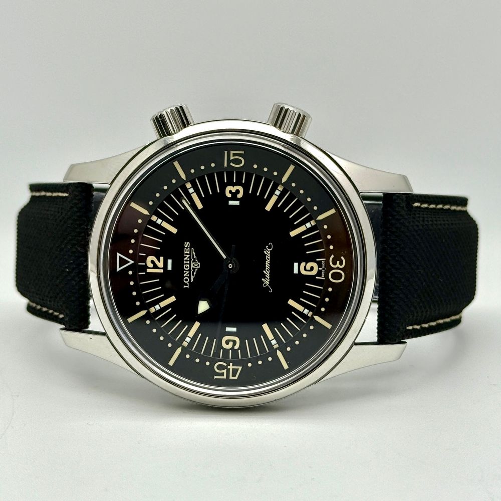 Founded in 1832 in Saint-Imier, Switzerland, Longines is renowned for its timeless elegance, precision, and rich watchmaking heritage. The Legend Diver is part of the brand’s Heritage collection and pays homage to Longines’ iconic 1960s super-compressor dive watches, combining vintage aesthetics with modern reliability.The Longines Legend Diver 42 Automatic No Date, reference L3.674.4.56.2 features a 42 mm stainless steel case with a glossy black dial, luminous hands, and indices that reflect the original vintage design. As one of the earliest modern reissues, this no-date version is highly sought after for its clean, symmetrical dial layout. Powered by the Longines caliber L633 automatic movement (based on the ETA 2824-2, with a 38-hour power reserve and a frequency of 28,800 vph), it provides hours, minutes, and central seconds with smooth mechanical performance.