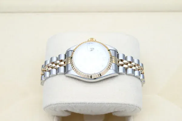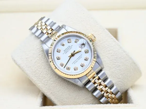 Rolex Lady-Datejust 79173 mit der weißen Diamanten-Wijzerplaat aus 2003 in ausgezeichnetem Zustand, einschließlich der originalen Box und Papiere. Alle unsere Uhren wurden gründlich von unserem eigenen Uhrmacher überprüft und bei Bedarf gewartet.