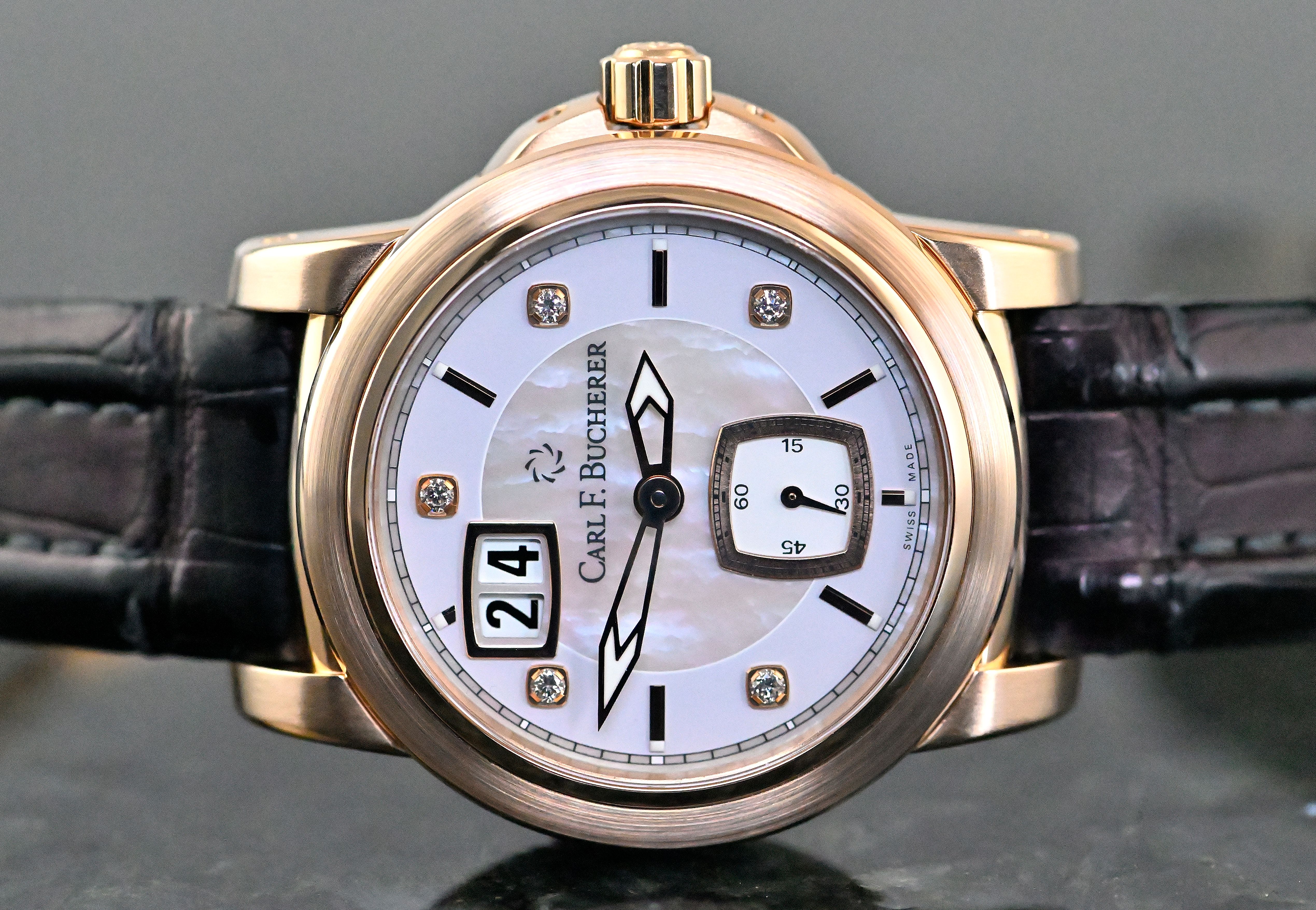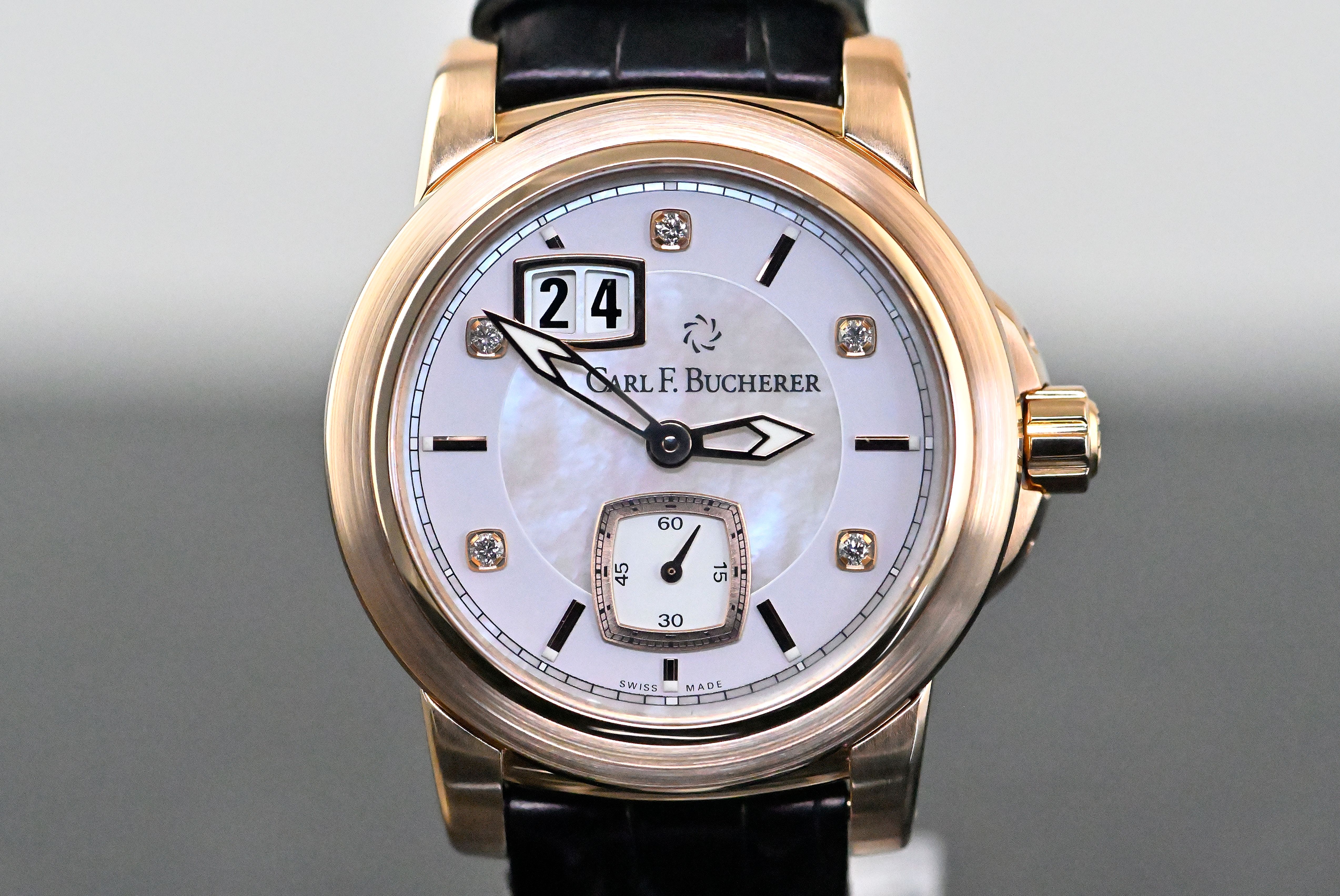 Carl F. Bucherer Patravi Big Date | Referenznummer 10630.03 | in 18k Roségold | Bucherer Automatikwerk A1000 mit Großdatum | weiße Zifferblatt mit Perlmutt-Innenraum und fünf Diamantindizes | Durchmesser von 38 mm | original Bucherer Lederarmband mit originalem Faltschließe in 18k Roségold | sehr guter Zustand | Gesamtgewicht ca. 122 Gramm | enthaltene originale Bucherer Box und Außenkarton.