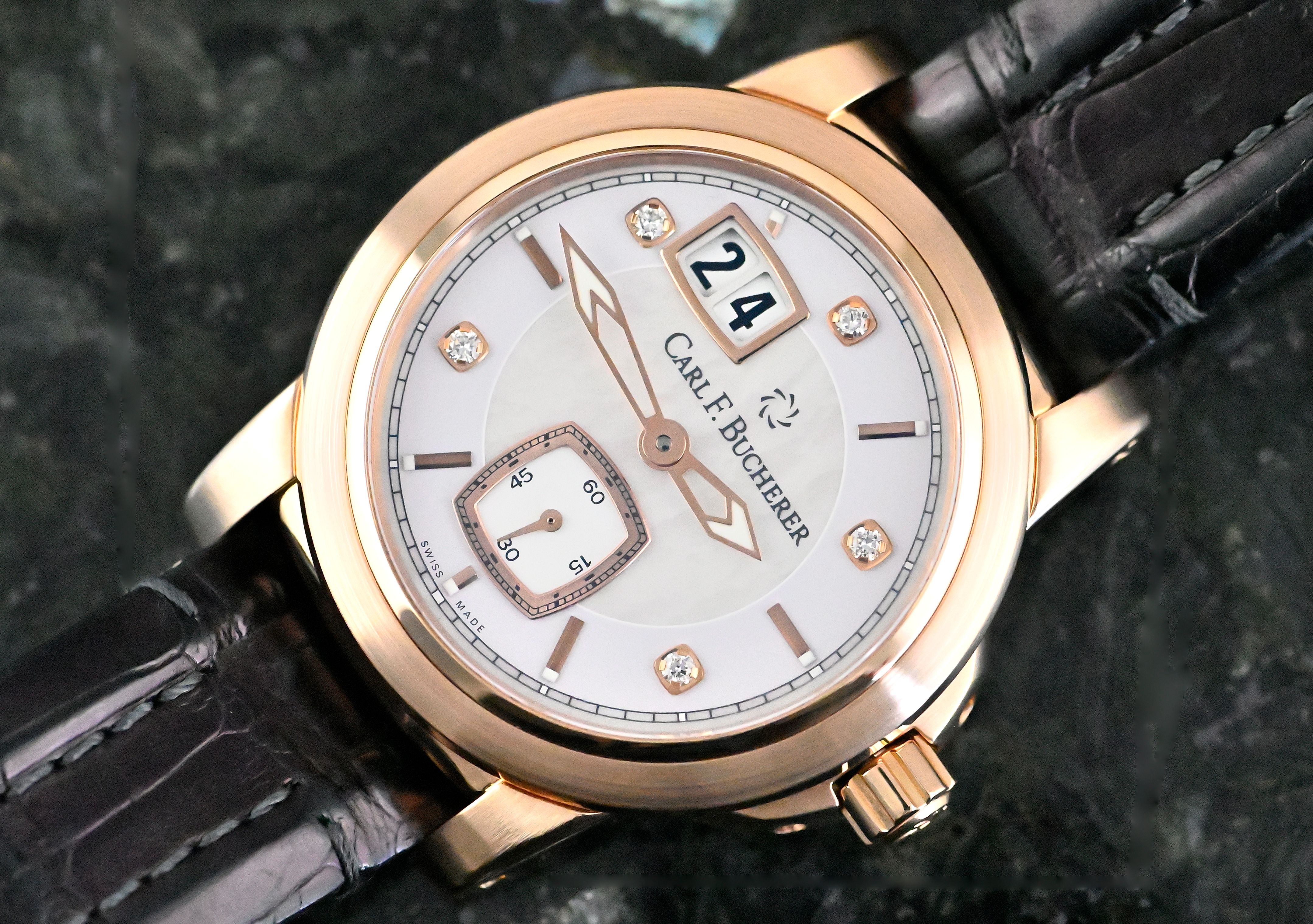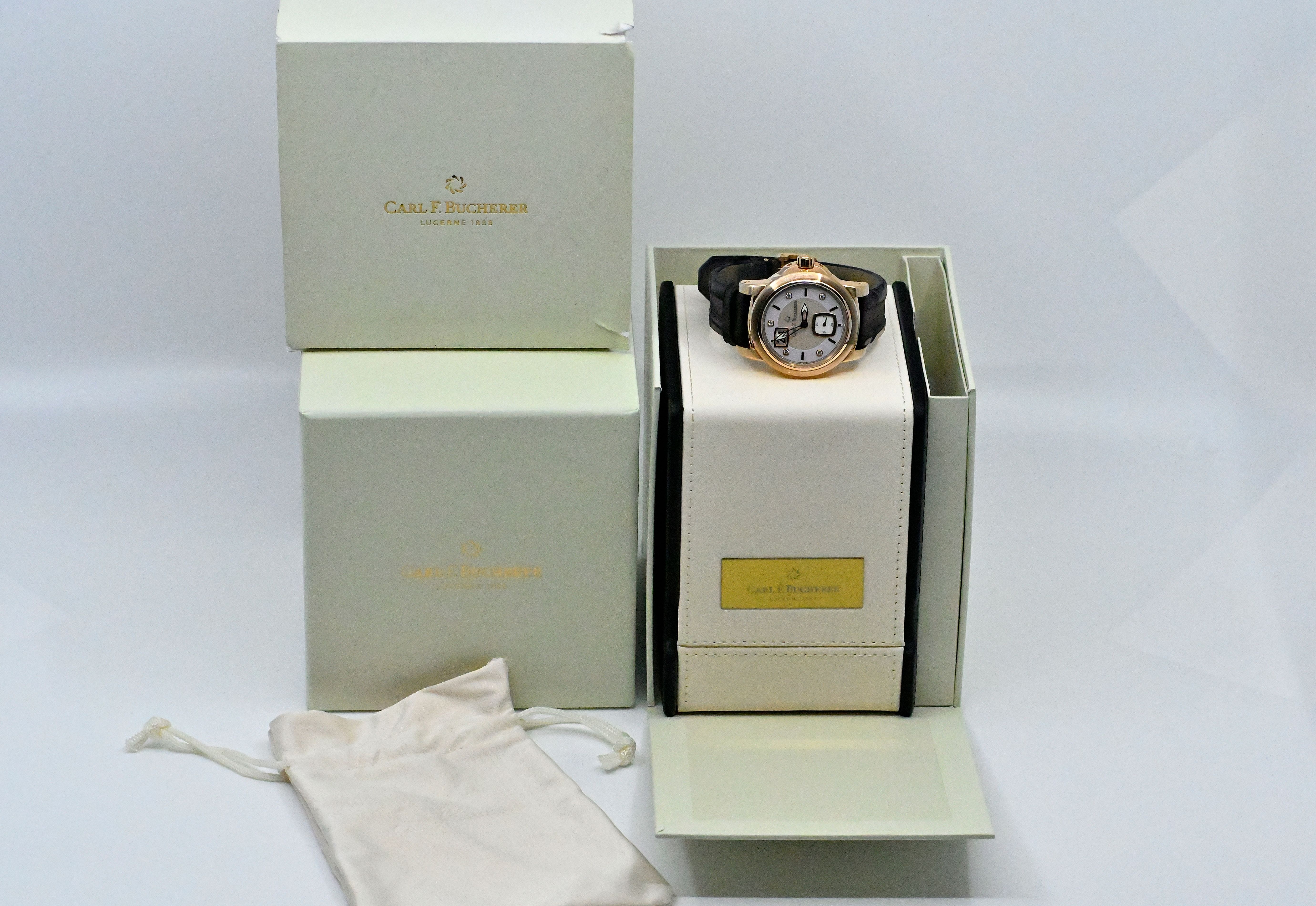 Carl F. Bucherer Patravi Big Date | reference number 10630.03 | in 18k rose gold | Bucherer automatic calibre A1000 with big date display | white dial with mother-of-pearl interior and five diamond indices | diameter of 38 mm | original Bucherer leather strap with original folding clasp in 18k rose gold | very good condition | total weight is approx. 122 grams | enclosed original Bucherer box and outer carton.