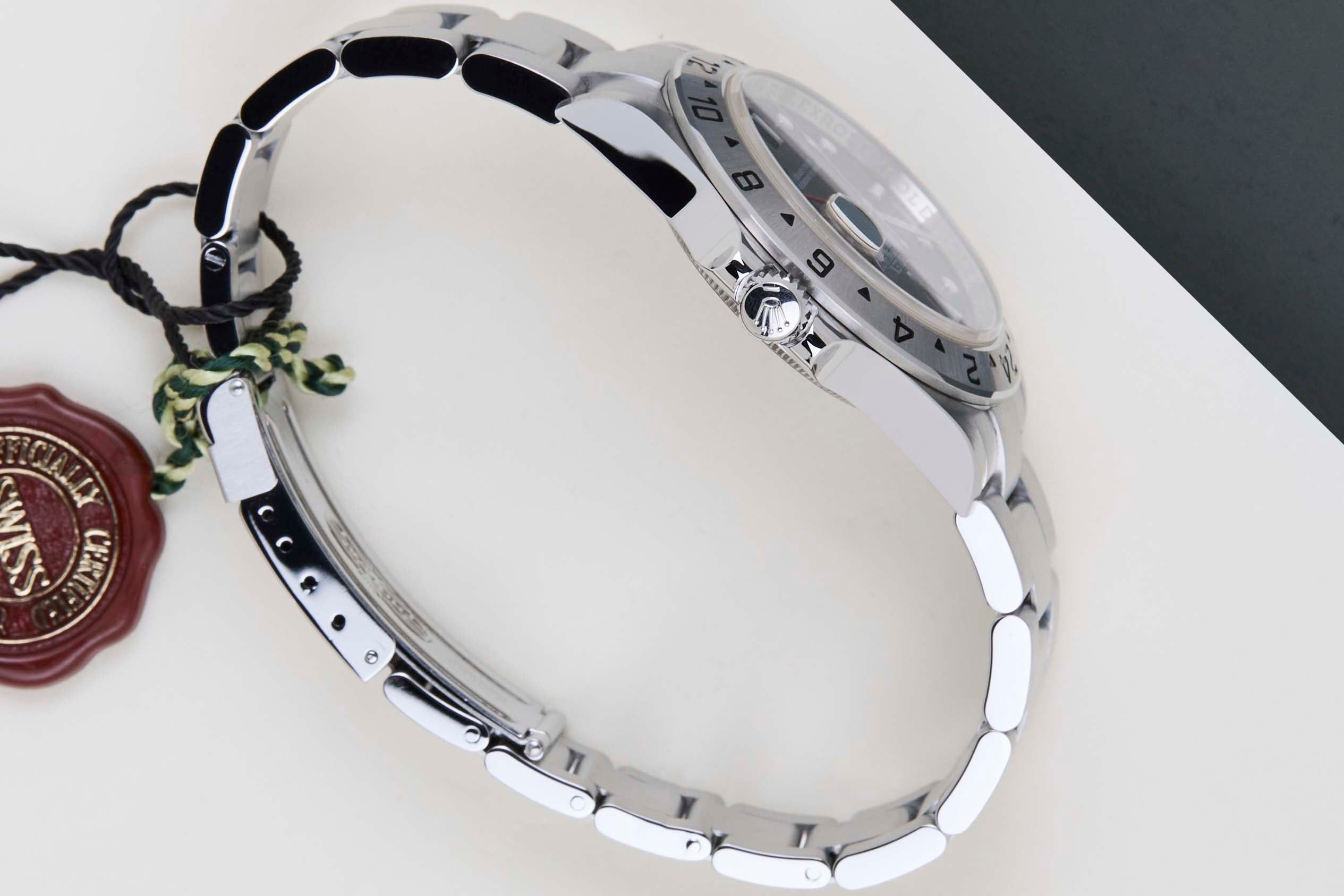 Rolex brachte 1971 die Explorer II heraus, die für Polar-Entdecker, Bergsteiger und Abenteurer konzipiert wurde. Die Explorer II bietet eine Reihe von funktionalen Merkmalen, die sie sehr gut für den Einsatz im Freien geeignet machen. Das ikonischste Element ist die feste Lünette mit einer 24-Stunden-Skala, die extremen Bedingungen standhält. Diese Generation der Rolex Explorer II wurde erstmals 1989 veröffentlicht und 2011 eingestellt. Diese spezielle Rolex Explorer II 'Schwarze Zifferblatt' wurde erstmals im Januar 2014 verkauft, was sie zu einem der letzten Modelle dieser Generation macht, die verkauft wurden.