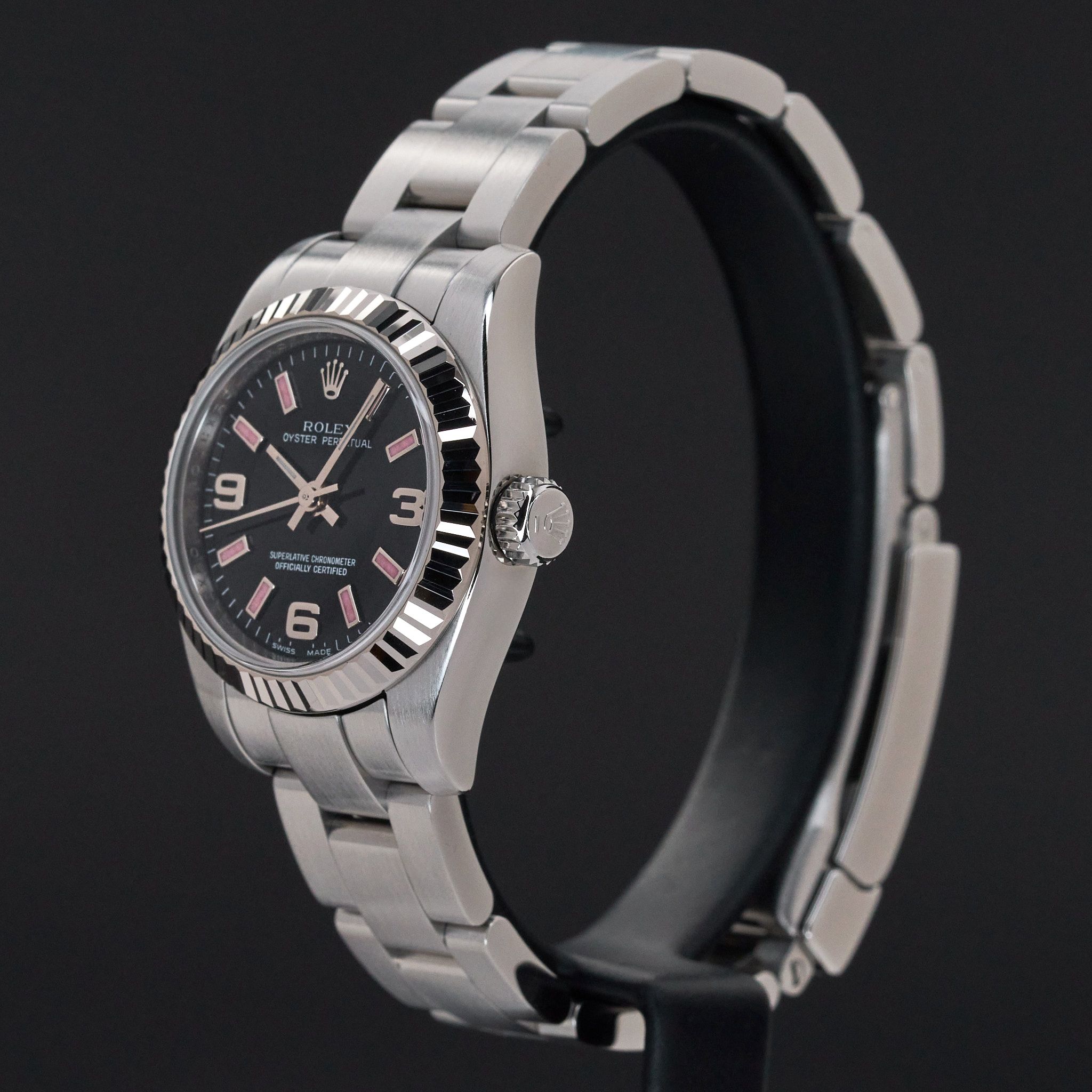 Diese Rolex Oyster Perpetual Lady 176234 verfügt über ein schwarzes arabisches Zifferblatt und ist aus Edelstahl gefertigt, mit einem Produktionsjahr von 2009.