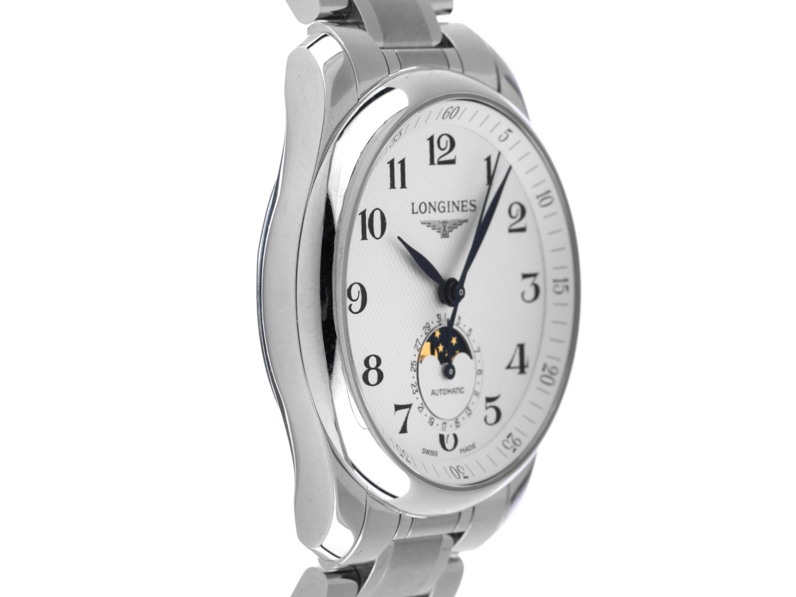 Gehäuse aus poliertem Edelstahl, Gehäusedurchmesser ohne Krone 40mm, Gehäusehöhe 9,6mm. Lünette aus glattem und poliertem Edelstahl. Armband aus poliertem und satiniertem Edelstahl, Sicherheitsfaltschließe aus Edelstahl mit Hersteller-Logo. Zifferblatt in Silber mit arabischen Ziffern und gebläuten Zeigern. Uhrwerk Automatik, Kaliber Longines L899 mit 21 Edelsteinen, Gangreserve ca. 72 Stunden. Anzeige von Stunde, Minute und Sekunde über Zeiger aus der Mitte mit Sekundenstopp zur sekundengenauen Einstellung der Uhrzeit, Datumsanzeige mit Schnellverstellung bei 6 Uhr, Datums- und Mondphasenanzeige bei 6 Uhr. Saphirglas kratzfest. Geriffelte Krone mit Hersteller-Logo. Boden aus Edelstahl graviert mit Saphirglas-Sichtfenster. Gewicht der Uhr inklusive Armband 156g, Länge des Armbandes inklusive Gehäuse 220mm. Wasserdicht bis 3 ATM. Referenznummer: L2.909.4.78.6, ID: ST610233601125H-2800, Artikelnummer: 10000083520. Original Longines Box mit Umkarton und Garantieunterlagen von 2025, Full Set. Ungetragen. Lieferzeit sofort.