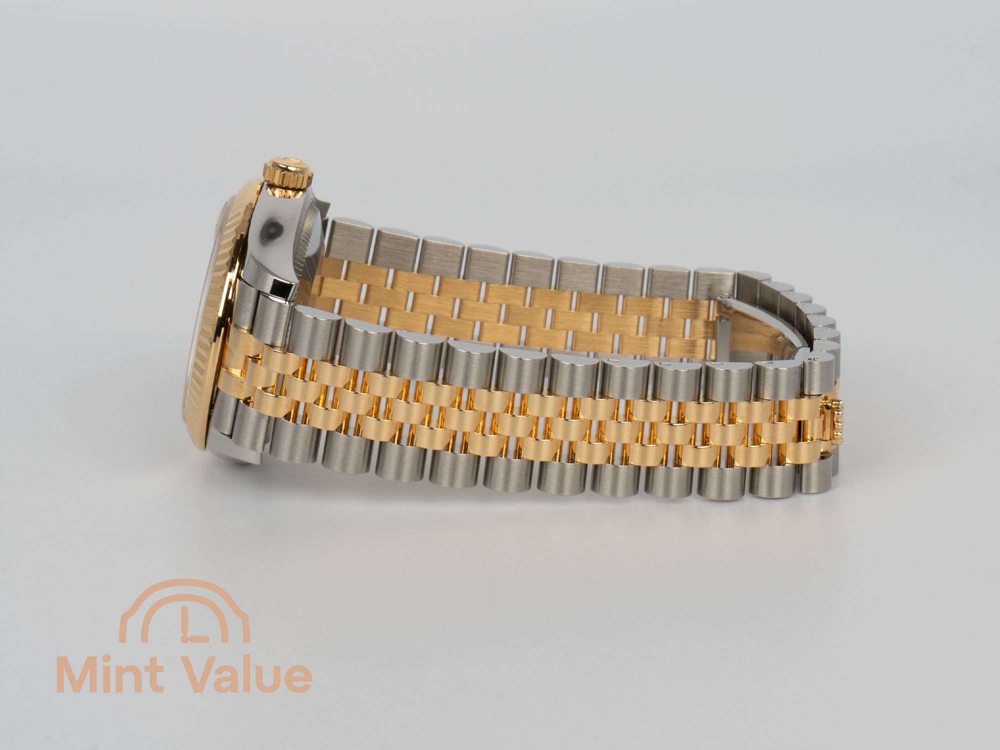 The combination of steel and yellow gold has been a cornerstone of the Datejust identity since the 1940s. The fluted bezel in solid 18 ct gold, paired with the Jubilee bracelet, creates an instantly recognizable silhouette that epitomizes Rolex heritage.