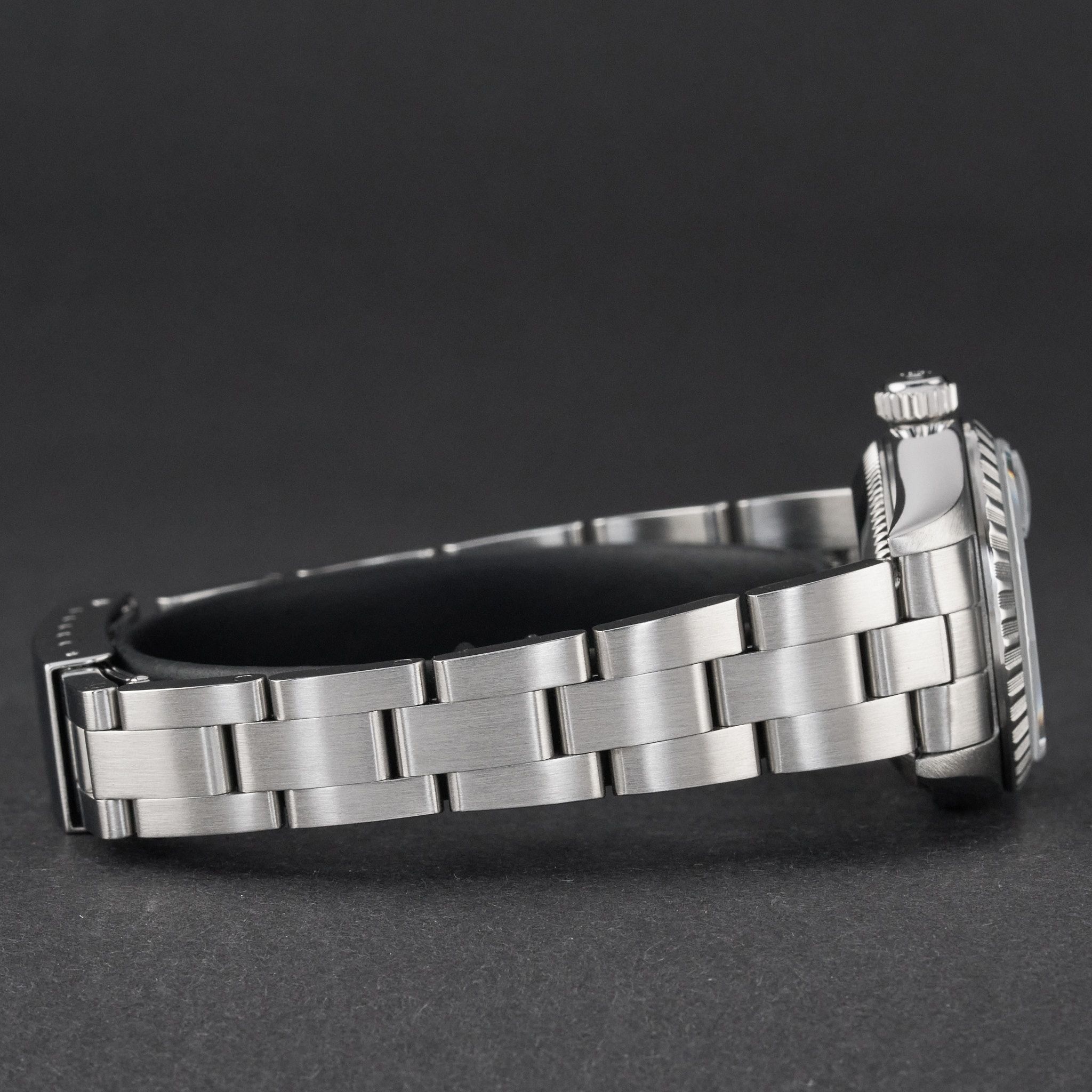 Diese Rolex Oyster Perpetual Lady Date 79240 verfügt über eine schwarze Zifferblatt und ist aus Edelstahl gefertigt, mit einem Produktionsjahr von 2001.