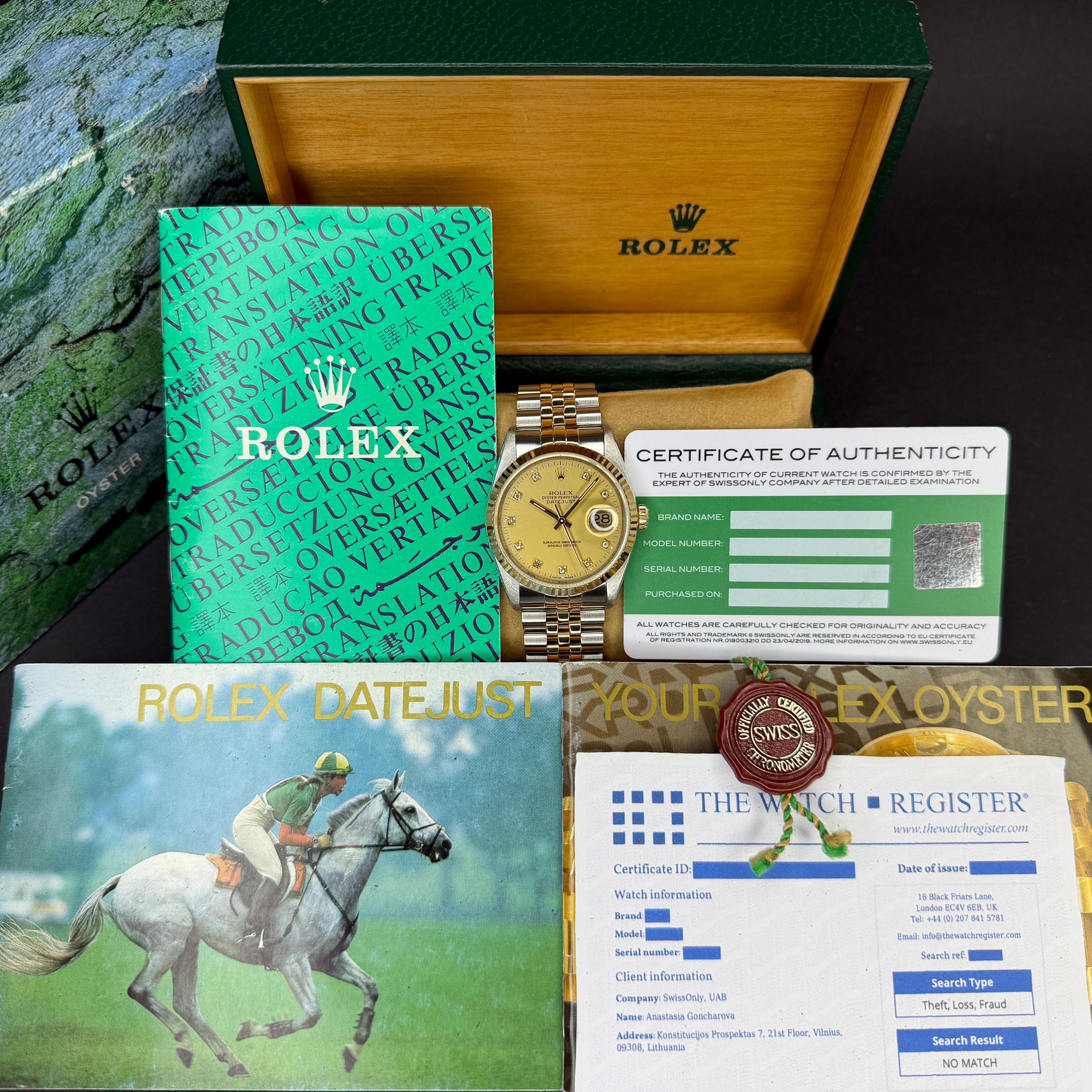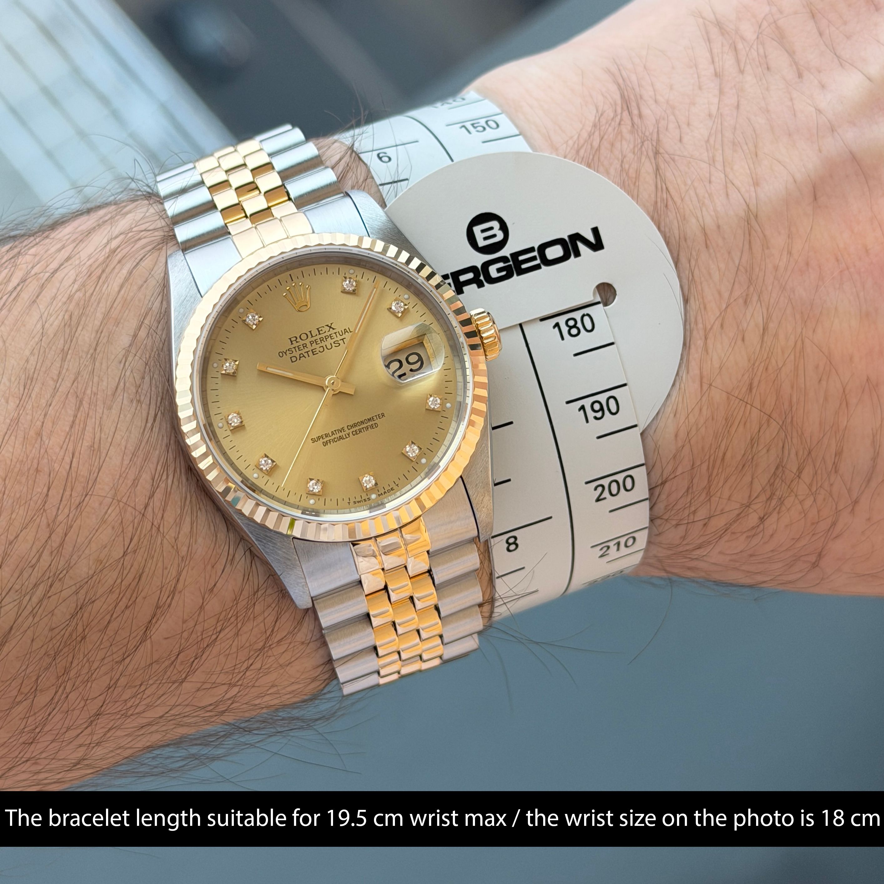 This Rolex Datejust 16233 features a Champagne small diamond dial and is crafted from 18K yellow gold and stainless steel, with a production year of 1991.Case No: X42XXXX