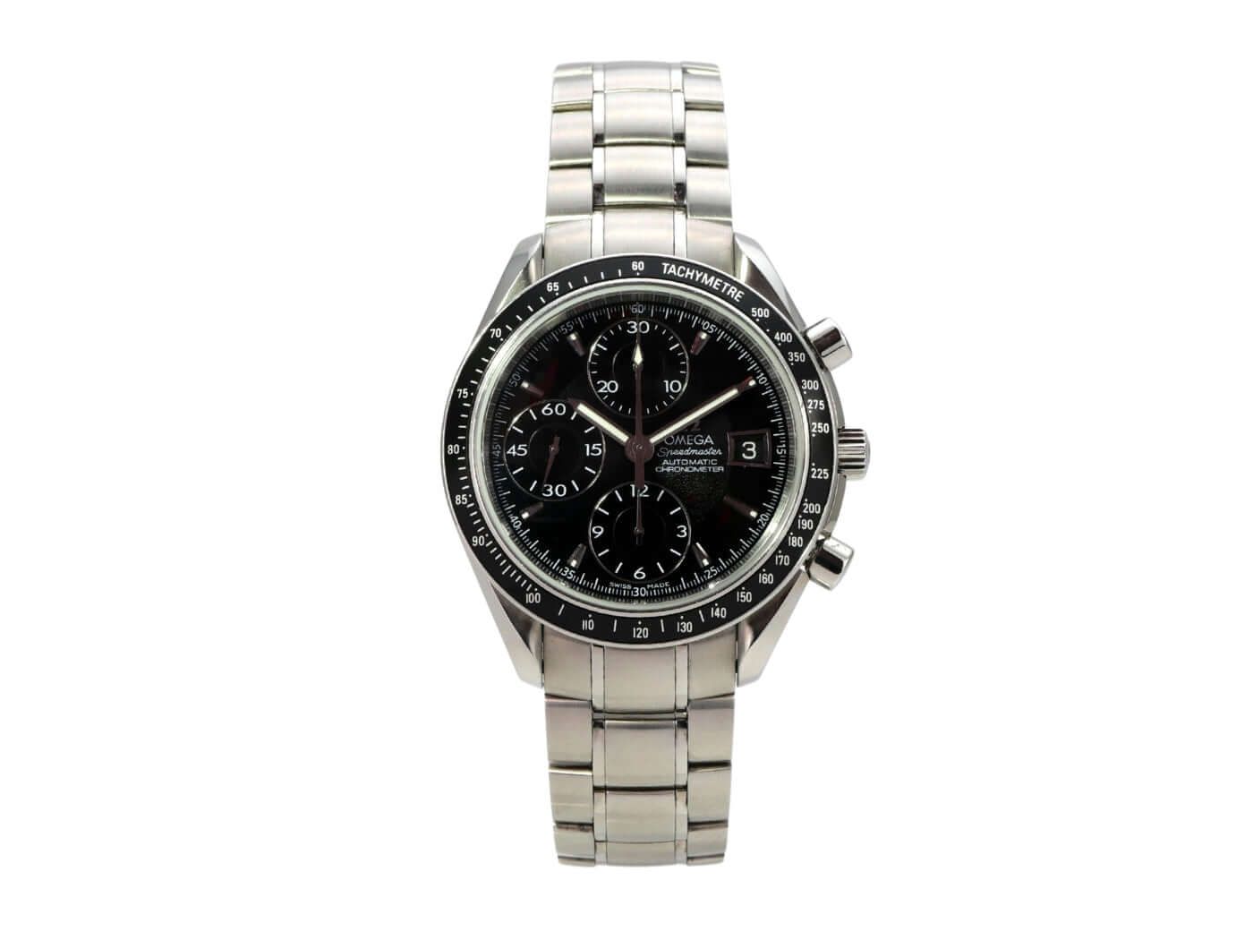 OMEGA Speedmaster Date Ref. 3210.50.00 from 2011Case made of polished and satin-finished stainless steel, case diameter 40 mm, stainless steel bezel with black tachymeter scale, polished and satin-finished stainless steel bracelet with safety folding clasp, black dial with applied luminous indices, luminous hands, automatic movement, chronometer with certificate, caliber Omega 1164, 28,800 A/h, power reserve approx. 44 hours, date display, scratch-resistant sapphire crystal, double-sided anti-reflective coating, screwed and engraved stainless steel back, water-resistant up to 10 bar.Used watch, very good condition, complete with box and papers, delivered in 2011.