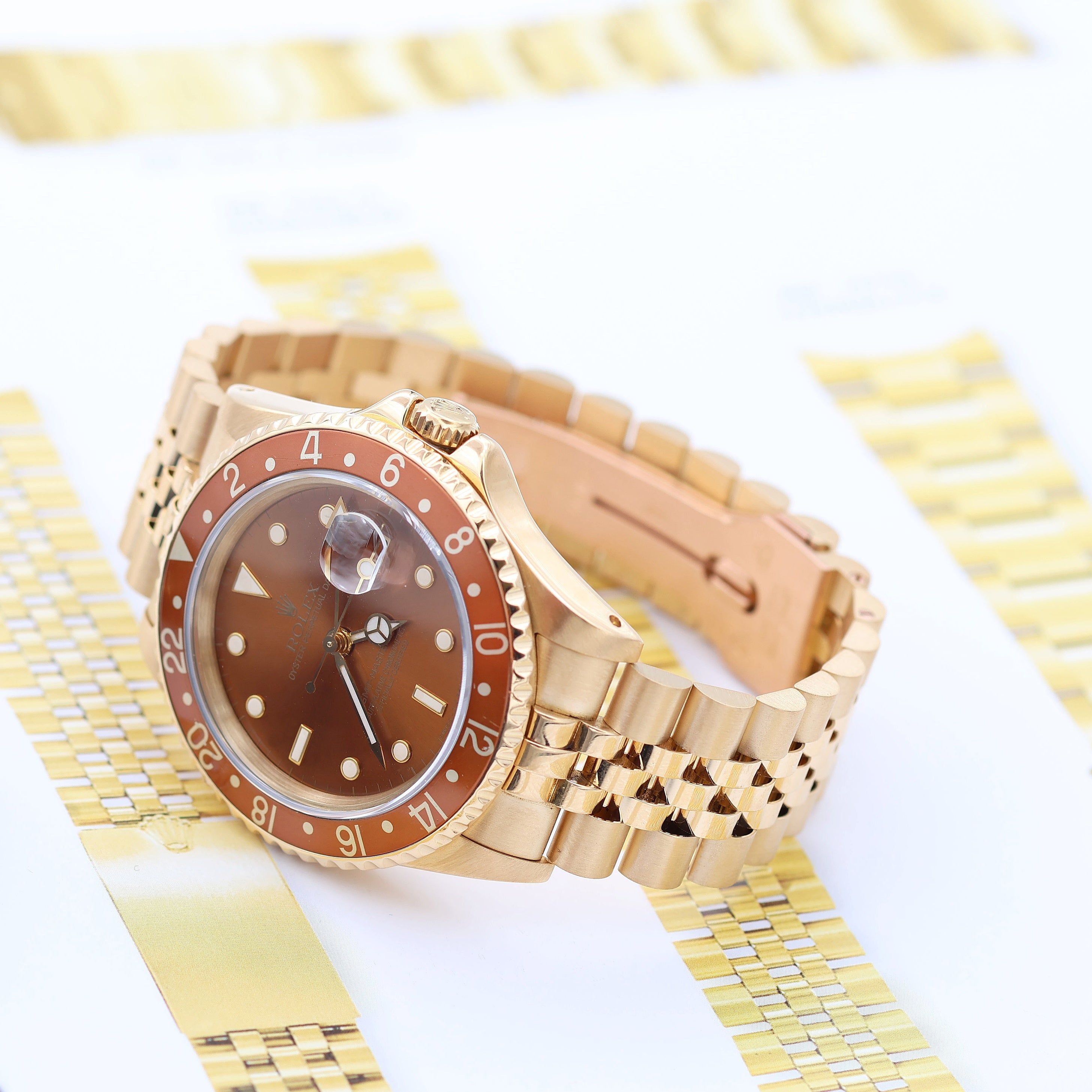 For sale at Debonar Watches: pre-owned Rolex GMT Master II ref. 16718, in good conditions, only watch. This Rolex GMT-Master reference 16718 with the tiger-eye dial is one of the most distinctive and collectible variations of the GMT-Master line. Crafted in solid 18k yellow gold, the 16718 was produced during the 1990s and early 2000s, but the tiger-eye dial variant is far rarer and was made in very limited numbers, giving it a strong presence among collectors. The standout feature is its tiger-eye dial, a natural semiprecious stone known for its striking chatoyancy, where bands of golden brown and deep caramel tones shift depending on how the light hits the surface. Because each stone is unique, no two dials are exactly the same, giving every watch its own character. The warm hues of the tiger-eye dial pair elegantly with the watch’s polished 18k yellow gold case and bezel, creating a luxurious and visually rich aesthetic that stands apart from more traditional GMT-Master configurations. The watch retains the classic design language of the GMT-Master line: a 40 mm Oyster case, a sapphire crystal with Cyclops lens over the date, and the iconic 24-hour rotating bezel that allows the wearer to track a second time zone. Inside ticks the reliable automatic caliber 3185 (or, in earlier pieces, the 3186), offering smooth GMT functionality and dependable chronometer-certified accuracy. Combined with its precious-metal construction, unique natural-stone dial, and relatively limited production, the Rolex 16718 with tiger-eye dial has become a coveted and distinctive piece, valued for its rarity, its warm and captivating aesthetics, and its place as one of the more unusual variants in the GMT-Master lineage. BRAND ROLEX MODEL GMT MASTER II REFERENCE 16718 CASE MATERIAL YELLOW GOLD MOVEMENT AUTOMATIC DIMENSION 40 MM DIAL BROWN BEZEL YELLOW GOLD CRYSTAL SAPPHIRE BRACELET TYPE BRACELET BRACELET MATERIAL YELLOW GOLD BRACELET LENGHT 16 CM ORIGINAL BOX NO ORIGINAL PAPERS NO YEAR APPROX. THE '90s CONDITION VERY GOOD