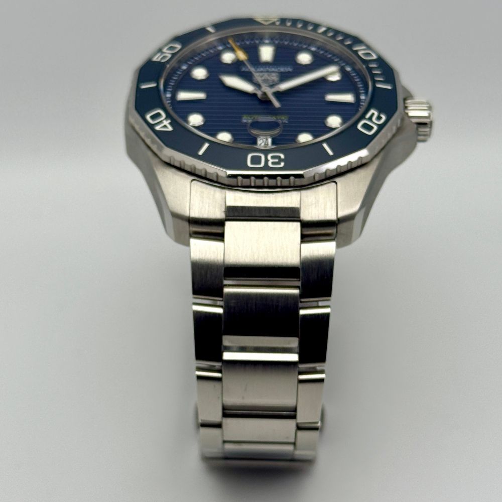 Tag Heuer Aquaracer 300M Automatic. Powered by the Calibre 5 automatic movement, the new TAG Heuer Aquaracer shows a blue sunray brushed dial and offers water resistance up to 300 meters. A true diving watch, built to endure any conditions, any day. A vibrant blue unidirectional ceramic bezel with 12 facets matches the case and dial elements, with a 60-minute scale to measure elapsed dive time. The new 43mm case in steel combines brushed and polished surfaces, offering sharp geometry and rugged looks in a slimmer profile for extreme comfort. Pressure-proof, the tapered steel bracelet is secured with two safety push buttons on the buckle, with a fine adjustment system for serious divers.This Aquaracer comes as a full set in near mint condition. 1 year warranty. We are proud to offer a two-year warranty on every Rolex watch offered by us. Other brands come with a one-year warranty unless otherwise mentioned. The warranty includes the functioning of the watch including the functioning of any present complications. Excluded from the warranty are: water damage, turn and push buttons, crystal, watch strap and clasp.