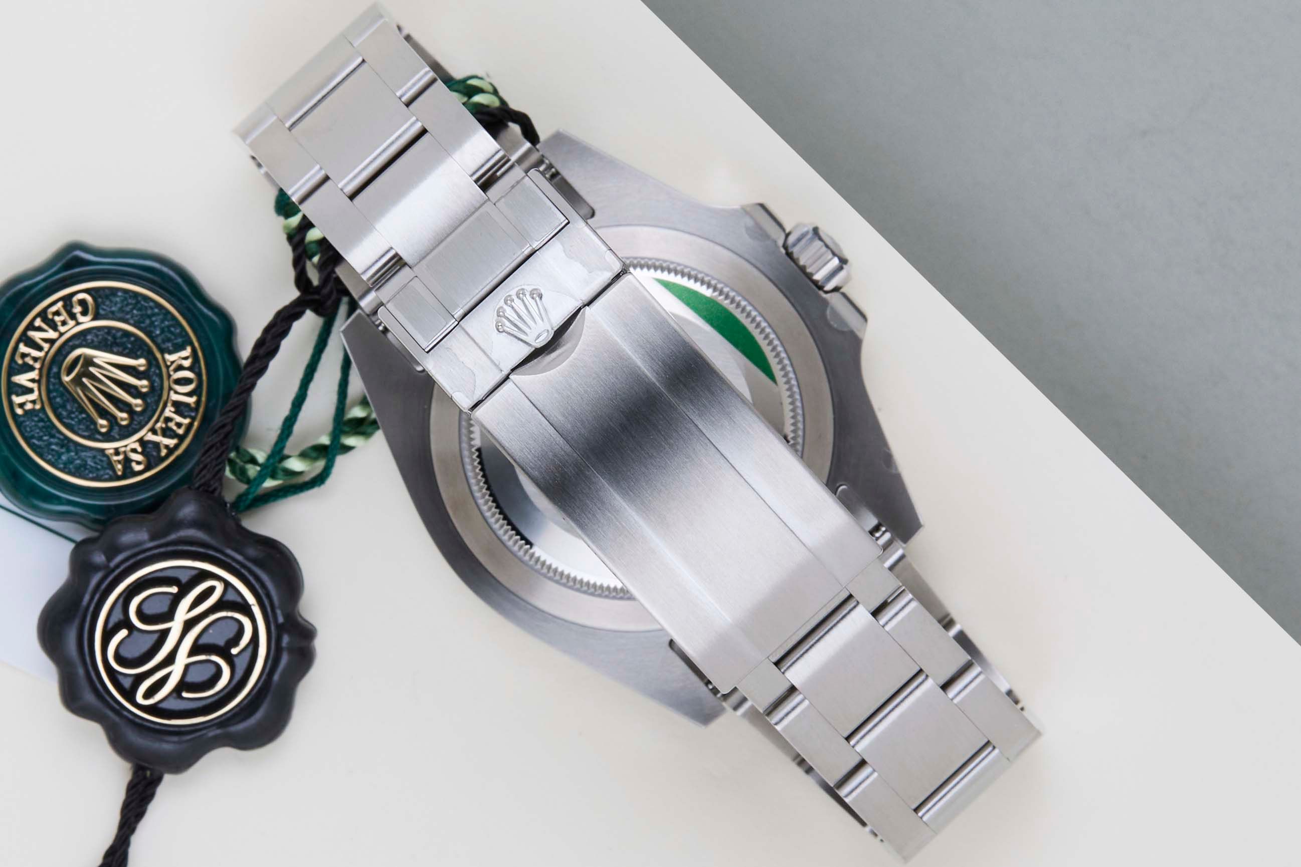Die Uhr besteht vollständig aus Edelstahl. Rolex verwendet 904L in seinen Stahluhren, das ist eine extrem widerstandsfähige und hochpolierbare Superlegierung. Diese Rolex ist mit einem Chromalight-Zifferblatt ausgestattet, das durch die blaue Leuchtkraft erkennbar ist.