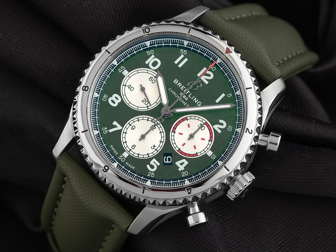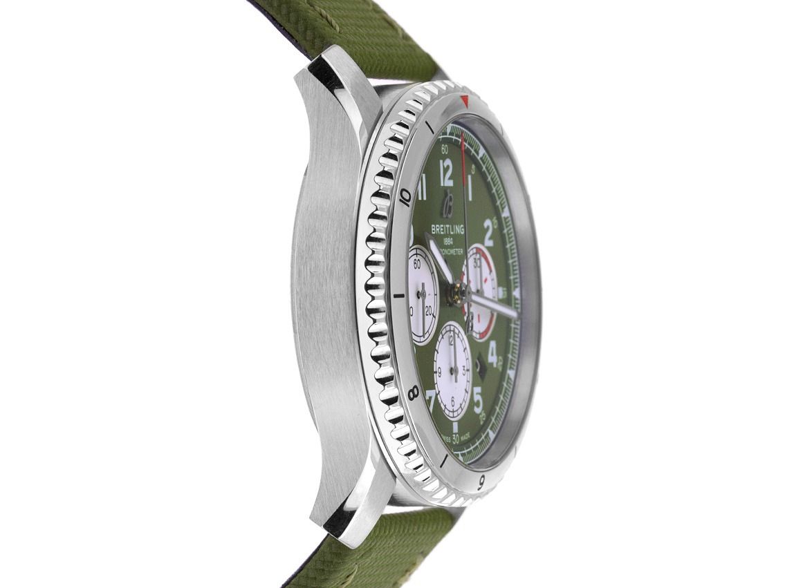 Gehäuse aus satiniertem Edelstahl, Gehäusedurchmesser ohne Krone 43mm, Gehäusehöhe 14,2mm. Lünette aus Edelstahl mit Riffelung und 12-Stunden Skala, beidseitig drehbar. Armband aus militärgrünem Kautschuk mit Ziernaht, Anstoßbreite 23mm, Sicherheitsfaltschließe aus Edelstahl mit Hersteller-Logo. Zifferblatt in militärgrün mit weißen arabischen Ziffern und Zeigern aus Edelstahl. Uhrwerk Automatik, Chronograph, Chronometer, Breitling Manufakturkaliber 01 mit 47 Edelsteinen. Anzeige von Stunde und Minute über zentrale Zeiger, kleine Sekunde mit Sekundenstopp zur sekundengenauen Einstellung der Uhrzeit bei 9 Uhr, Datumsanzeige mit Schnellverstellung zwischen 4 und 5 Uhr. Saphirglas kratzfest. Verschraubbare Krone mit Hersteller-Logo. Boden aus Edelstahl, verschraubt und graviert mit Saphirglas Sichtfenster. Gewicht der Uhr inklusive Armband 123g. Referenznummer: AB01192A1L1A1, Gehäusenummer: 3263XXX, ID: P201272001125H-7200, Artikelnummer: 10000083446. Original Breitling Box und Watchregister Auszug von Dezember 2025, The Watch Register Zertifikat / ohne Eintrag (Internationale Datenbank für verlorene oder gestohlene Uhren). Superschnäppchen, Kapitalanlage mit Wertsteigerungspotential, sehr seltenes Sammlerstück, fast nicht getragen. Wie Neu. Lieferzeit sofort.