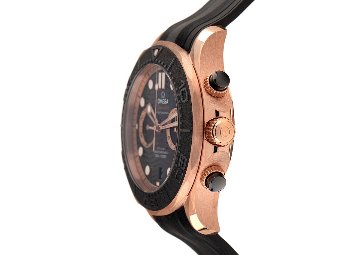 Omega Seamaster Diver 300m Co-Axial Master Chronometer Sedna™-Gold Keramik Automatik Chronograph Armband KautschukGehäuse 18kt Sedna™-Gold poliert und satiniert, Gehäusedurchmesser ohne Krone 44mm, Gehäusehöhe 17,6mm. Lünette 18kt Sedna™-Gold mit schwarzem Keramik Inlay, 60-Minuten Skala und Leuchtpunkt, einseitig drehbar. Heliumventil bei 10 Uhr. Armband Kautschuk schwarz, Anstoßbreite 20mm, Stiftschließe 18kt Sedna™-Gold mit Hersteller-Logo. Zifferblatt schwarz mit lasergraviertem Wellen-Muster, aufgesetzten Leuchtindexen und Leuchtpunkten sowie skelettierten 18kt Sedna™-Gold Leuchtzeigern. Uhrwerk Automatik, Chronometer mit Zeugnis, Omega Manufakturkaliber 9901 mit 54 Edelsteinen. Anzeige von Stunde und Minute über Zeiger aus der Mitte, kleine Sekunde mit Sekundenstopp zur sekundengenauen Einstellung der Uhrzeit bei 9 Uhr, Datumsanzeige mit Schnellverstellung bei 6 Uhr. Saphirglas kratzfest, doppelseitig entspiegelt und gewölbt. Krone verschraubbar mit Flankenschutz und Hersteller-Logo. Boden 18kt Sedna™-Gold verschraubt und graviert mit Saphirglas Sichtfenster. Gewicht der Uhr inklusive Armband 188g. Wasserdicht bis 30 ATM. Referenznummer: 210.62.44.51.01.001, ID: P2077380001225H-37300, Artikelnummer: 10000083689. Original Omega Box mit Umkarton und Garantie Papiere von Juli 2022 sowie Beschreibung, Full Set. Ungetragen. Lieferzeit sofort.