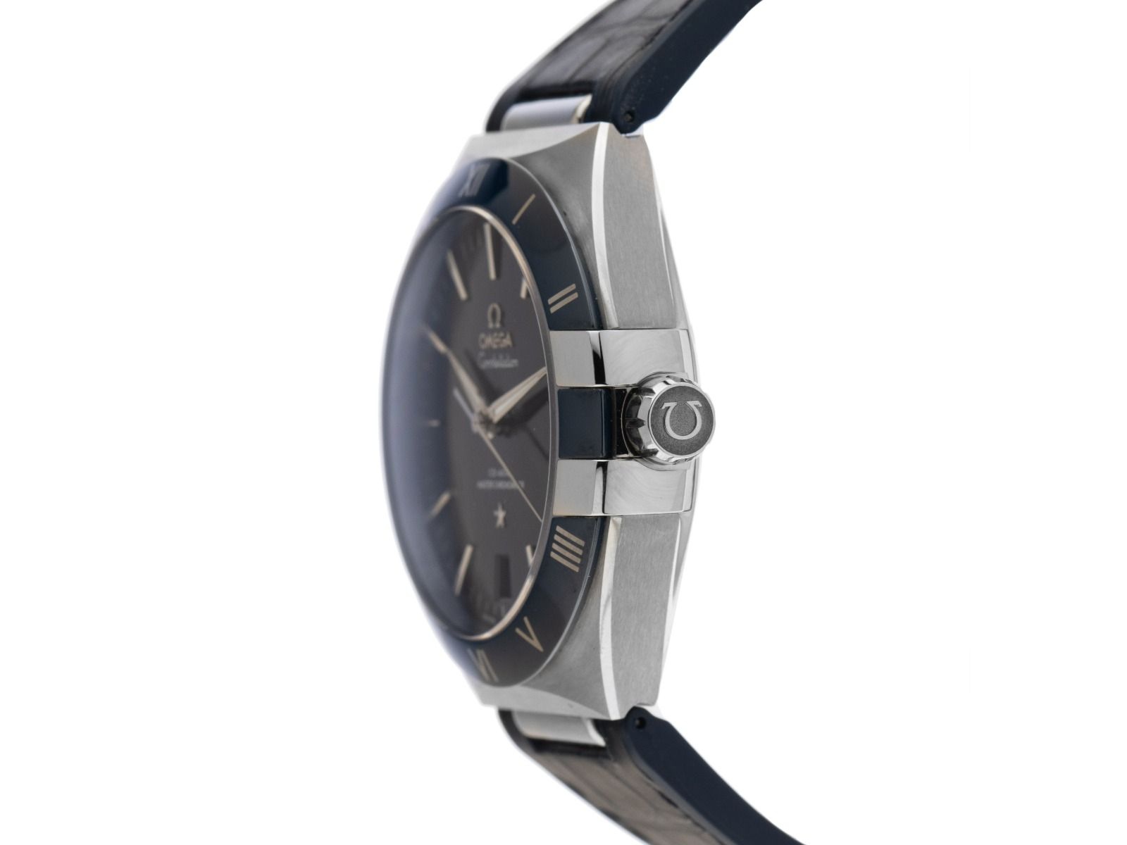 Omega Constellation Co-Axial Master Chronometer Stahl Keramik Automatik Armband Krokoleder Kautschuk FaltschließeGehäuse Edelstahl poliert und satiniert, Gehäusedurchmesser ohne Krone 41mm, Gehäusehöhe 13,5mm. Lünette Keramik blau mit römischen 12-Stunden-Skala aus OMEGA Liquidmetal™. Armband Krokoleder blau mit Ziernaht, Innenseite Kautschuk, Anstoßbreite 24mm, Sicherheitsfaltschließe Edelstahl mit Hersteller-Logo. Zifferblatt blau mit aufgesetzten rhodinierten Indexen und rhodinierten Leuchtzeigern. Uhrwerk Automatik, Chronometer mit Zeugnis, Co-Axial Hemmung, Omega Manufakturkaliber 8900 mit 39 Edelsteinen, Gangreserve ca. 60 Stunden. Anzeige von Stunde, Minute und Sekunde über Zeiger aus der Mitte mit Sekundenstop zur sekundengenauen Einstellung der Uhrzeit, Datumsanzeige mit Schnellverstellung bei 6 Uhr. Saphirglas kratzfest, gewölbt und entspiegelt. Krone mit Hersteller-Logo. Boden Edelstahl verschraubt und graviert mit Saphirglas Sichtfenster. Gewicht der Uhr inklusive Armband 109g. Wasserdicht bis 5 ATM. Referenznummer: 131.33.41.21.03.001, ID: ST1160109041125H-7700, Artikelnummer: 10000083263. Original Omega Box mit Umkarton und Garantie Papiere von Oktober 2025 sowie Beschreibung, Full Set. Ungetragen. Lieferzeit sofort.