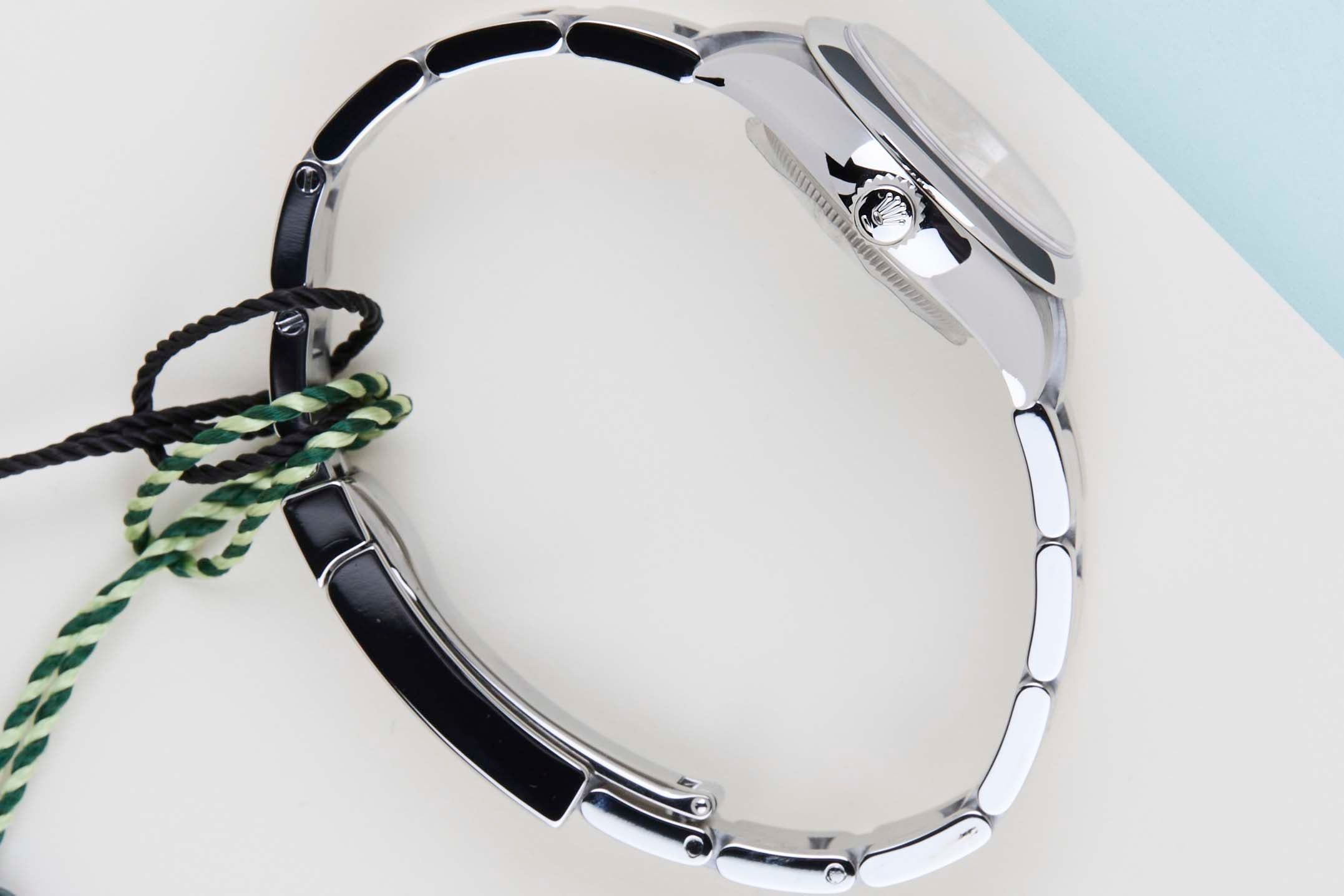 Diese Rolex Oyster Perpetual 28 ist in neuwertigem Zustand und kommt mit der originalen Rolex-Garantiekarte und der Box. Darüber hinaus hat die Uhr noch eine internationale Rolex-Garantie bis Oktober 2026.