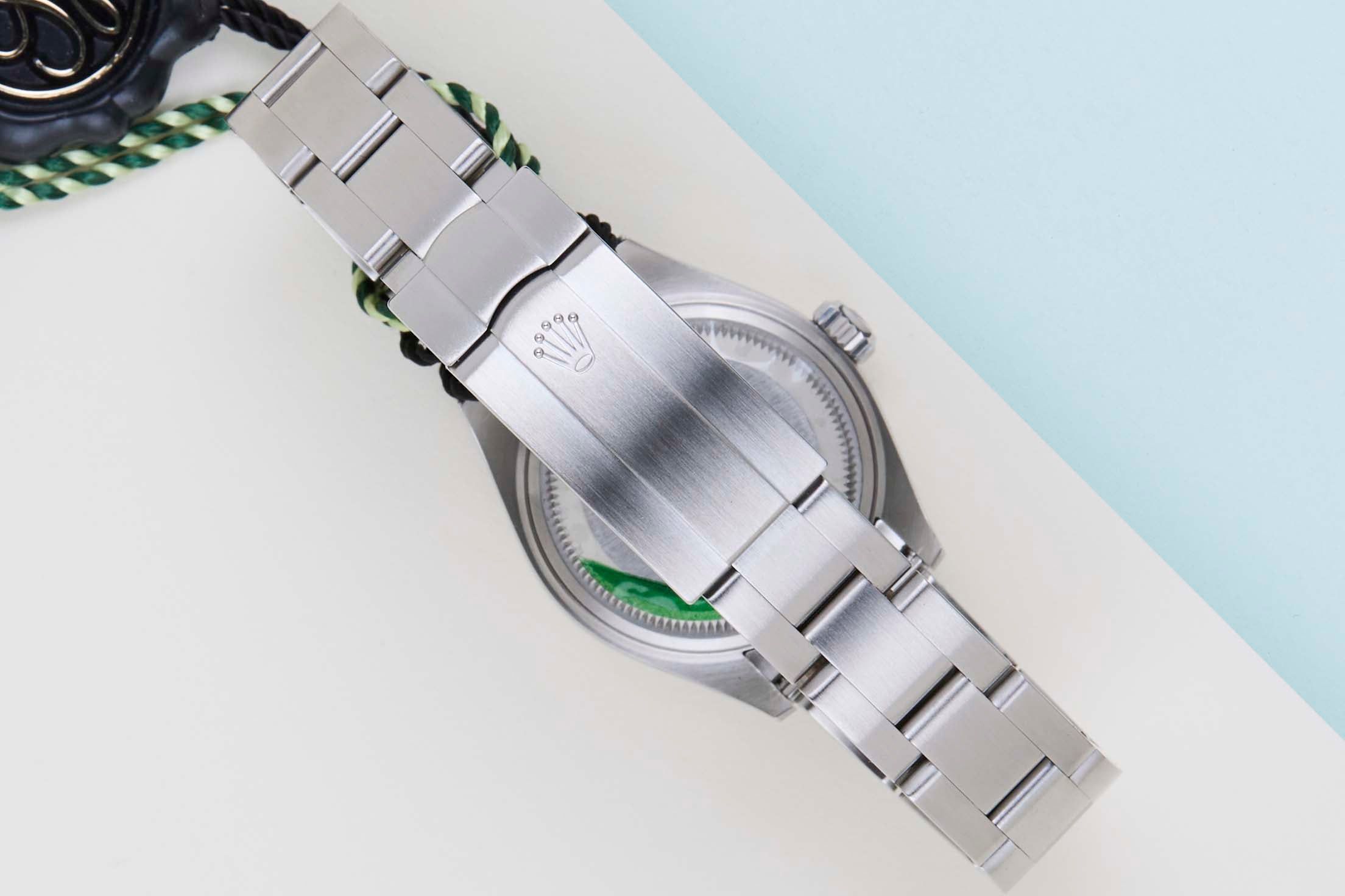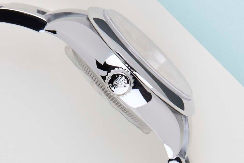 Diese Rolex Oyster Perpetual 28 'Pink Dial' wurde erstmals im Oktober 2021 verkauft. Die Uhr besteht vollständig aus Edelstahl. Rolex verwendet 904L in seinen Stahluhren, das ist eine extrem widerstandsfähige und hochpolierbare Superlegierung.