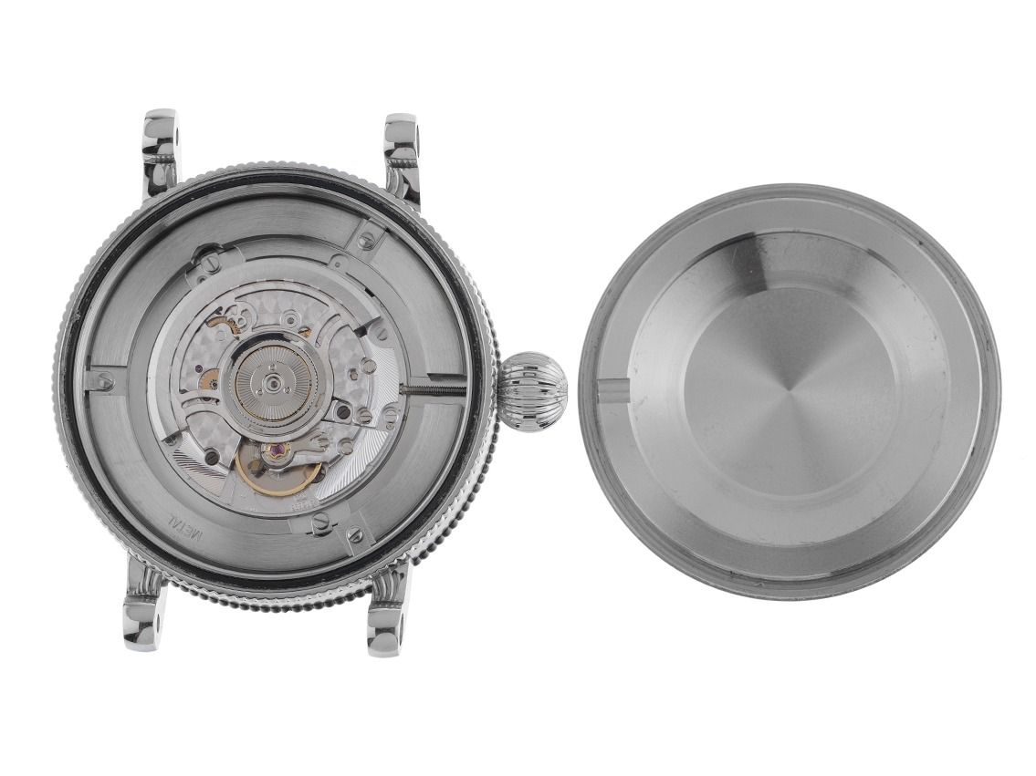Gehäuse aus poliertem und satiniertem Edelstahl, Gehäusedurchmesser ohne Krone 44mm, Gehäusehöhe 14,9mm. Lünette aus Edelstahl mit schwarzem Inlay und 60-Minuten Skala. Armband aus schwarzem Kautschuk mit heller Ziernaht, Anstoßbreite 21mm, Sicherheitsfaltschließe aus Edelstahl mit Hersteller-Logo. Zifferblatt schwarz mit arabischen Ziffern und Indexen sowie weißen Zeigern. Uhrwerk Automatik, Kaliber 2892A2. Anzeige von Stunde, Minute und Sekunde über Zeiger aus der Mitte mit Sekundenstopp zur sekundengenauen Einstellung der Uhrzeit, Datumsanzeige mit Schnellverstellung bei 12 Uhr, Wochentagsanzeige bei 6 Uhr. Saphirglas kratzfest. Große Zwiebelkrone. Boden aus Edelstahl verschraubt und graviert. Gewicht der Uhr inklusive Armband 147g. Referenznummer: CH 8143B, Gehäusenummer: 1EXXX, ID: P207040001225H-5800, Artikelnummer: 10000083669. Mit Gangkontrolle und kompletter äußerlicher Aufarbeitung von Dezember 2025. Original Chronoswiss Box mit Umkarton und Garantie-Papiere von Dezember 2016, Beschreibung sowie Watchregister Auszug von Dezember 2025, The Watch Register Zertifikat / ohne Eintrag (Internationale Datenbank für verlorene oder gestohlene Uhren), Full Set. Superschnäppchen. Wie Neu. Lieferzeit sofort.