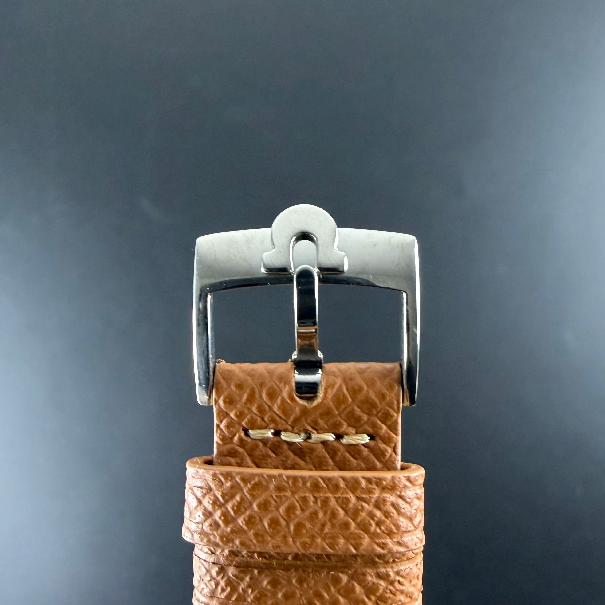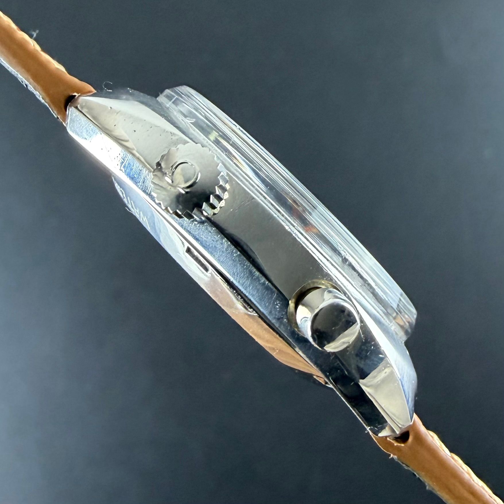 Das Gehäuse aus Edelstahl ist mit einem braunen Kalbslederarmband kombiniert. Die Uhr ist bis auf das neu ersetzte Armband vollständig original und ihr Gesamtzustand ist gut.