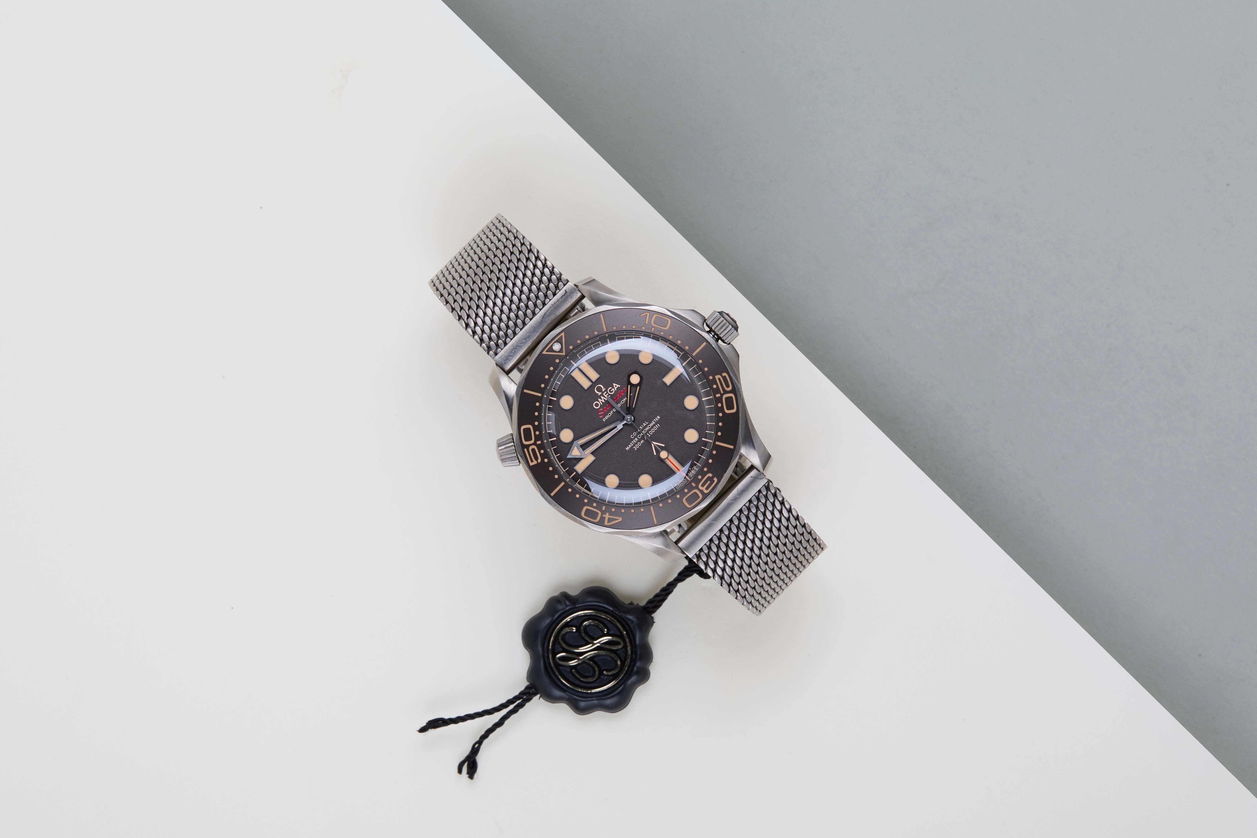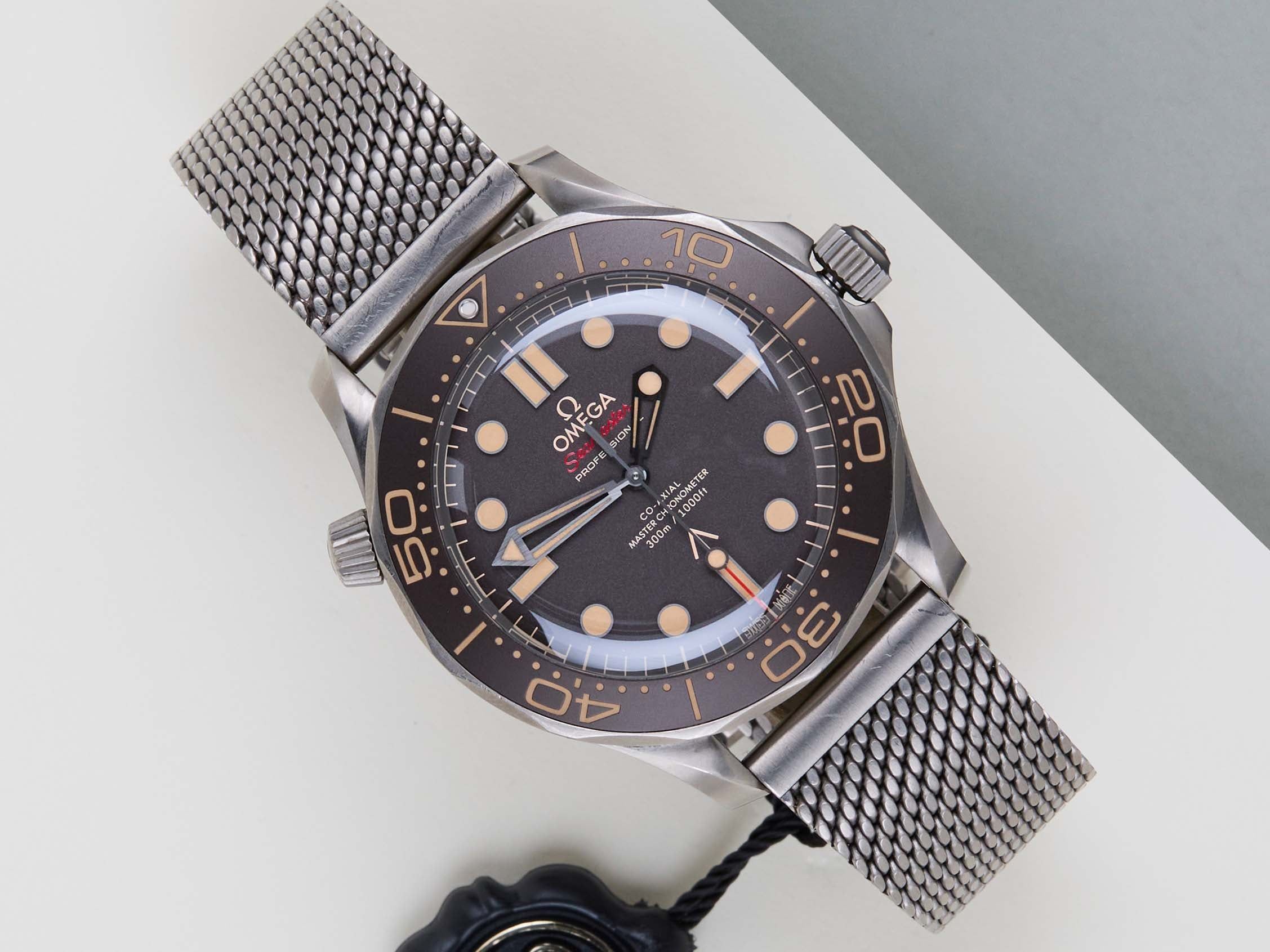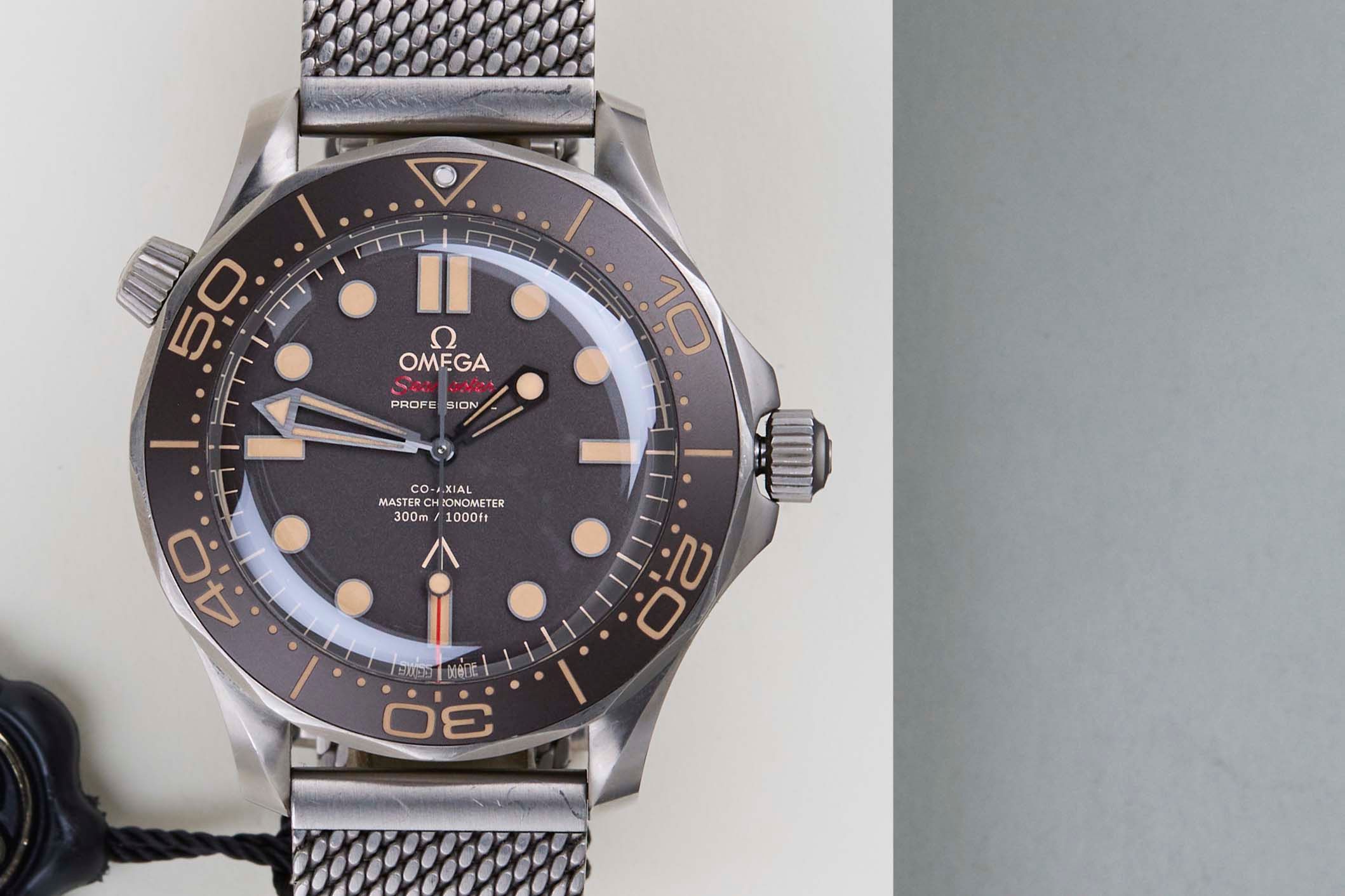 Full Set | Including both Original Omega Titanium and Nato strapIdentical to 007's watch in No Time To Die this 42mm Seamaster, in strong yet light Grade 2 Titanium, sports a brown tropical aluminium bezel ring and dial.Slightly slimmer than the standard Diver 300M models thanks to the doming of the sapphire-crystal glass. The 007-edition Diver is powered by OMEGA's Co-Axial Master Chronometer 8806, which has achieved the industry’s highest standards of precision, chronometric performance - and of course - magnetic resistance.This Omega is in Mint condition and comes with the original Omega Warranty Papers and Box. Furthermore, the watch has been checked by our watchmaker, and therefore it comes with one year of Steiner warranty.