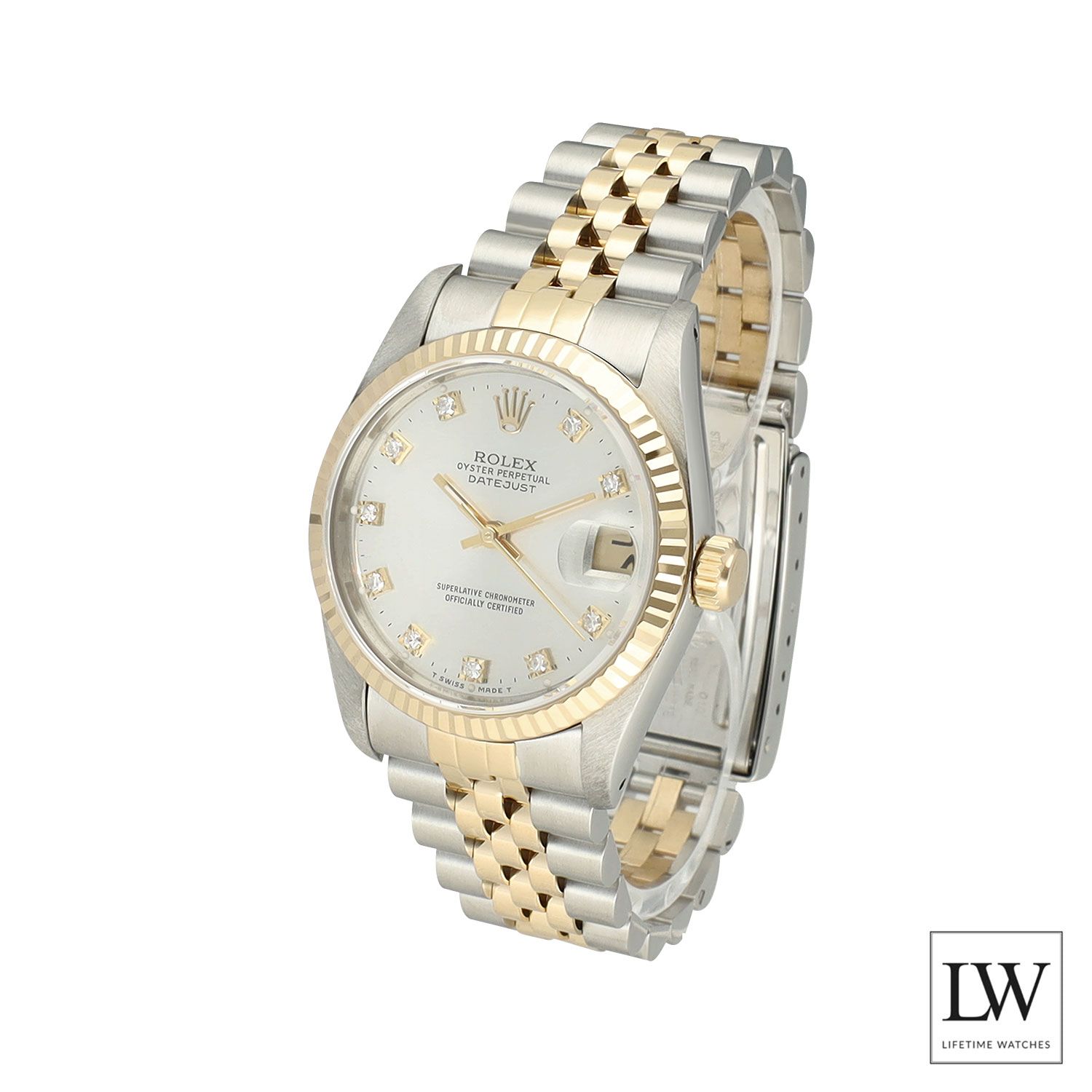 The Rolex Datejust 31 with reference 68273 from 1990 is offered as a Full Set, including the original box and papers. This elegant configuration features a refined silver dial with diamond hour markers, adding a subtle yet luxurious sparkle that perfectly complements the timeless two-tone design.This watch is in excellent overall condition, with both the case and bracelet showing careful wear consistent with age. The 31 mm case is crafted from Oystersteel and 18-carat yellow gold, fitted with a classic yellow gold fluted bezel, and paired with the iconic two-tone Jubilee bracelet for exceptional comfort and style. Powered by the automatic Rolex caliber 2135, this Datejust offers reliable and precise timekeeping, a quickset date function, and approximately 42 hours of power reserve.