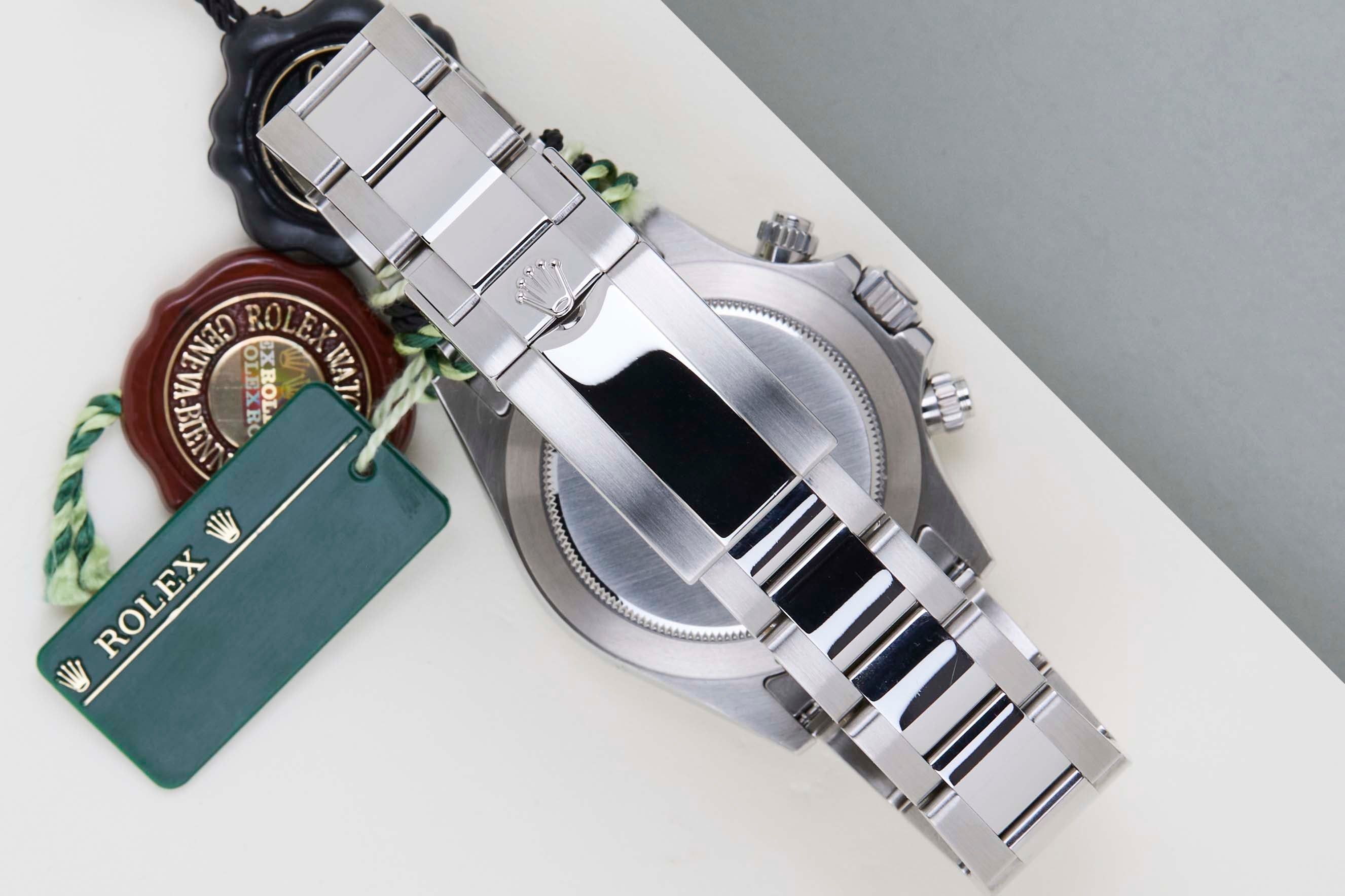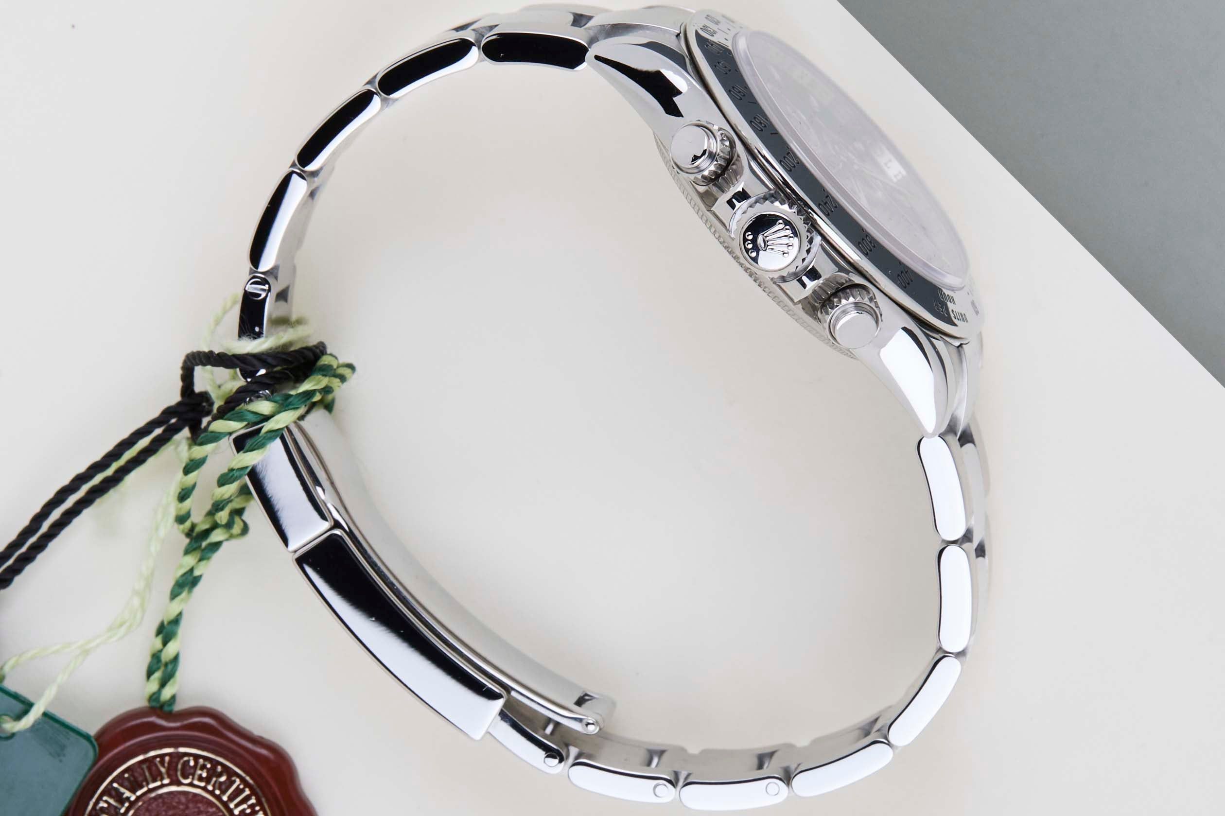Diese Rolex Daytona 116520 ist in neuwertigem Zustand und kommt mit der originalen Rolex-Garantiekarte und der Originalverpackung. Darüber hinaus wurde die Uhr von unseren Uhrmachern gewartet und kommt daher mit einem Jahr Steiner-Garantie.
