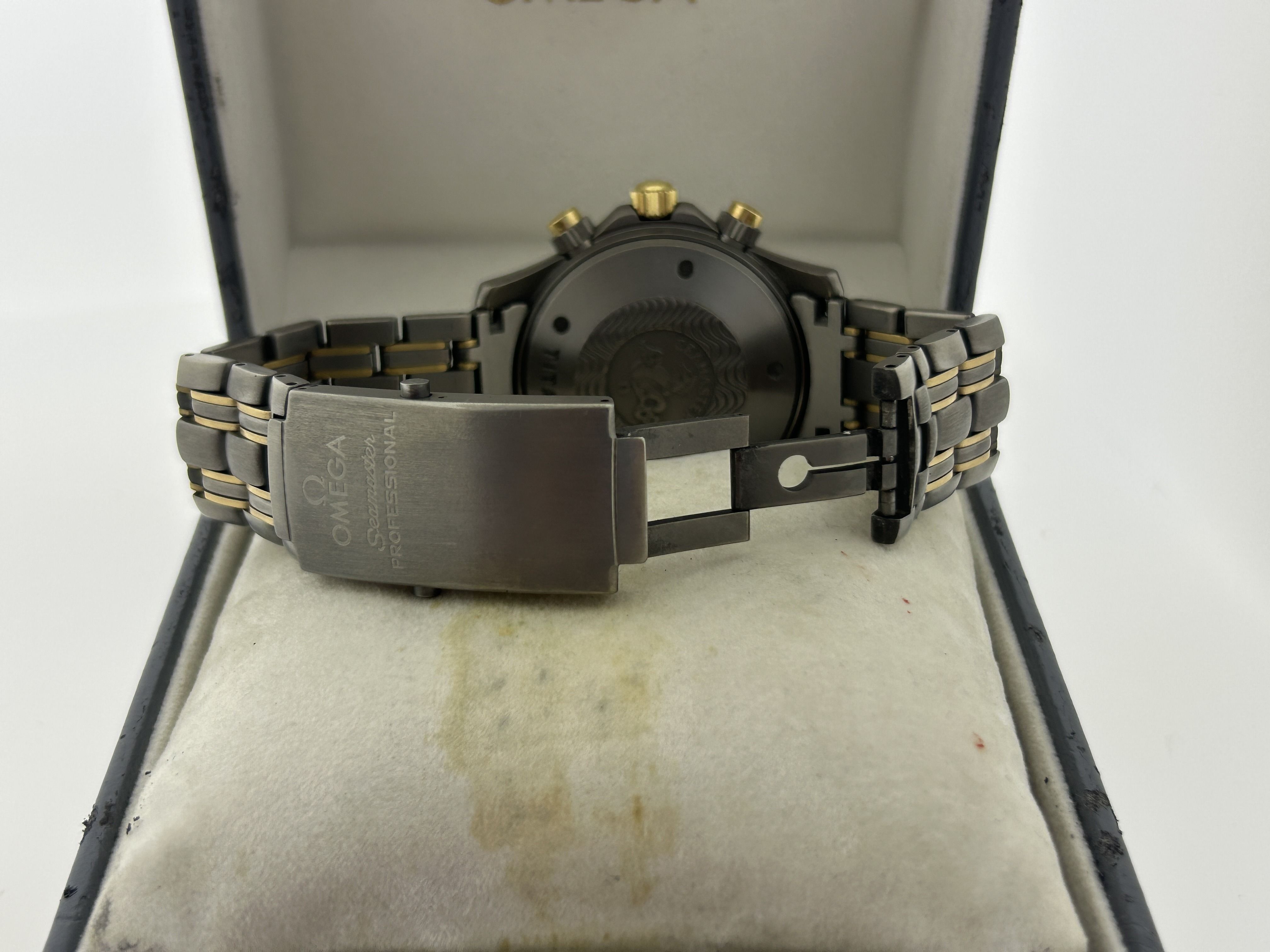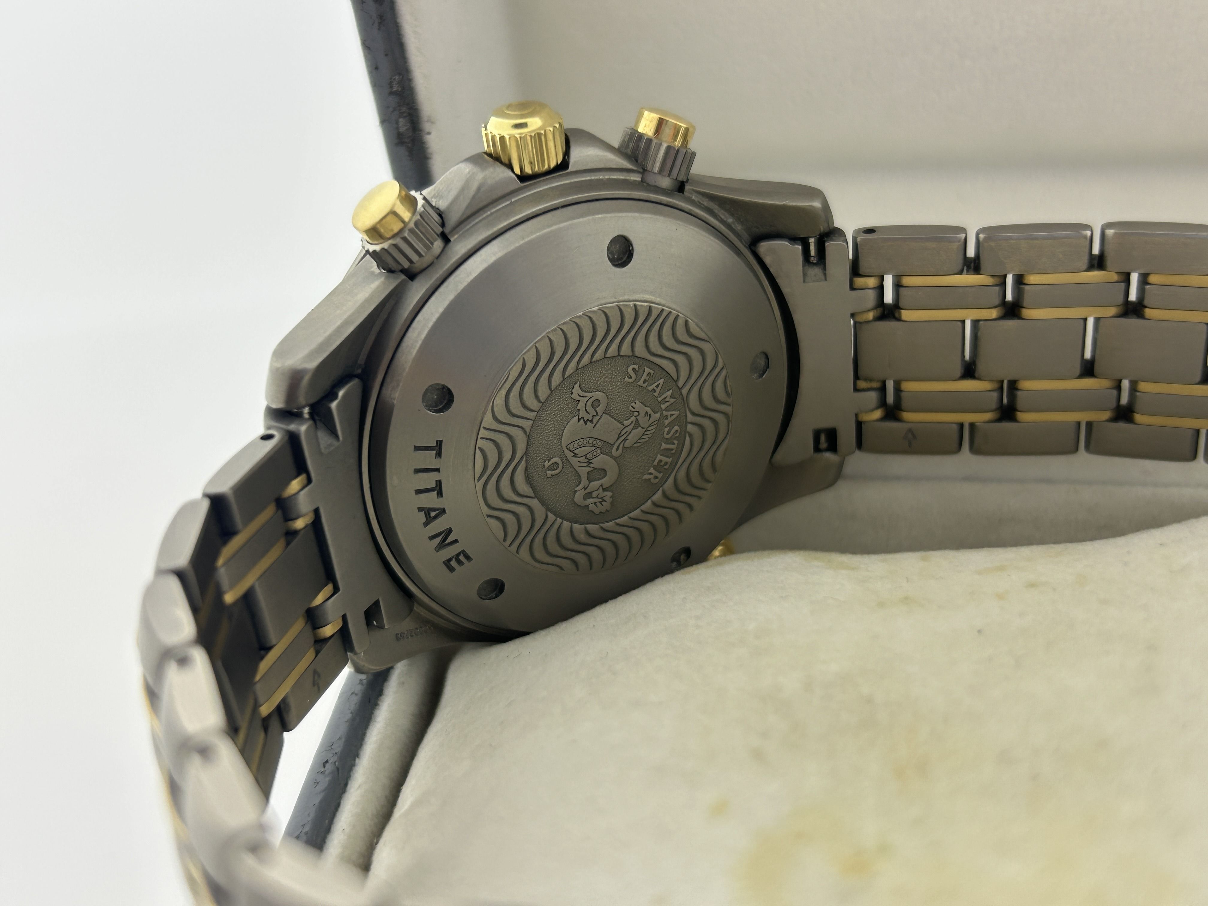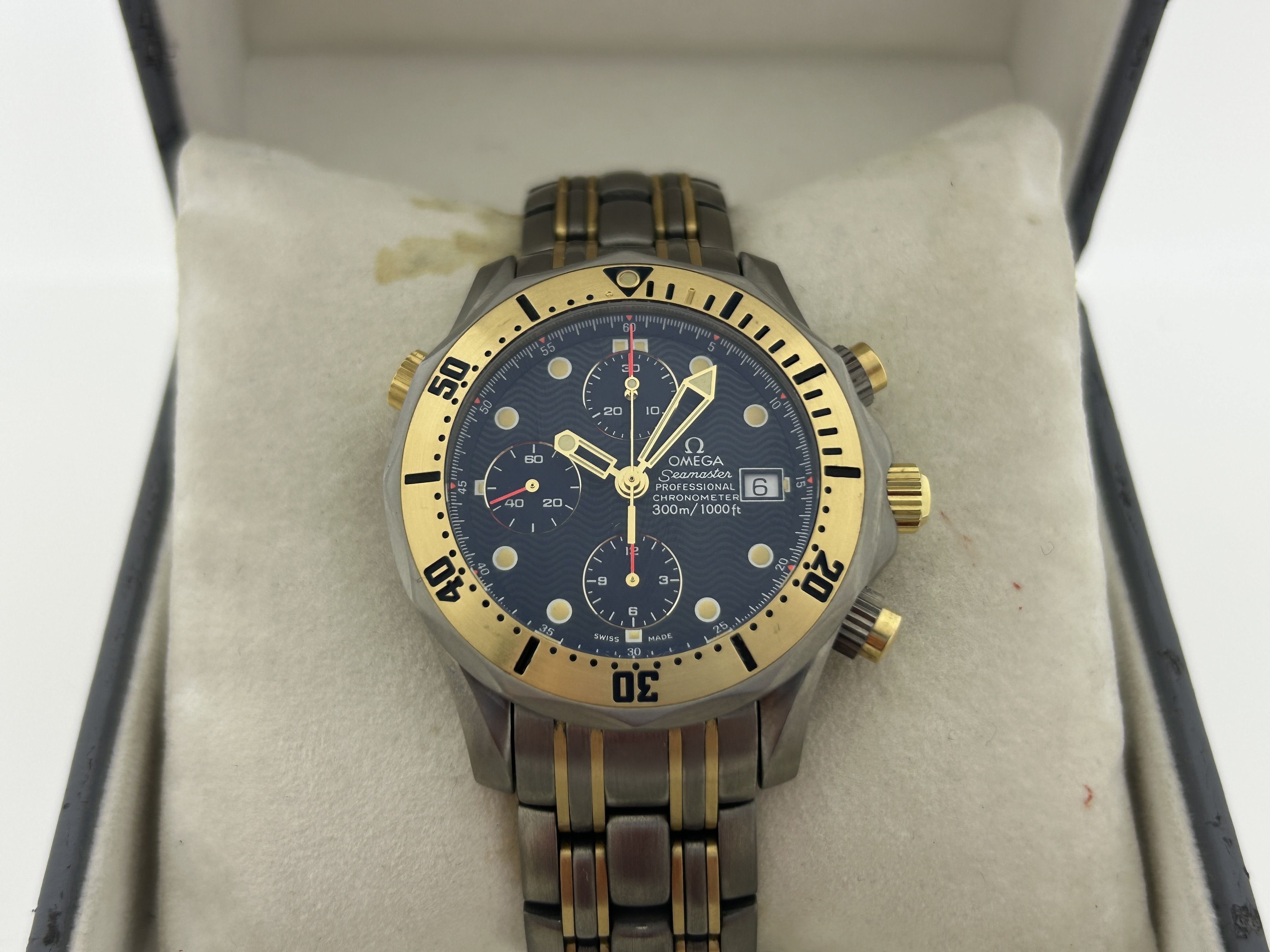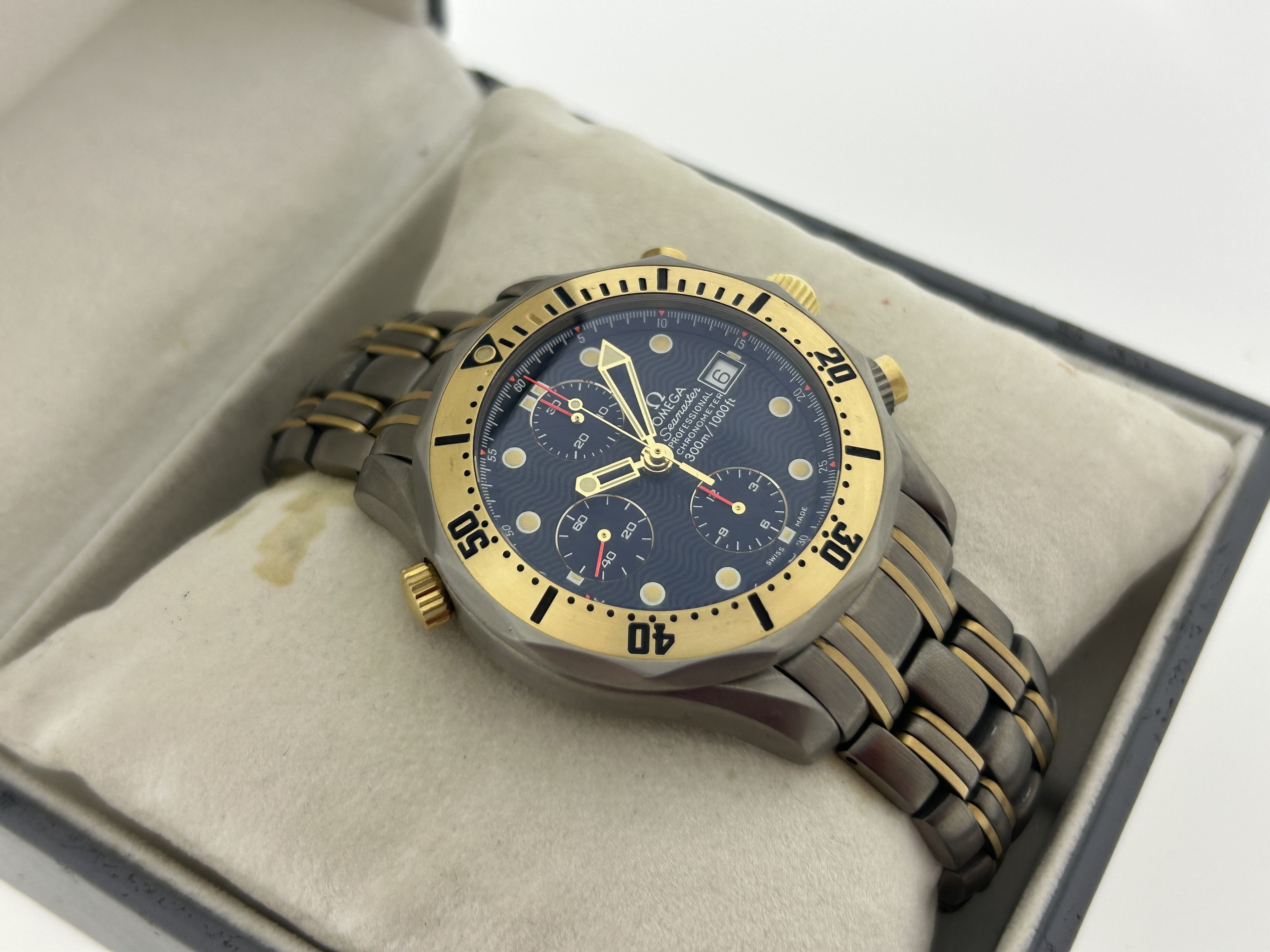 Eine Titan/Gold Omega Seamaster Diver, Ref. 2297.80.00, Fullset, aus 1993. Die Uhr hat ein 41,5 mm Gehäuse aus Titan mit einem Titan/Gold Armband. Die Omega hat eine blaue Zifferblatt mit einem Datumsfenster bei 3 Uhr. Die Omega Seamaster Diver stammt aus 1993 und wurde kürzlich gewartet. Die Uhr kommt mit ihrer originalen Box und dem Zertifikat.