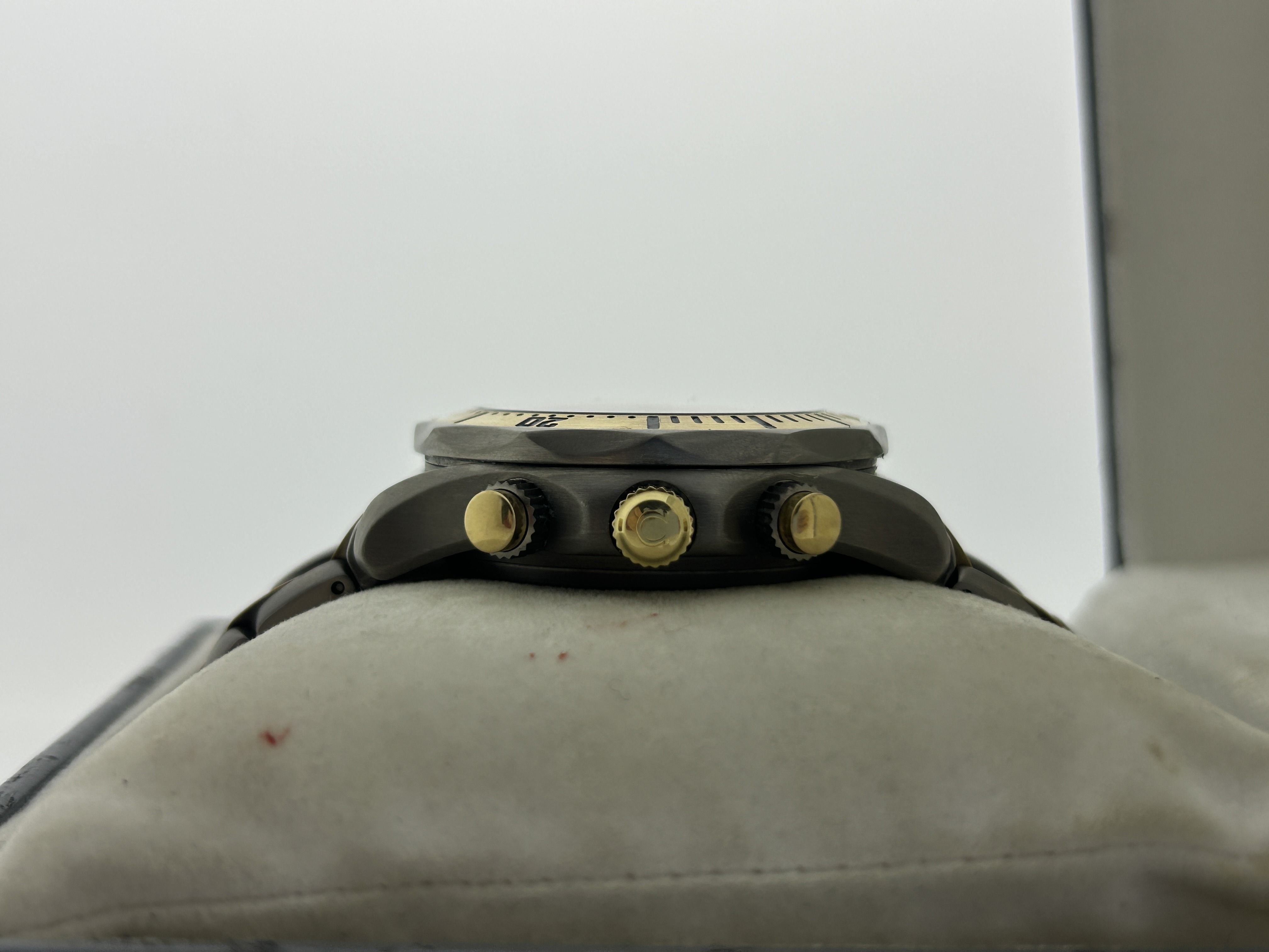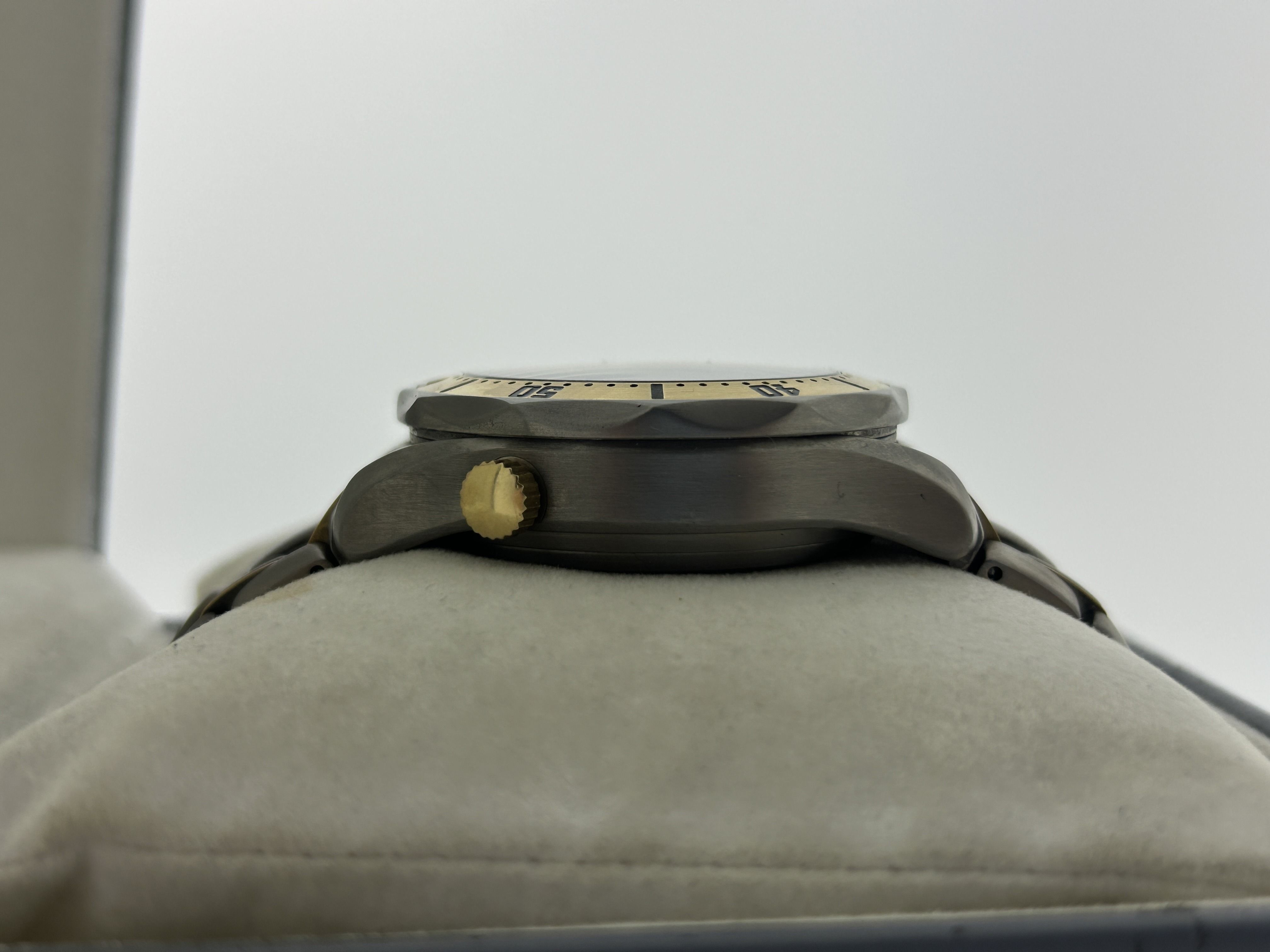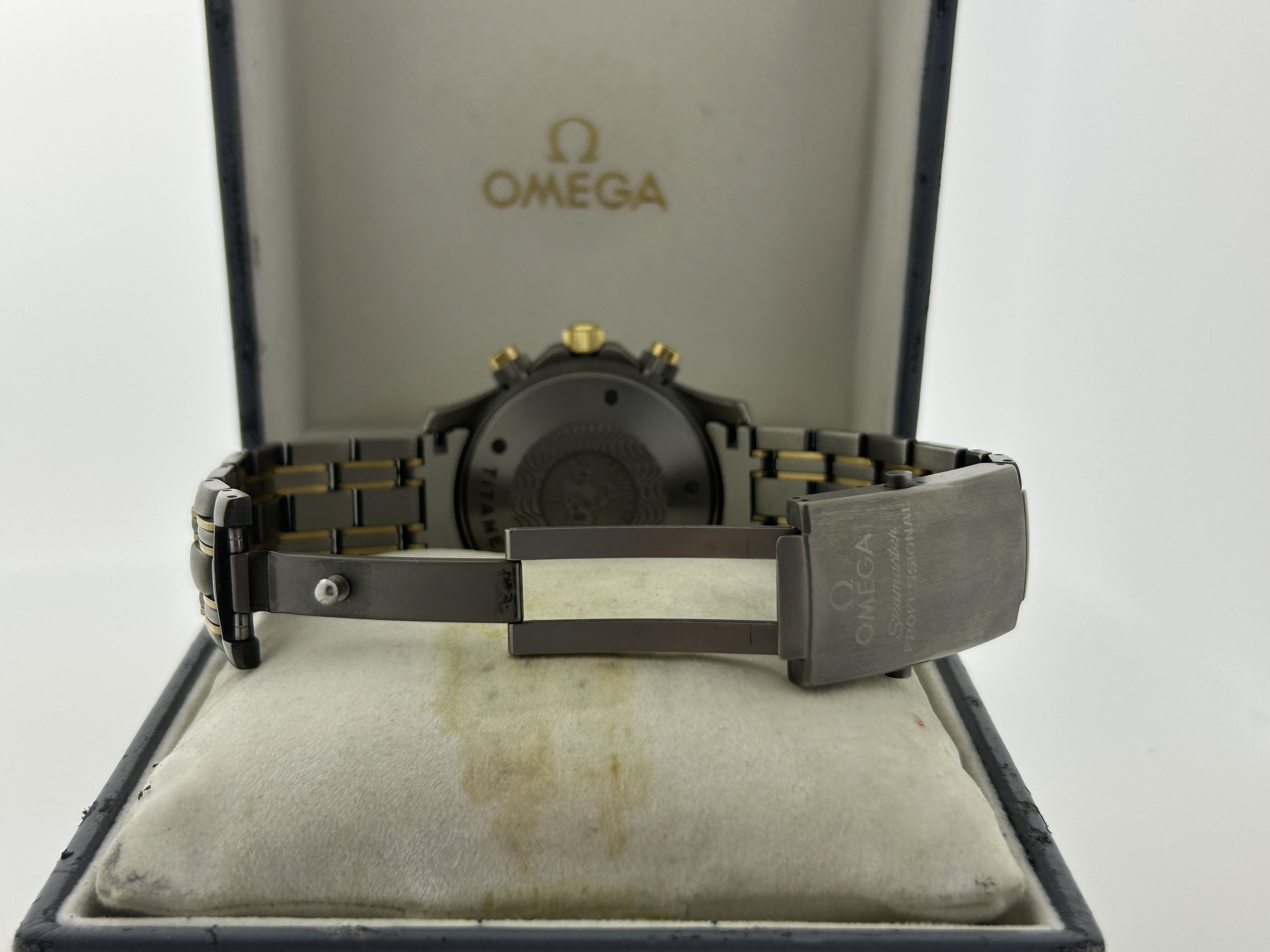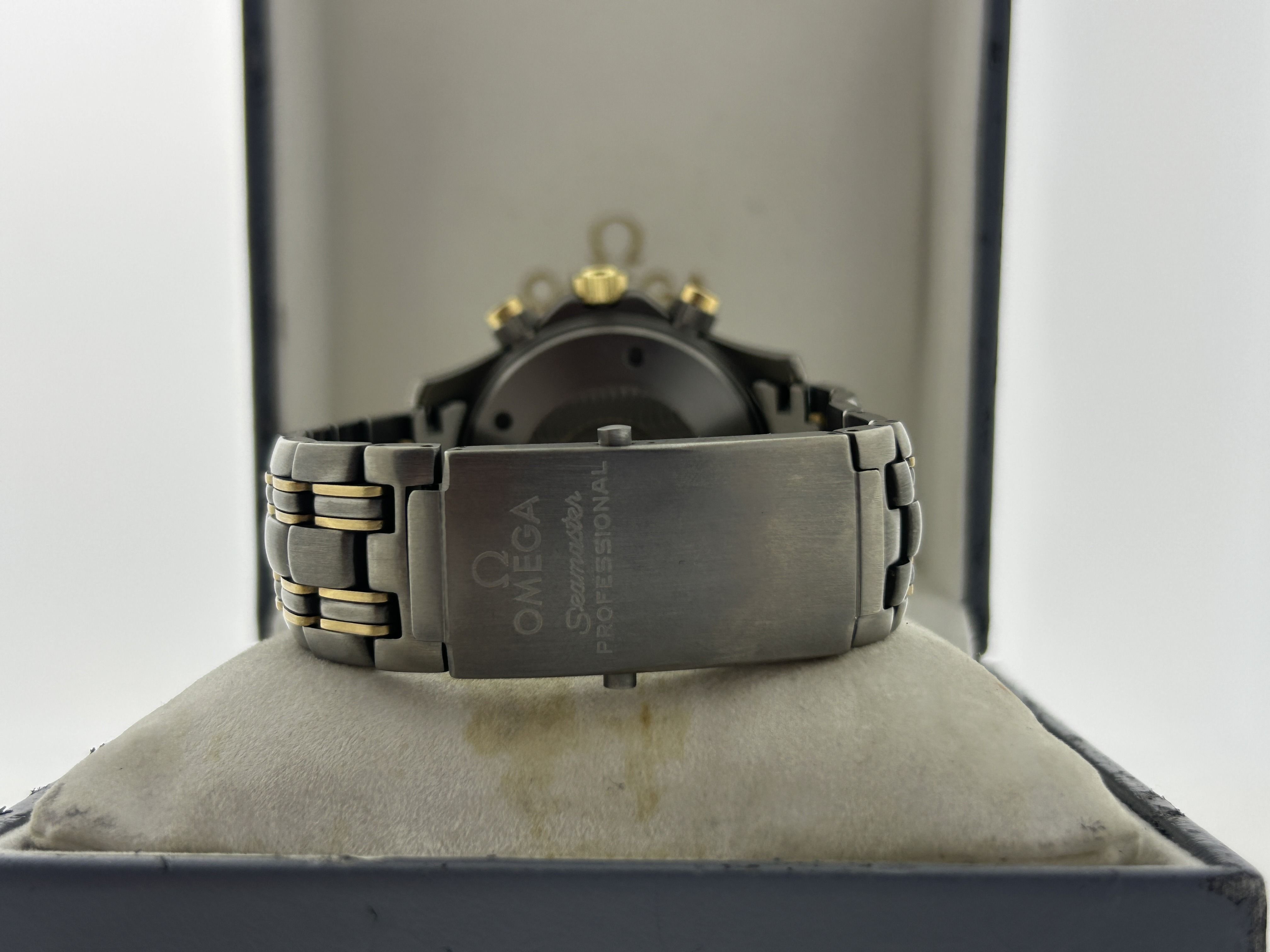 Eine Titan/Gold Omega Seamaster Diver, Ref. 2297.80.00, Fullset, aus 1993. Die Uhr hat ein 41,5 mm Gehäuse aus Titan mit einem Titan/Gold Armband. Die Omega hat eine blaue Zifferblatt mit einem Datumsfenster bei 3 Uhr. Die Omega Seamaster Diver stammt aus 1993 und wurde kürzlich gewartet. Die Uhr kommt mit ihrer originalen Box und dem Zertifikat.