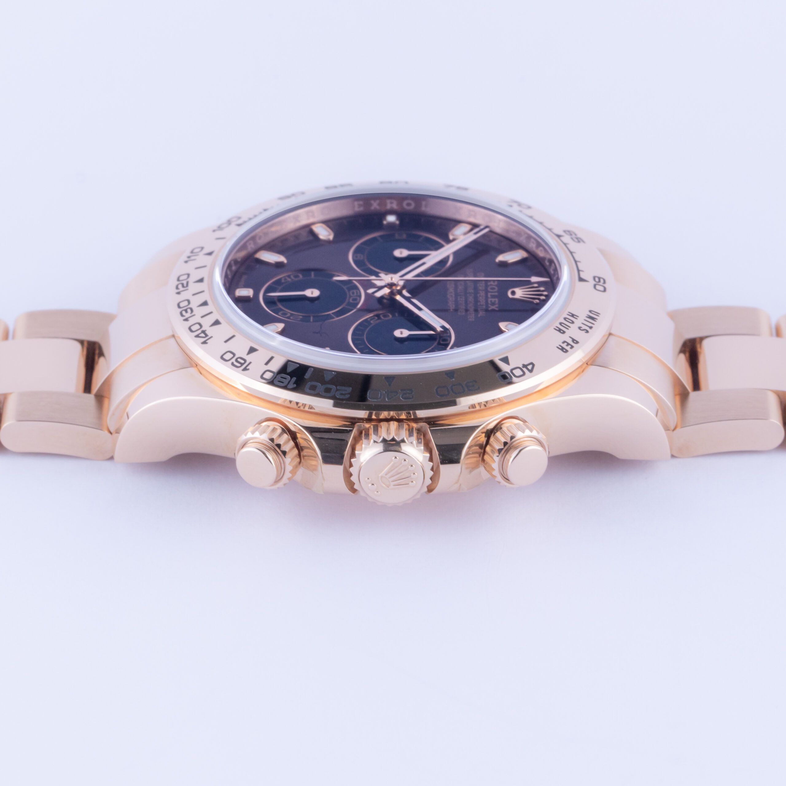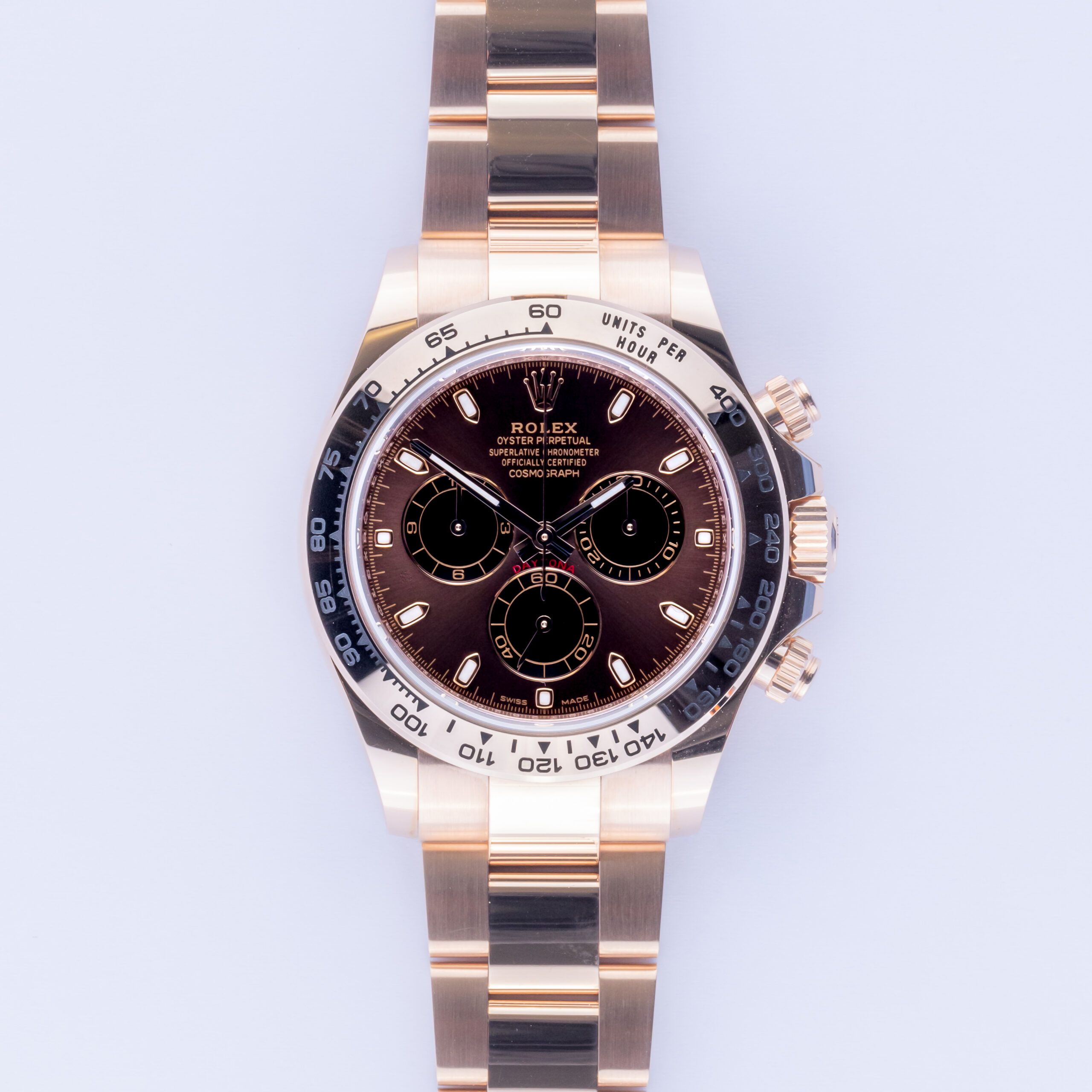 Rolex Daytona Referenz 116505 aus 2022 inklusive vollständigem Set. Die Rolex Daytona Referenz 116505 hat ein 40 mm Gehäuse aus Roségold und verfügt über ein Roségold-Oyster-Armband, eine Tachymeterskala-Lünette und eine schokoladenfarbene Zifferblatt. Die Rolex Daytona 116505 wird von einem hauseigenen Kaliber 4130 Uhrwerk angetrieben, das eine Chronographenfunktion bietet, mit der du deine Aktivitäten präzise und einfach stoppen kannst.