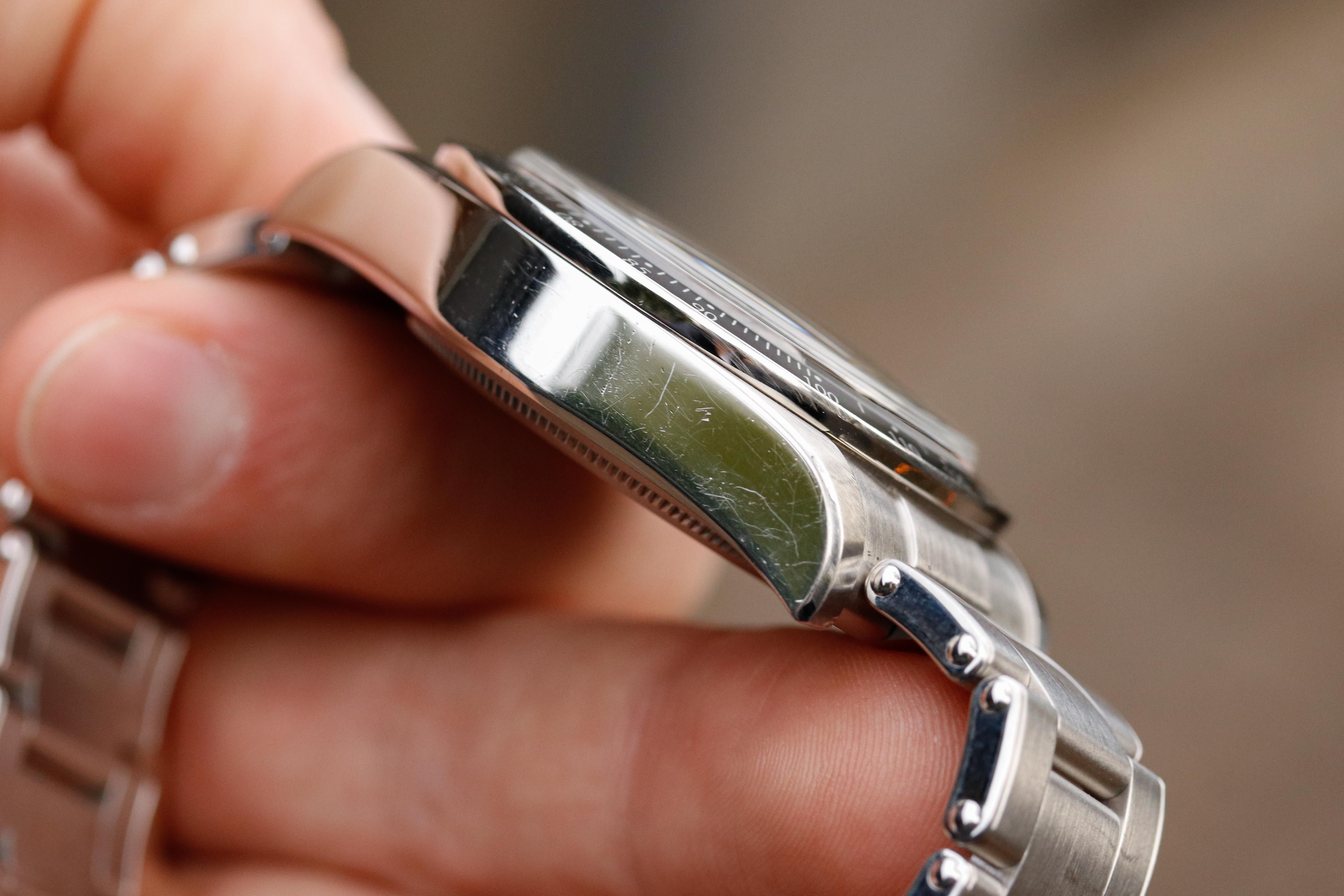 The watch is in good condition with some signs of wear. There case has has some scratches, for example some surface scratches on the polished sides of the casee. The caseback shows some wear caused by the bracelet. The bracelet shows light signs of wear, the folding clasp has some scratches. The watch has been checked by our certified watchmaker and the watch is in fully functioning condition.