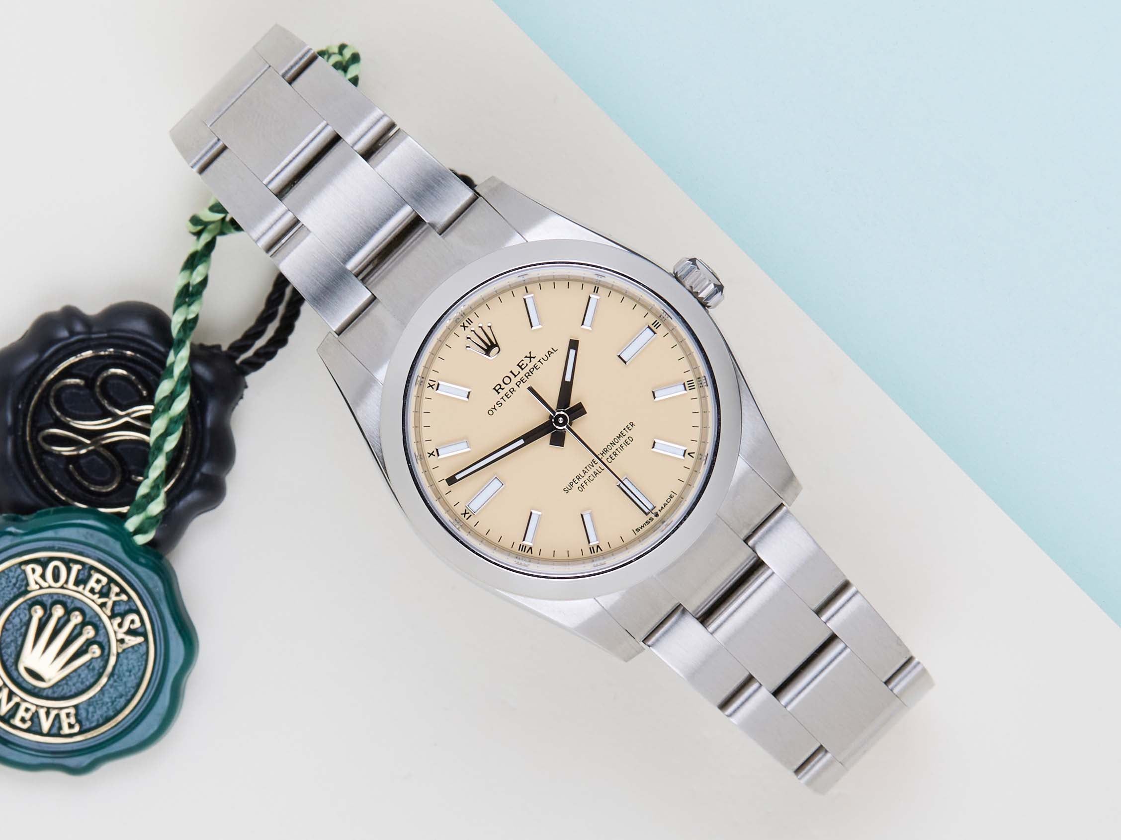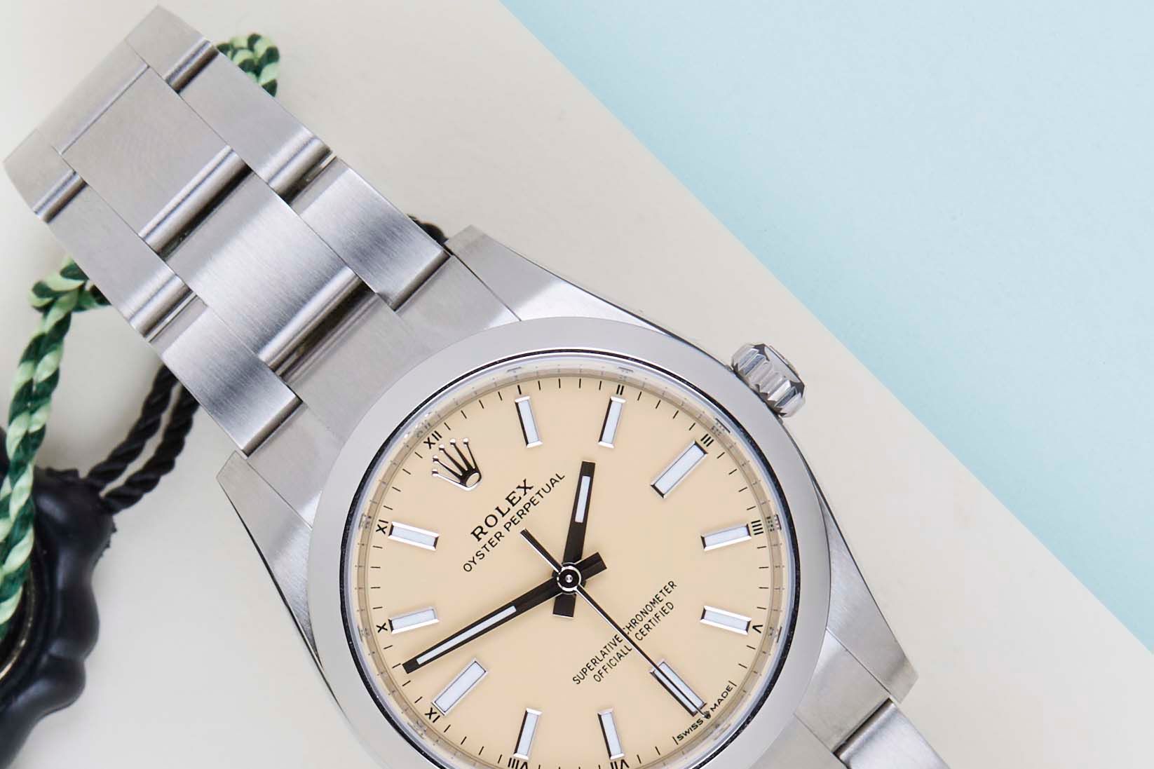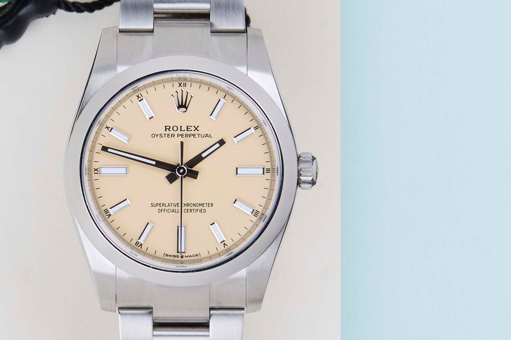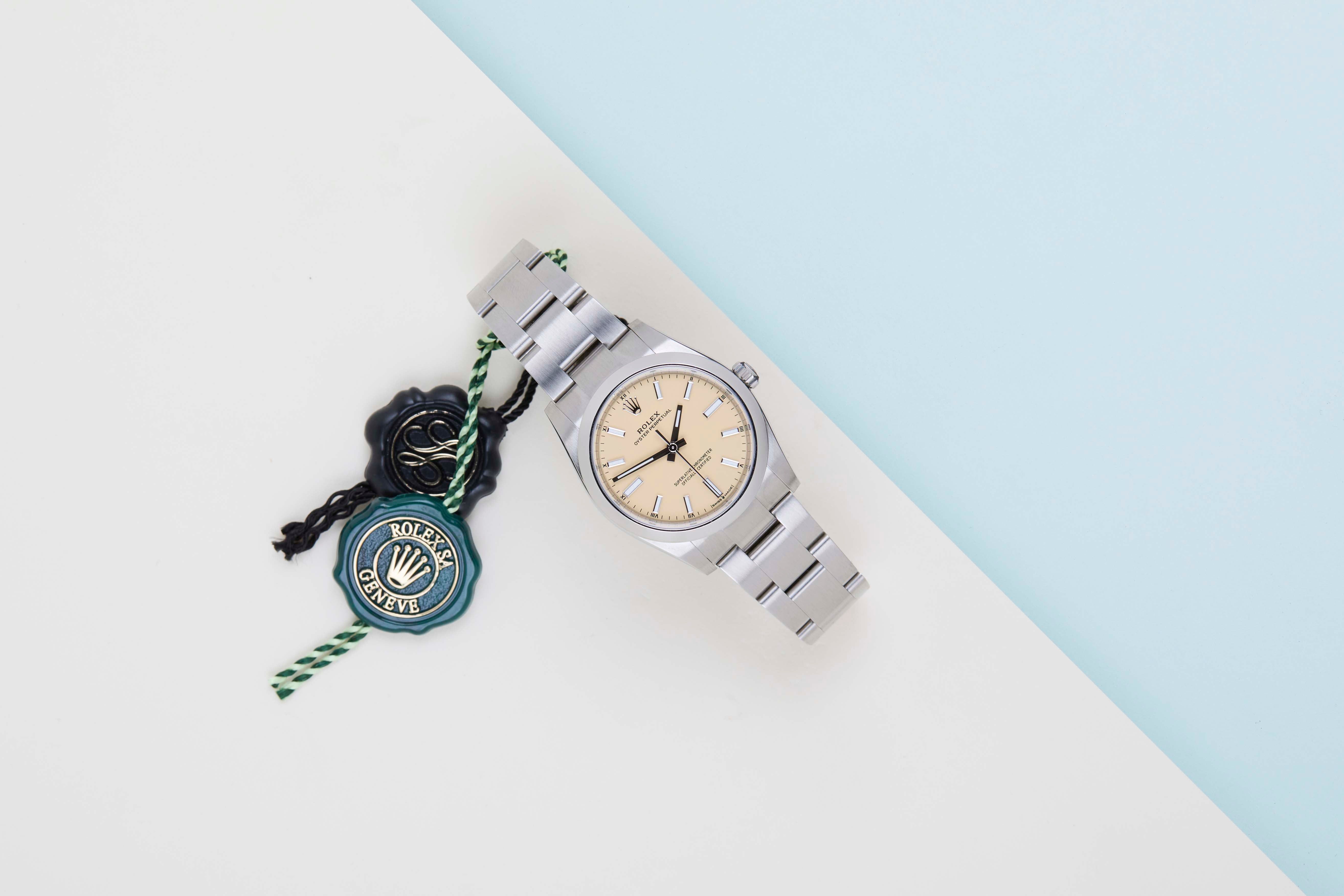 New & Unworn | Full Set | International Rolex Warranty until June 2030 The Rolex Oyster Perpetual was first introduced by Rolex in the 1930s. It is characterized by its water-resistant Oyster case and self-winding Perpetual movement. The Rolex Oyster Perpetual is a simple, yet elegant timepiece that is suitable for both casual and formal wear.This Rolex Oyster Perpetual 34 'Beige Dial' was sold for the first time in June 2025.The watch is fully made out of stainless steel. Rolex uses 904L in its steel watches, which is an extremely resistant and highly polishable superalloy.This Rolex Oyster Perpetual 34 is in New & Unworn condition and comes with the original Rolex Warranty Card and box. Furthermore, the watch still has International Rolex Warranty until June 2030.