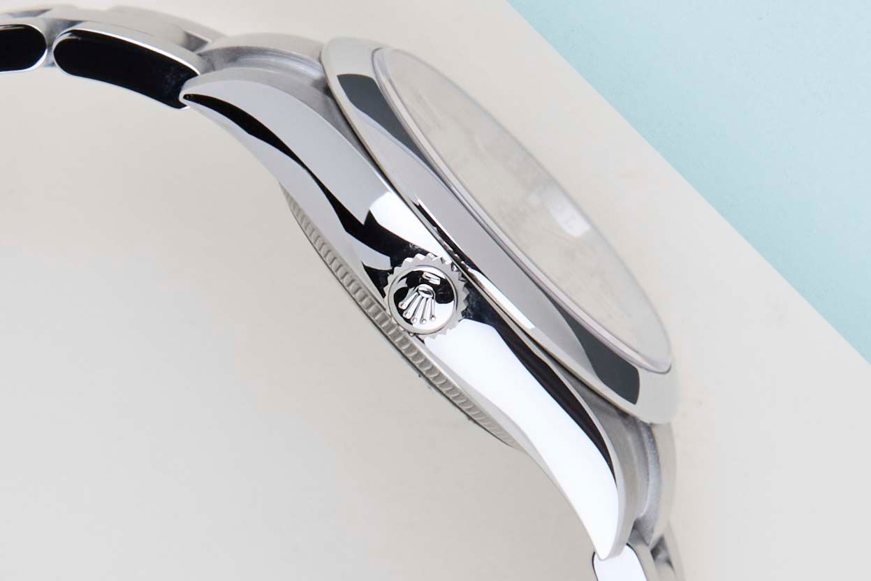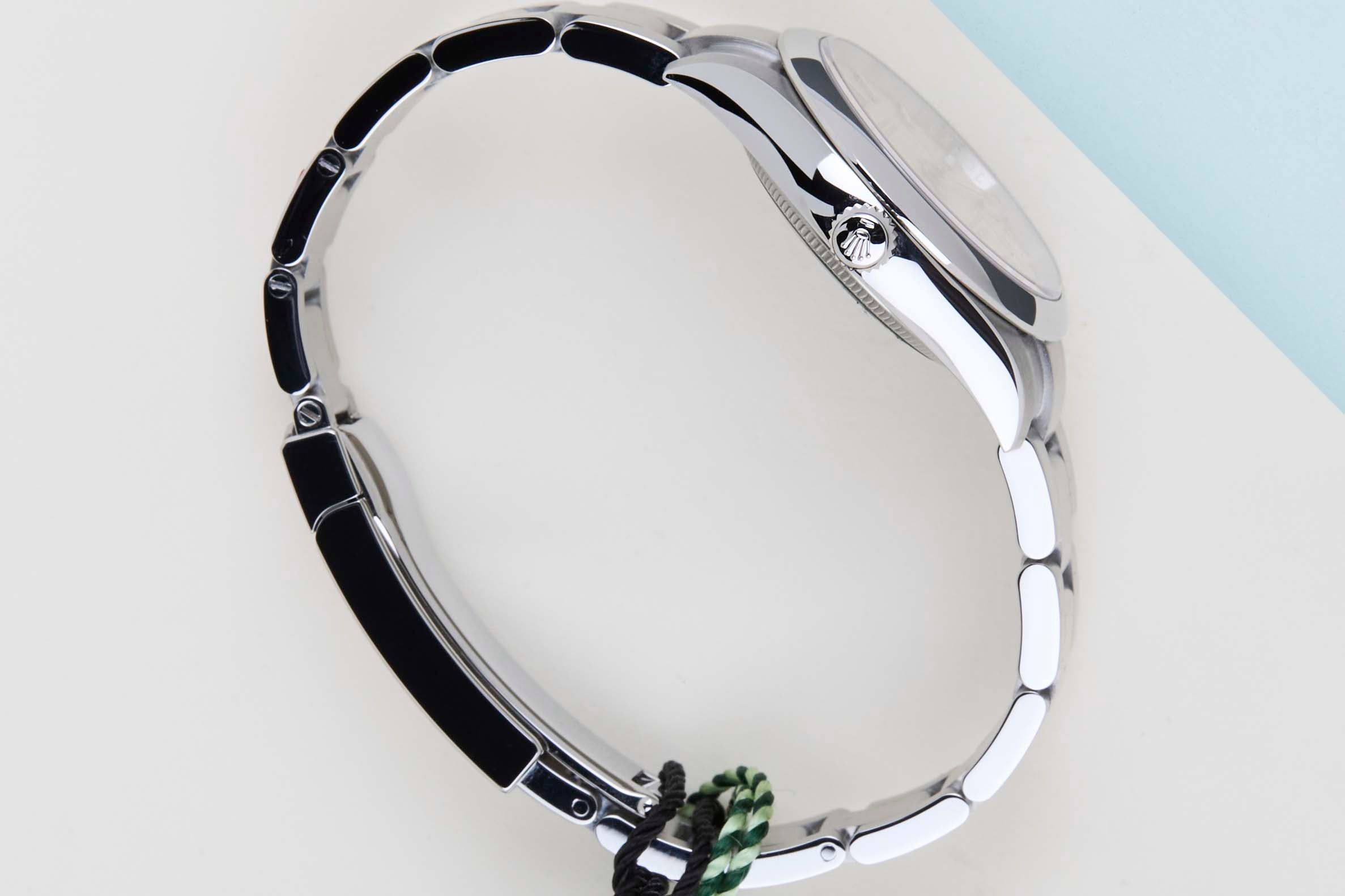 Diese Rolex Oyster Perpetual 34 ist in neuem und ungetragenem Zustand und wird mit der originalen Rolex Garantiekarte und der Box geliefert. Darüber hinaus hat die Uhr noch internationale Rolex Garantie bis Juni 2030.