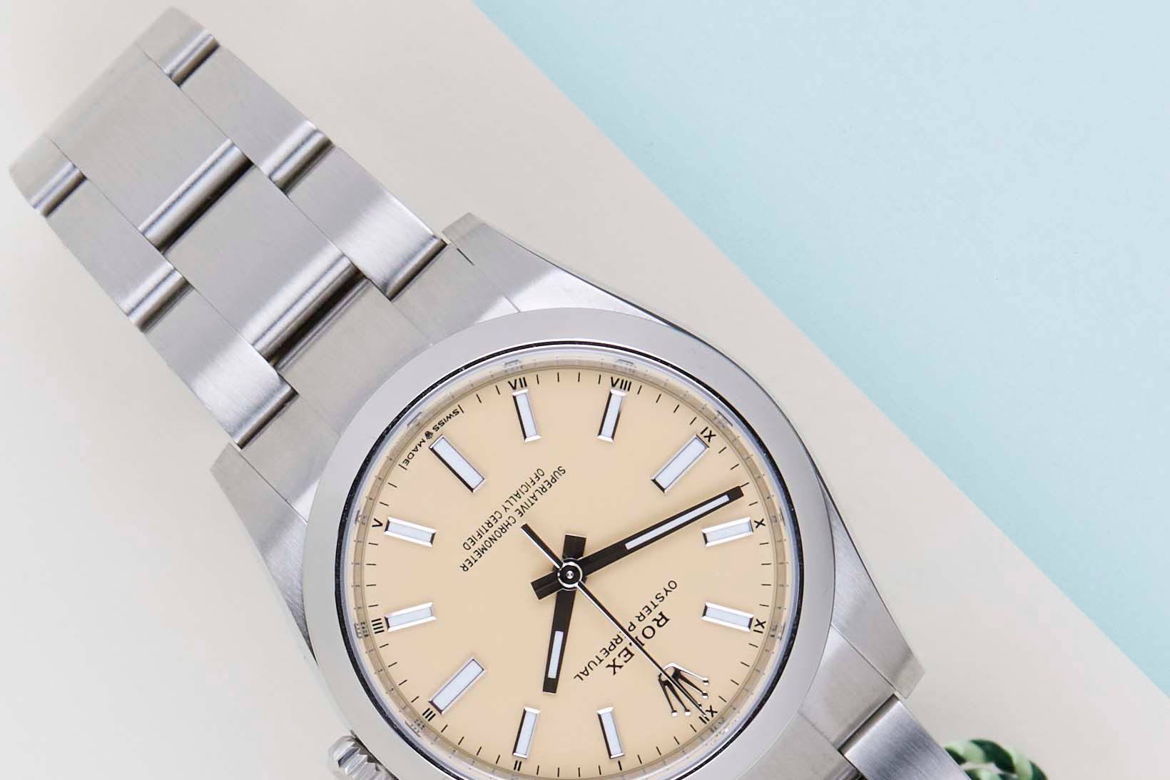 Diese Rolex Oyster Perpetual 34 'Beige Dial' wurde erstmals im Juni 2025 verkauft. Die Uhr besteht vollständig aus Edelstahl. Rolex verwendet 904L in seinen Stahluhren, das ist eine extrem widerstandsfähige und hochpolierbare Superlegierung.