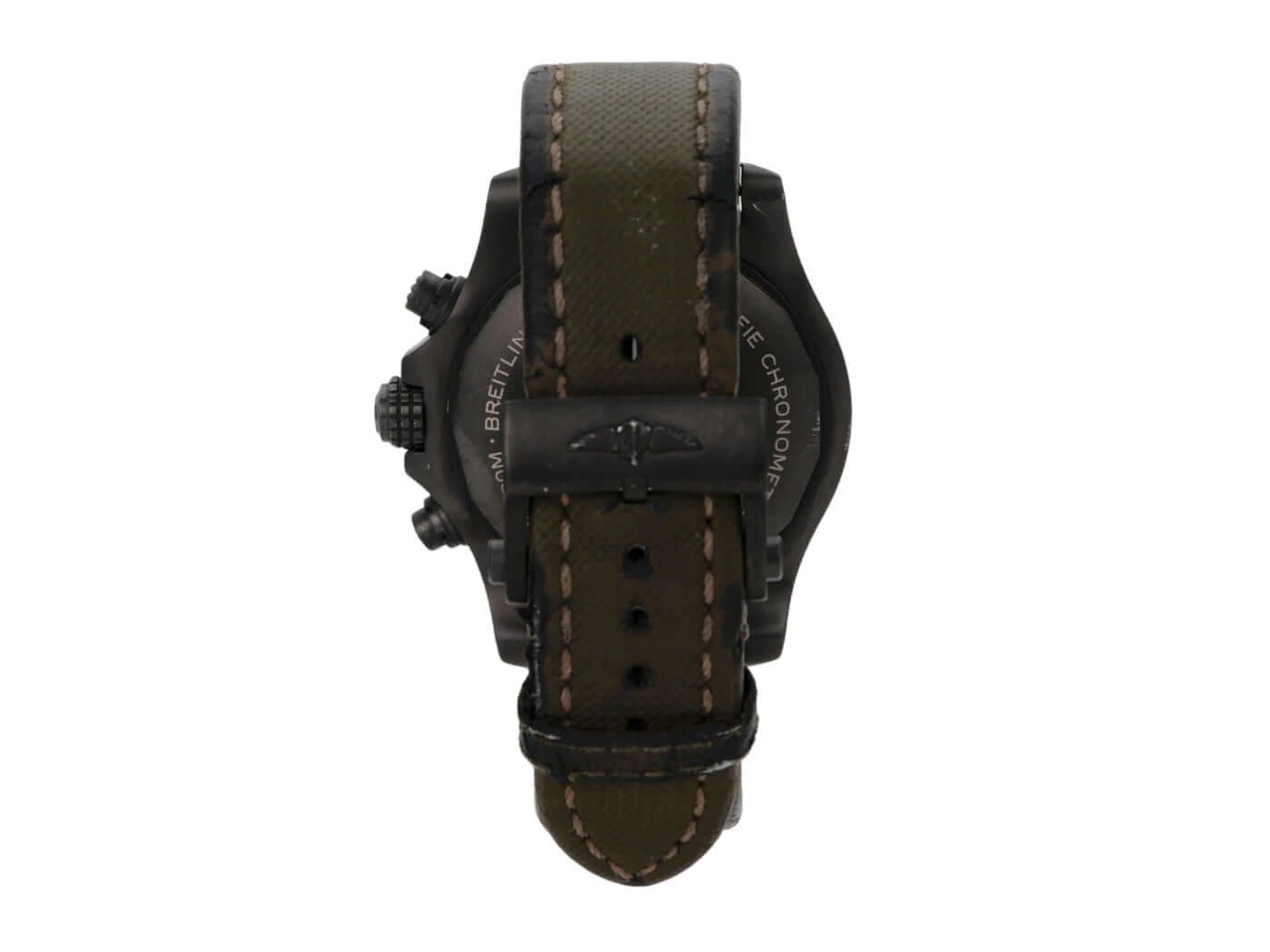 Gehäuse aus satinierter, DLC-beschichteter Titanlegierung, Gehäusedurchmesser 45 mm, Gehäusehöhe 16,46 mm, DLC-beschichtete Titanlünette mit leuchtendem Punkt, einseitig drehbar mit Arretierung, khakifarbener Lederarmband mit Faltschließe, khakifarbene Zifferblatt mit aufgesetzten, leuchtenden Ziffern, leuchtenden Zeigern, khakifarbenen Subdials, Automatik, Breitling Kaliber 13 mit 25 Steinen, 28.800 Schwingungen pro Stunde, ca. 42 Stunden Gangreserve, Datumsanzeige, Chronograph, Chronometer, gewölbtes Saphirglas, doppelte Anti-Reflex-Beschichtung, verschraubte Krone mit Flankenschutz, verschraubter, DLC-beschichteter Titanboden, wasserdicht bis 30 bar.