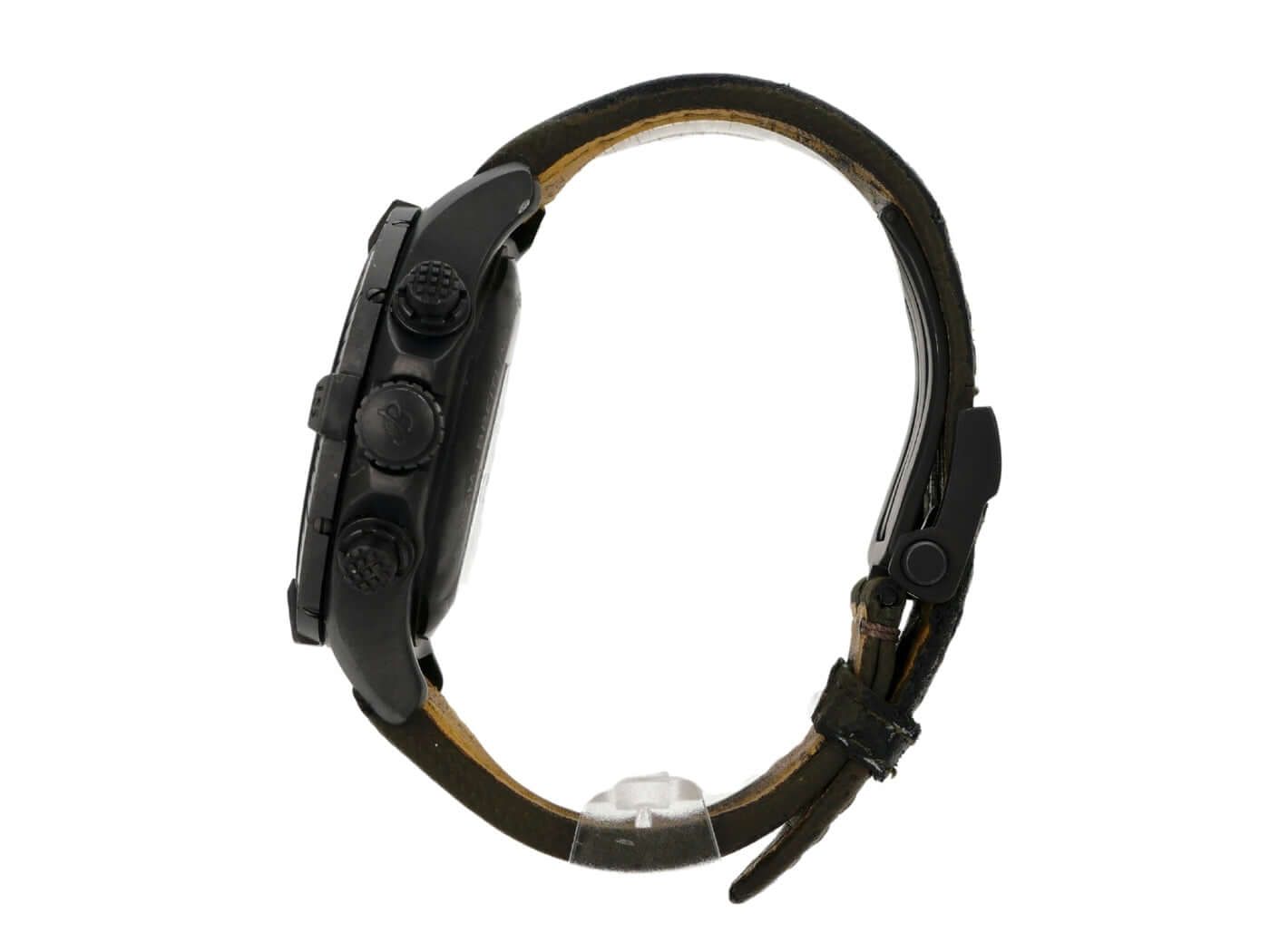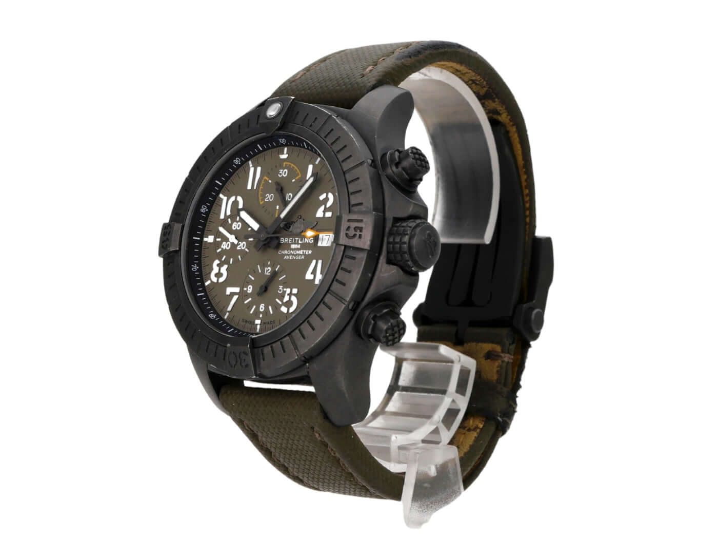 Breitling Avenger Chronograph 45 Night Mission Folding Clasp Ref. V13317101L1X2Case made of satin-finished DLC-coated titanium, case diameter 45 mm, case height 16.46 mm, DLC-coated titanium bezel with luminous dot, unidirectional rotating with lock, khaki leather strap with folding clasp, khaki dial with applied luminous numerals, luminous hands, khaki subdials, automatic, Breitling 13 caliber with 25 jewels, 28,800 vibrations per hour, approximately 42-hour power reserve, date display, chronograph, chronometer, domed sapphire crystal, double anti-reflective coating, screw-down crown with flank protection, screw-down DLC-coated titanium case back, water-resistant up to 30 bar.