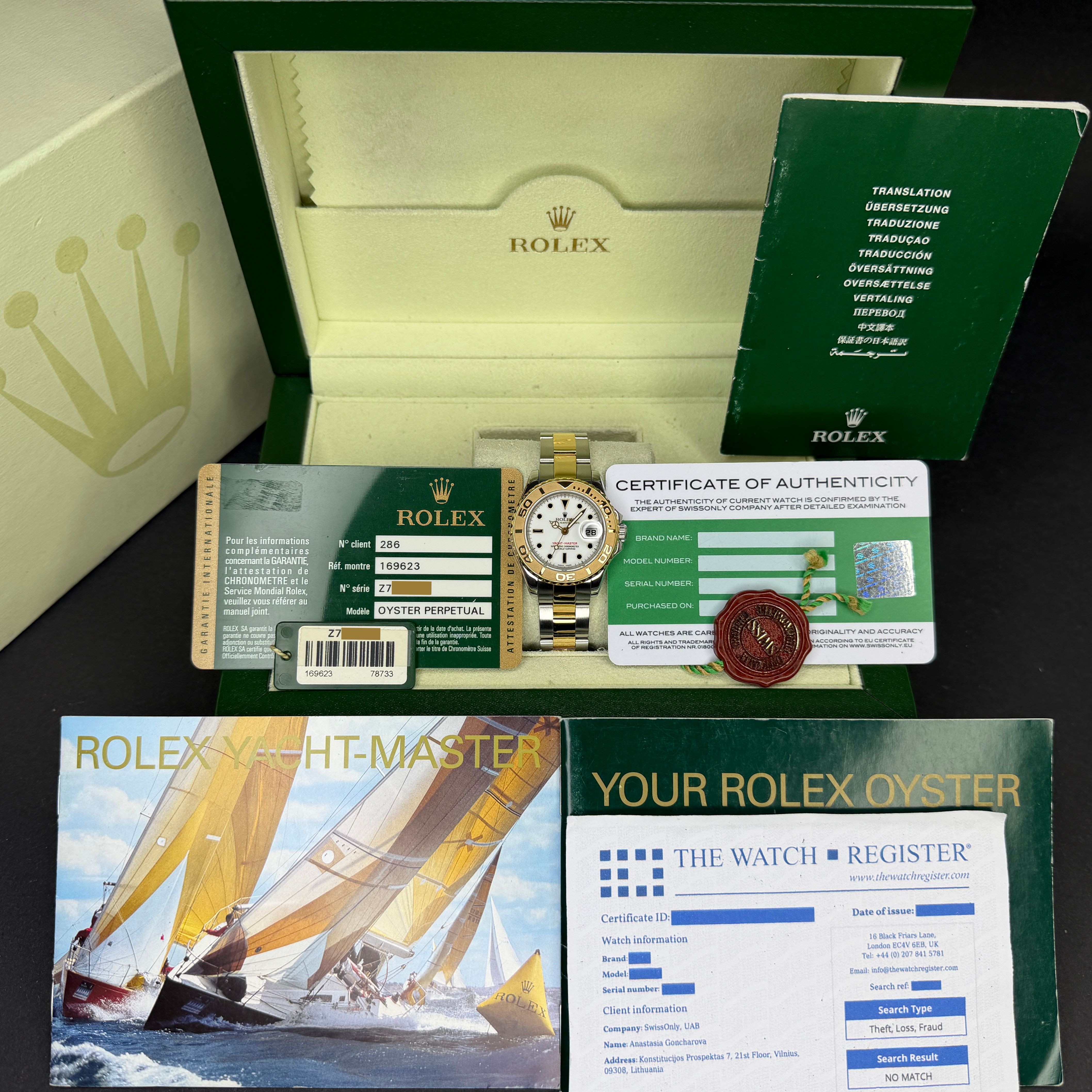 This Rolex Yacht-Master 169623 features a White dial and is crafted from 18K yellow gold and stainless steel, with a production year of 2006.Case No: Z74XXXX
