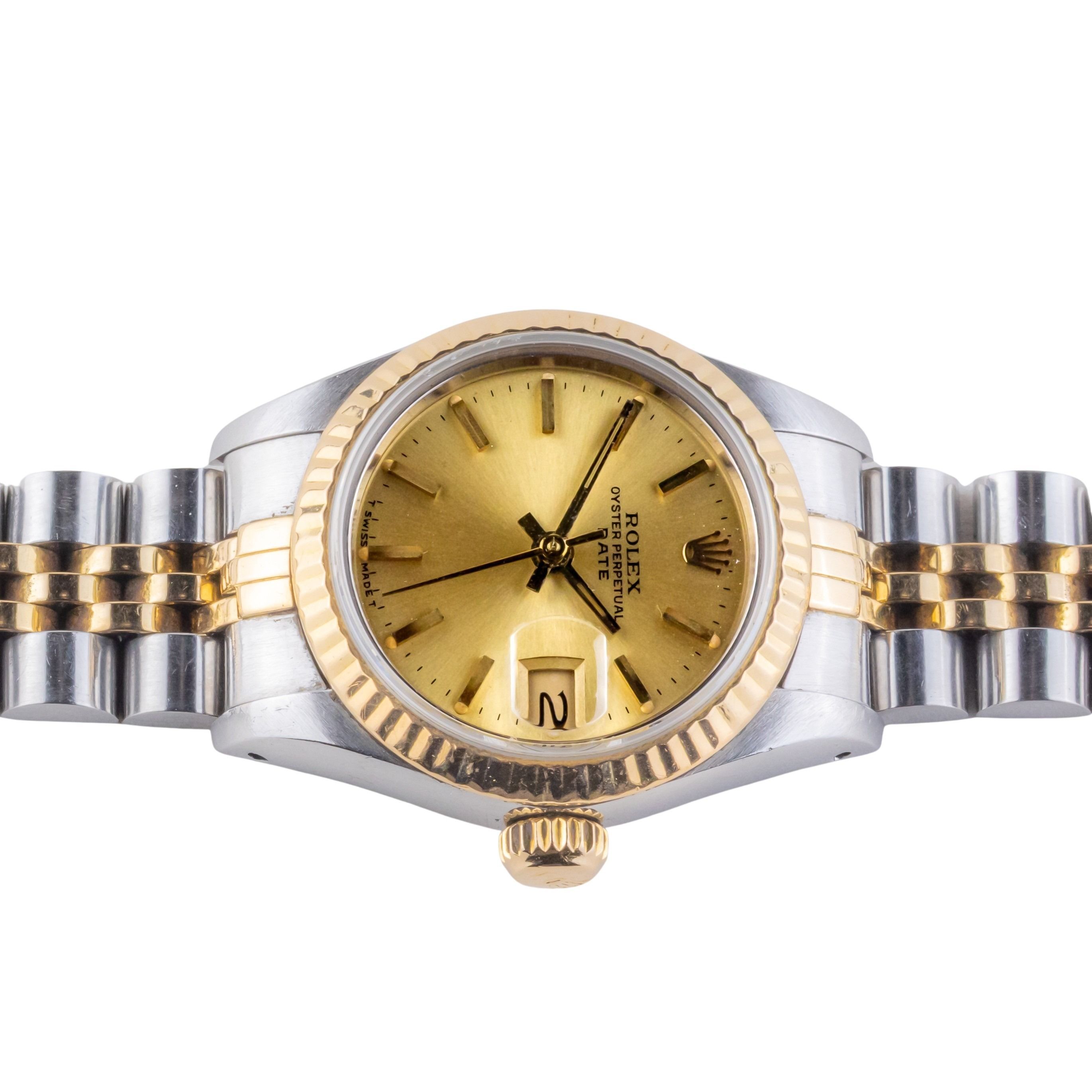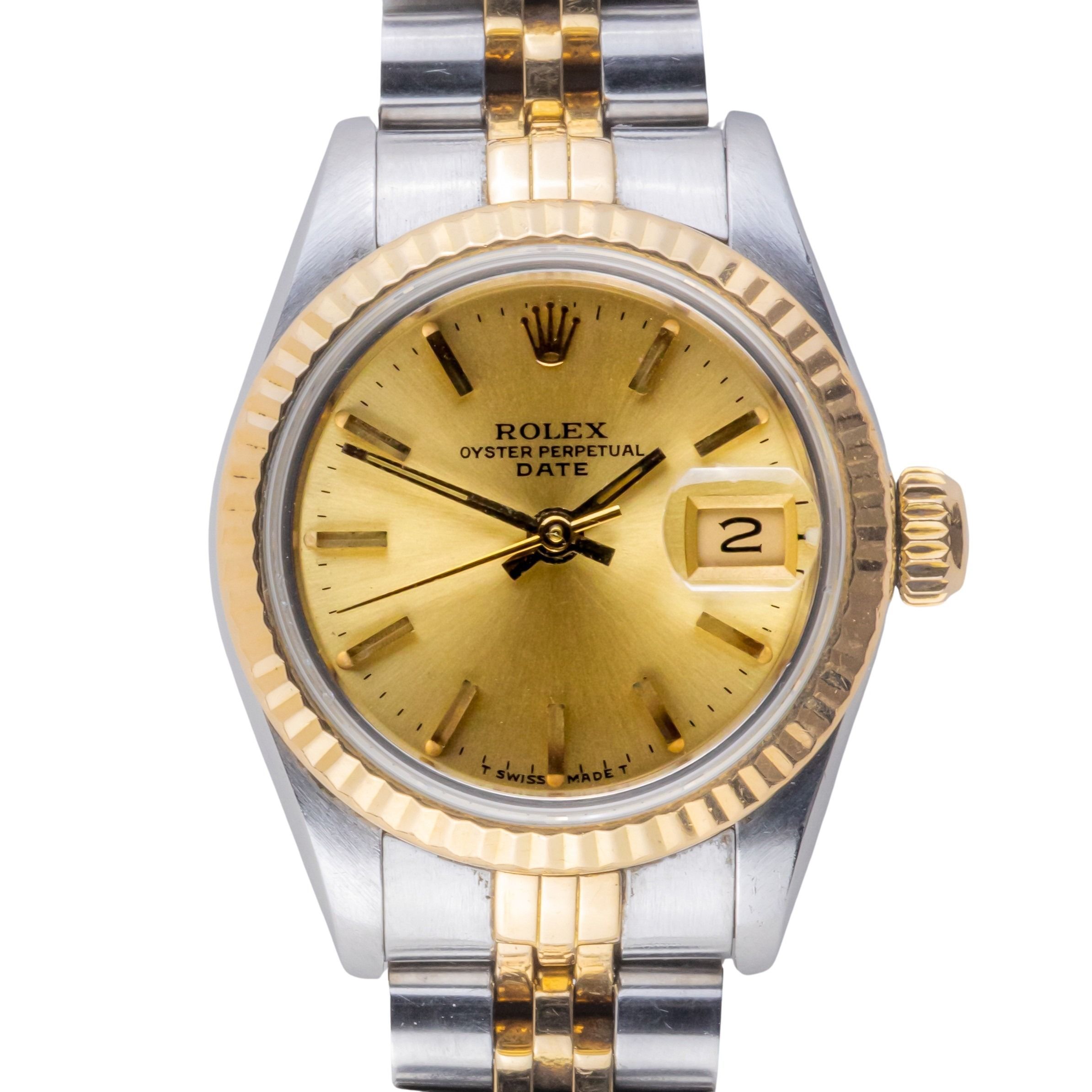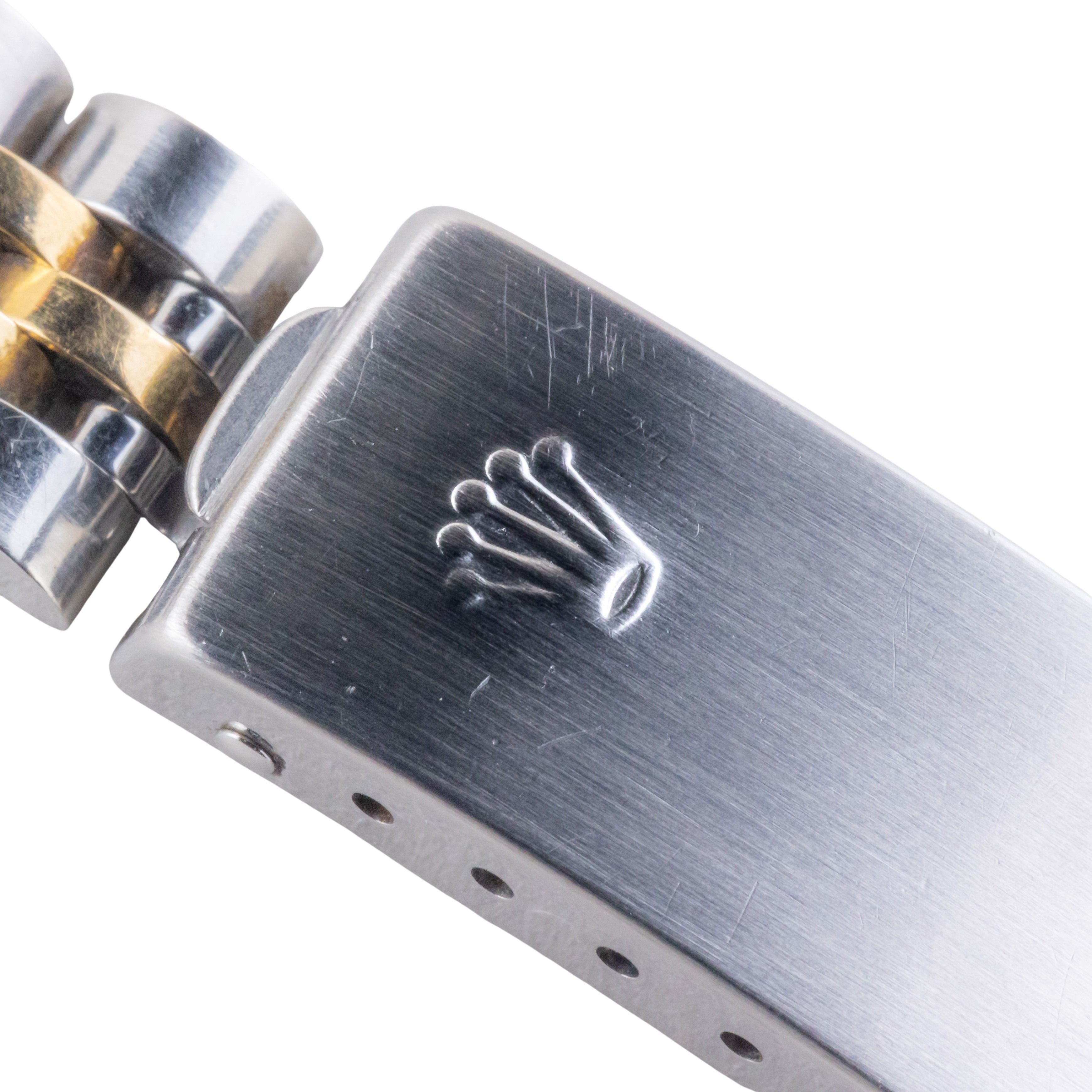 Rolex Lady-Datejust Referenz 69173 aus 1987 inklusive vollständigem Set. Die Lady-Datejust 69173 hat ein 26 mm Gehäuse aus Gold und Edelstahl, ein zweifarbiges Jubiléearmband und eine geriffelte Lünette aus 14 Karat Gold. Diese Lady-Datejust 69173 verfügt über ein automatisches Uhrwerk Kaliber 2135 mit Schnellschaltung für das Datum, ein kratzfestes Saphirglas und eine champagnerfarbene Zifferblatt mit Tritiumzeigern.