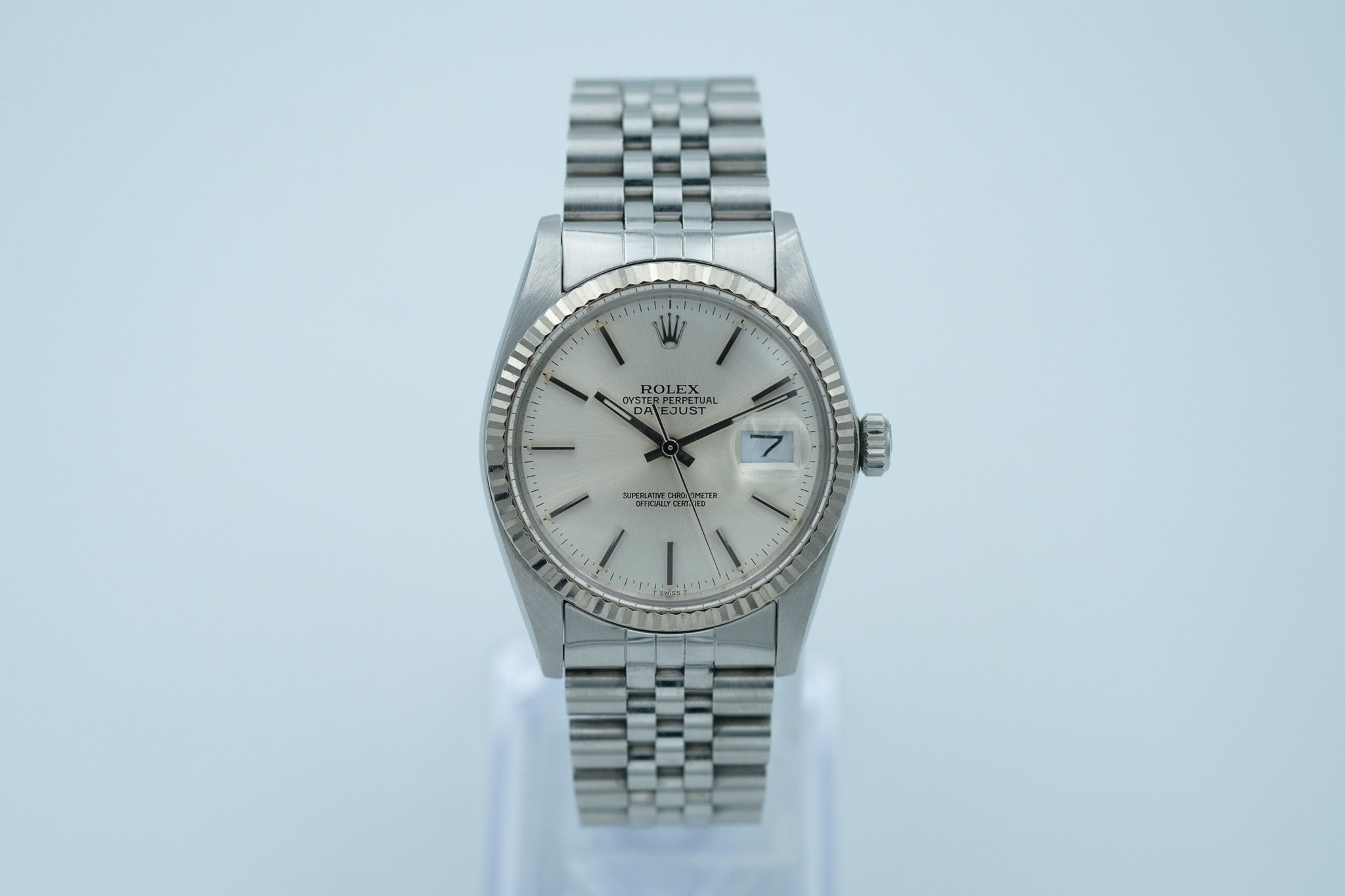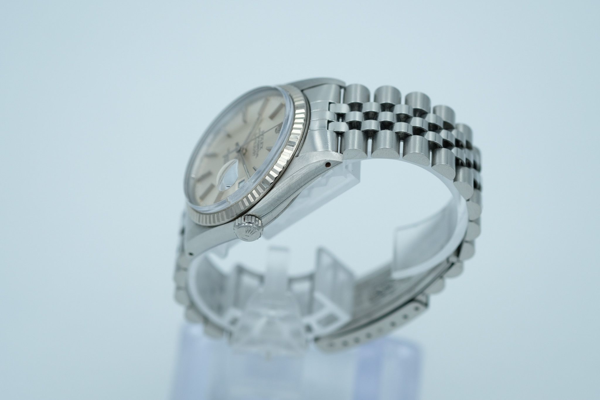 Diese Datejust mit der Referenznummer 16014 hat eine wunderschöne silberne Tritium-Wijzerplaat mit einem leichten Vanilleton.