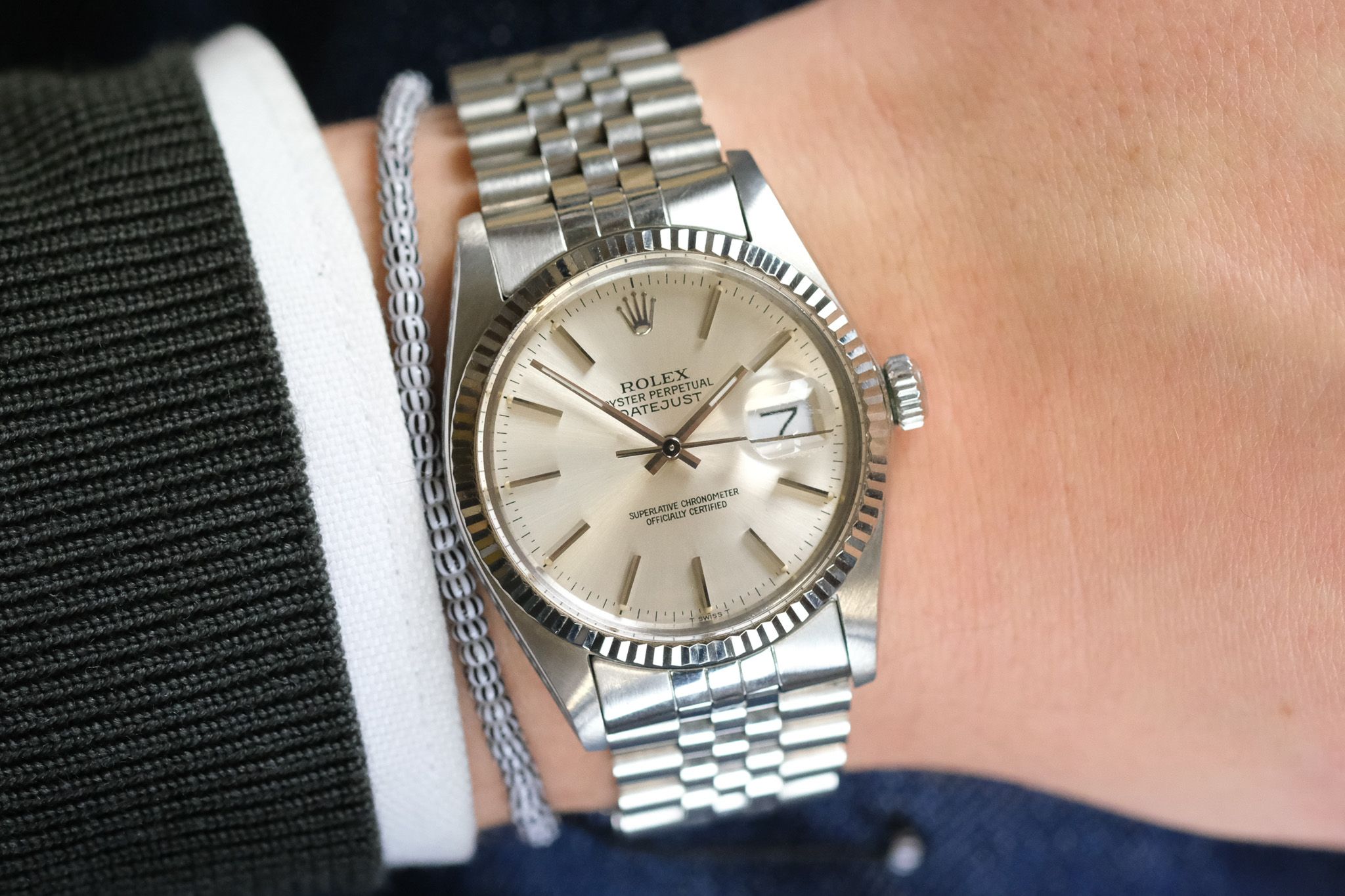 The interplay of the Jubileé bracelet, white gold bezel, plexiglass and the patina of the silver dial gives the watch a great vintage aura - we are in love.