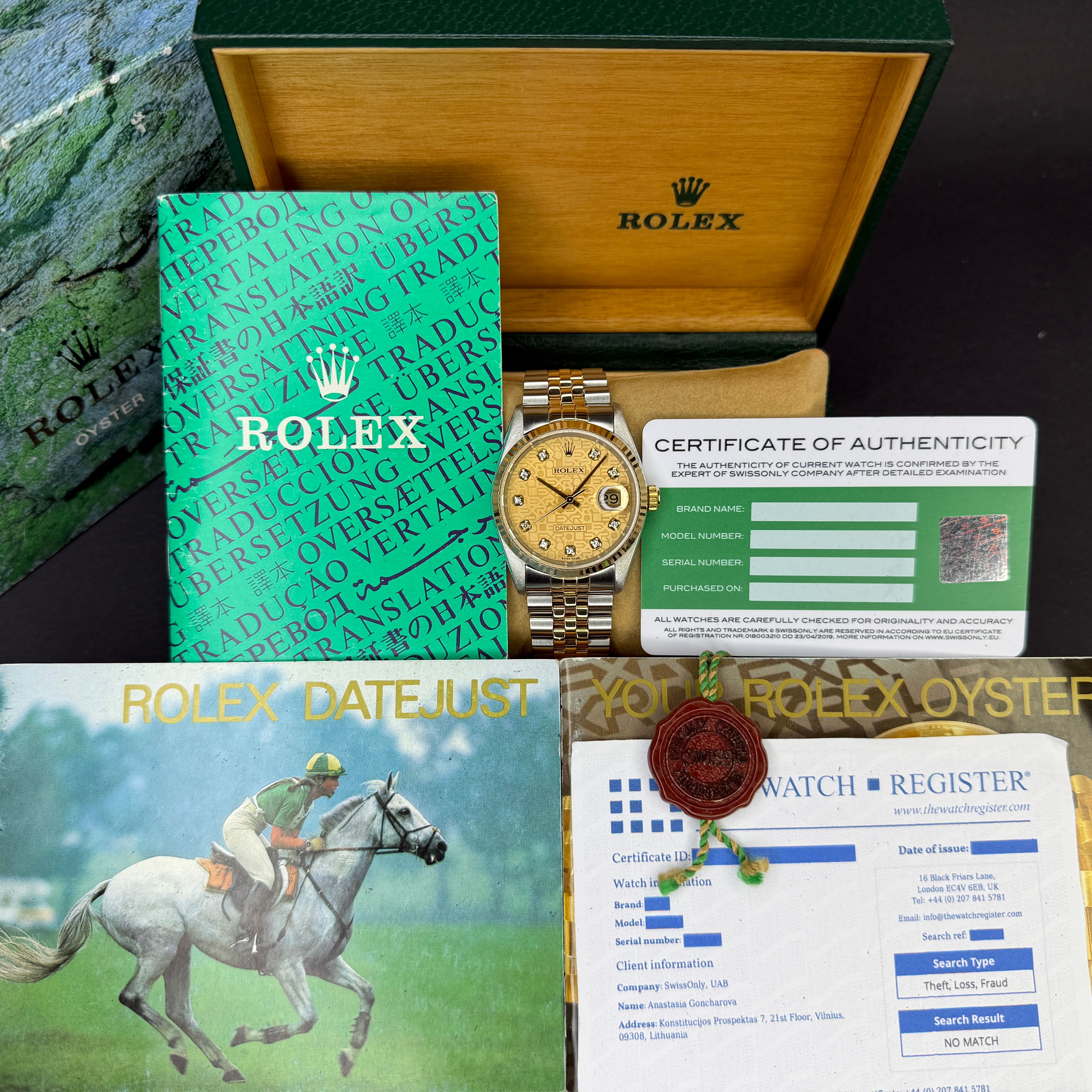 This Rolex Datejust 16233 features a Champagne jubilee big diamond dial and is crafted from 18K yellow gold and stainless steel, with a production year of 1993.Case No: S85XXXX