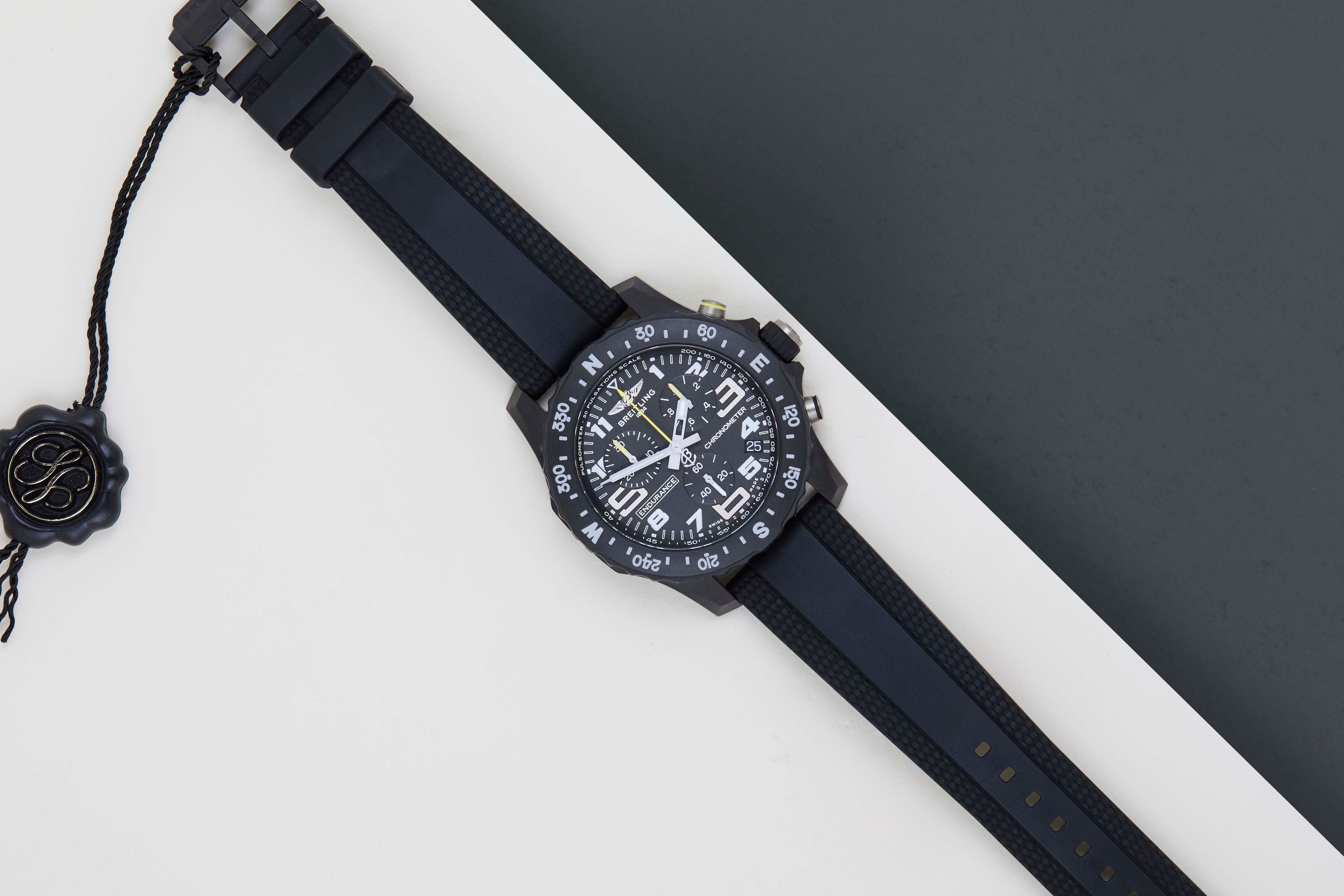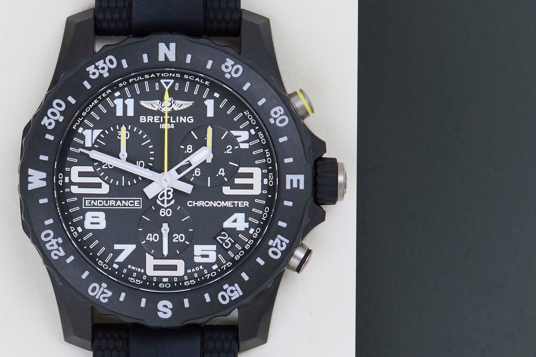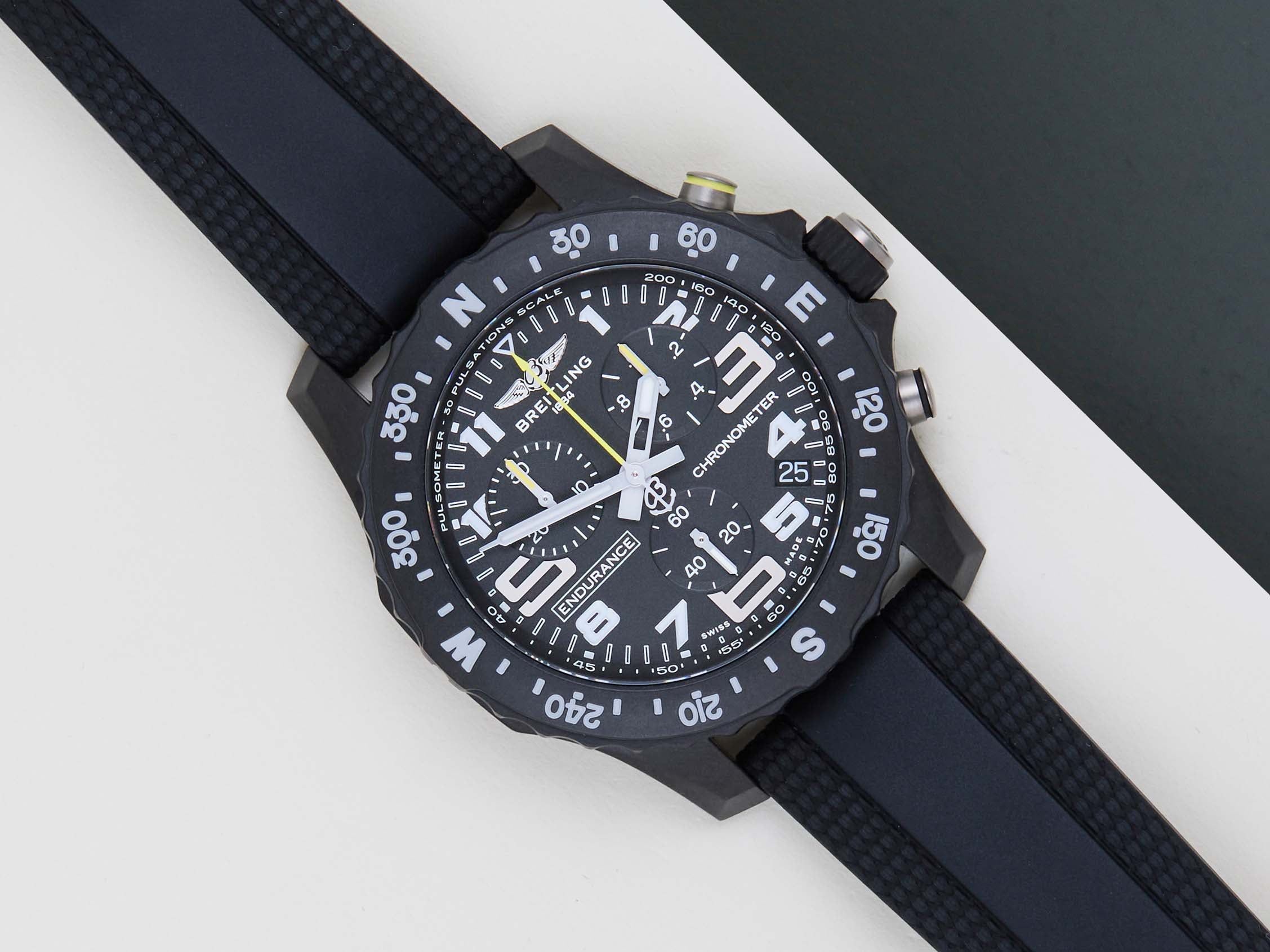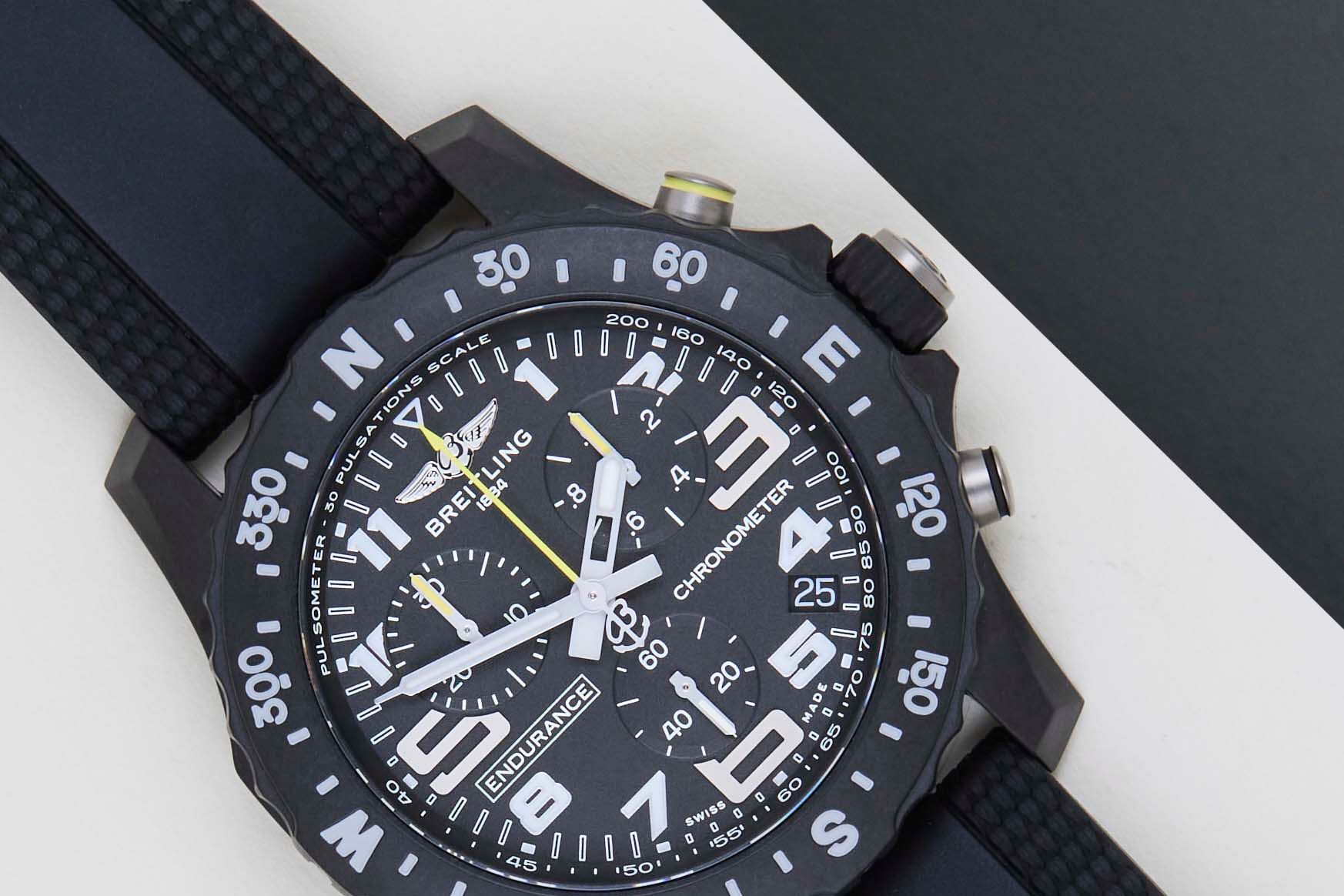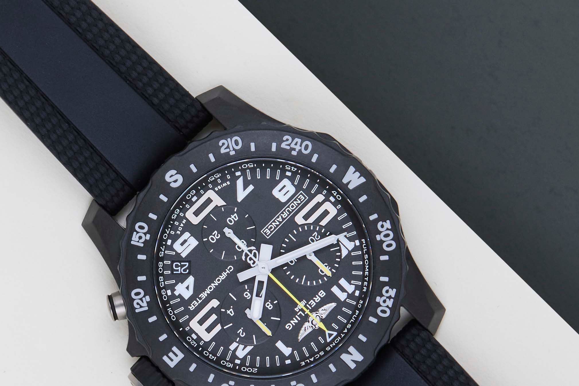New & Unworn | Full Set | International Breitling Warranty Until November 2027 The New Breitling Endurance PRO model of Breitling is a lightweight watch at approximately 64.8 gram. The case of the watch is made out of Breitlight, it is not only highly scratch resistant, but also extreme light material which is anti magnetic and hypoallergenic. The case has a diameter of 44MM and 12.5MM is thick and is water resistant up to 10 bars. This Breitling Endurance Pro ‘Black’ is New & Unworn and comes with the original Breitling warranty Booklet and Box. Furthermore the watch still has Breitling Warranty until November 2027