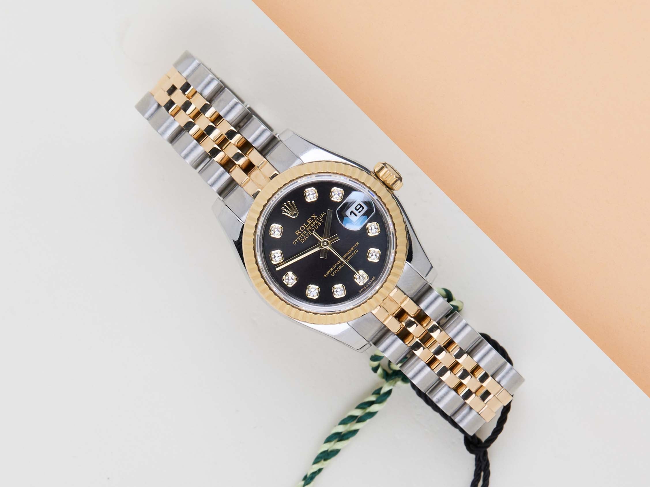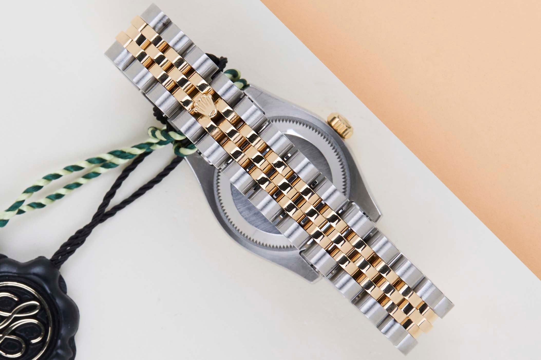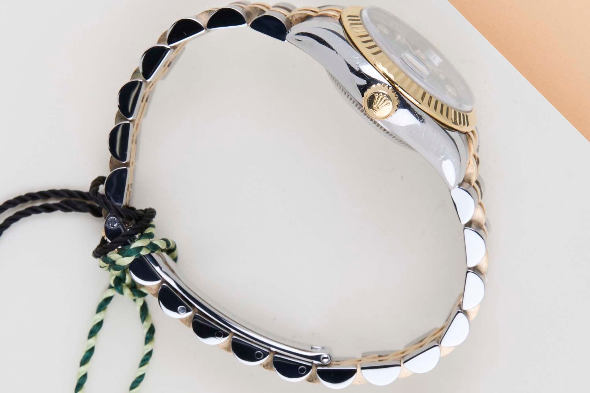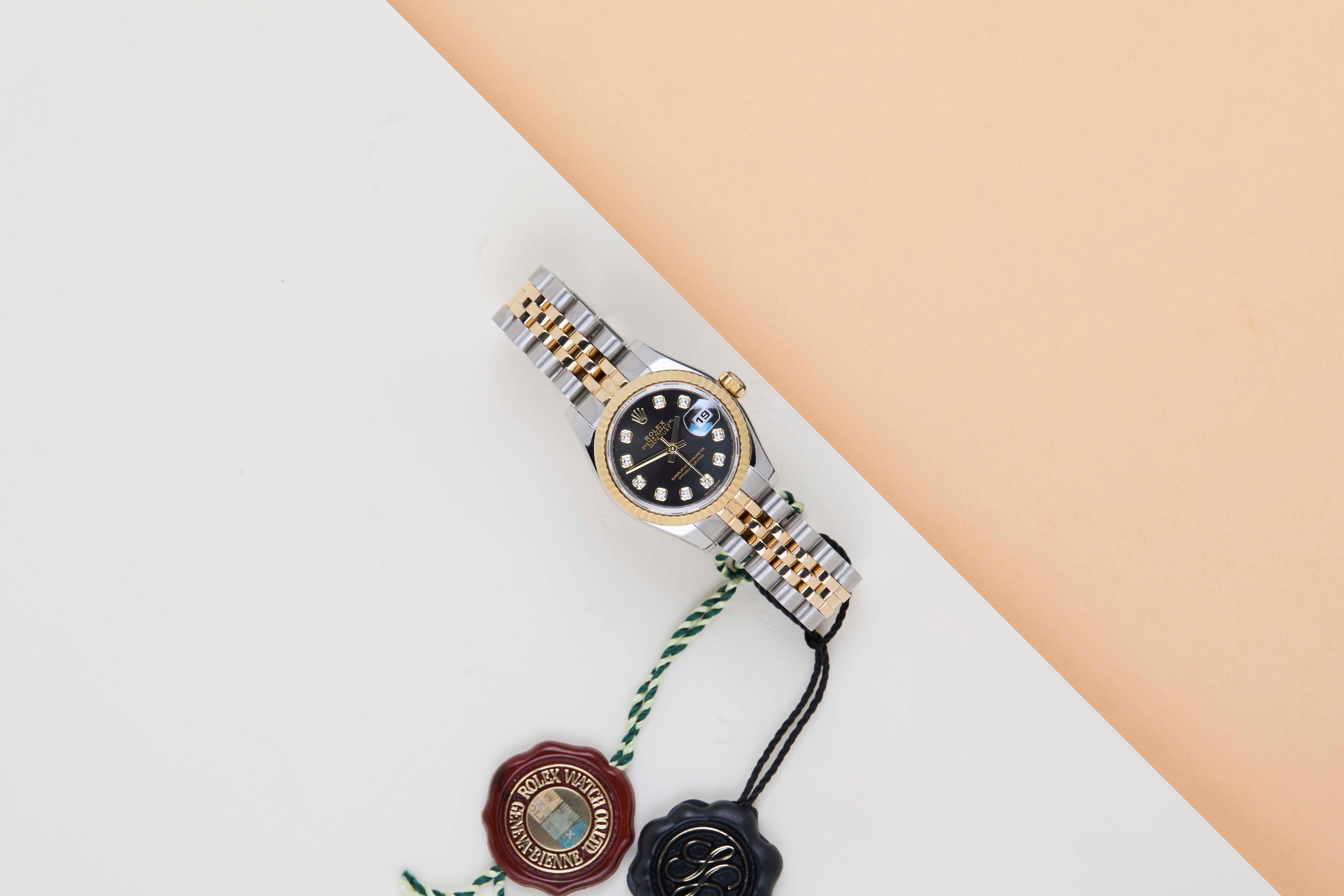 Full Set Rolex introduced the original Datejust in 1945 to celebrate the company's 40th anniversary. Due to the enormous success, Rolex released the first Lady-Datejust in 1957.This Rolex Datejust 26 'Black Diamond Dial - Jubilee' dates back to September 2011.This Datejust is made of a combination of 18k Yellow Gold and stainless steel and is fitted with a Jubilee bracelet which conceals the Crown clasp.This Rolex Datejust 26 is in Mint condition and comes with the original Rolex Warranty Card and Box. Furthermore, the watch has been serviced by our watchmakers and therefore has one year Steiner Warranty.