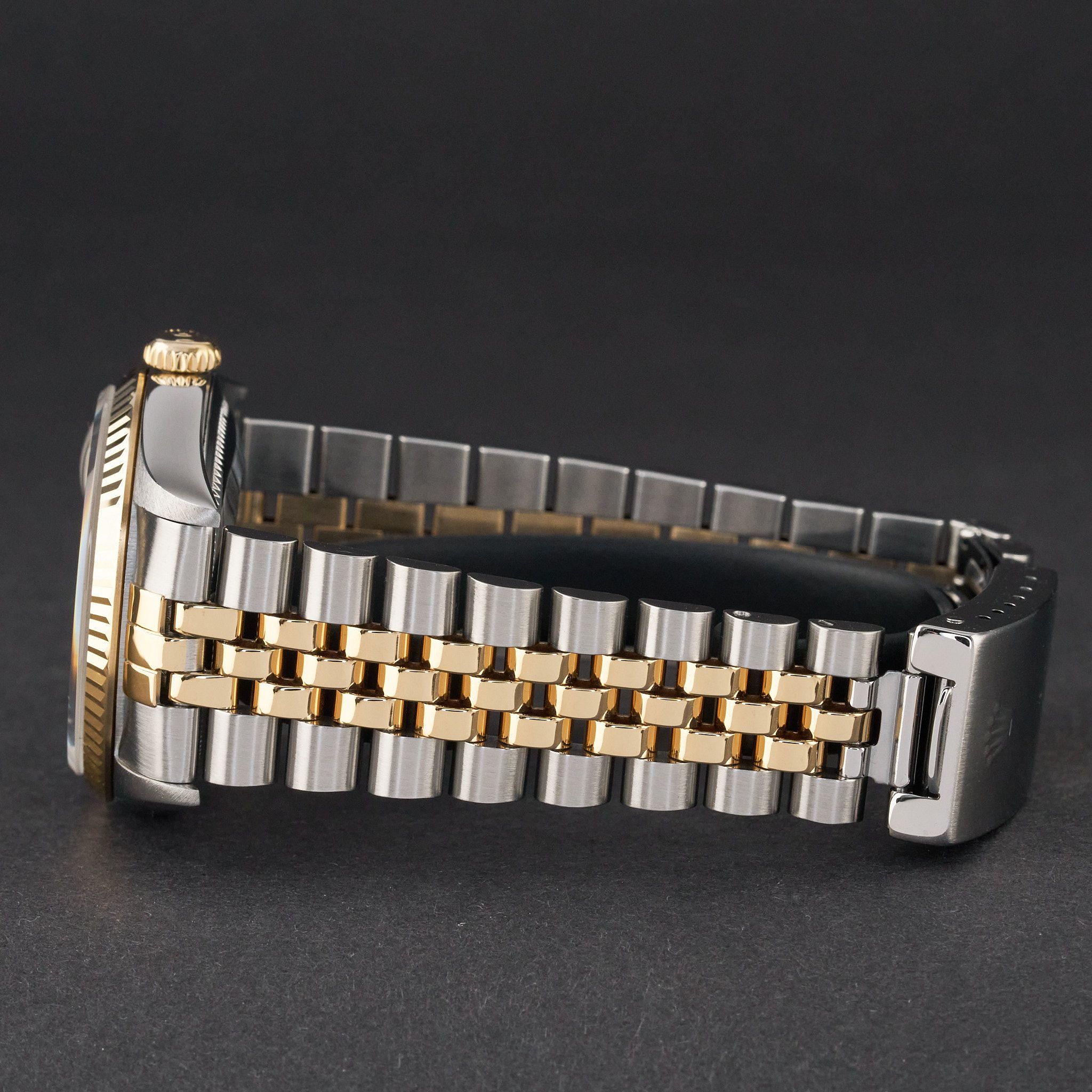 This Rolex Datejust 16233 features a Champagne jubilee big diamond dial and is crafted from 18K yellow gold and stainless steel, with a production year of 1996.Case No: T21XXXX