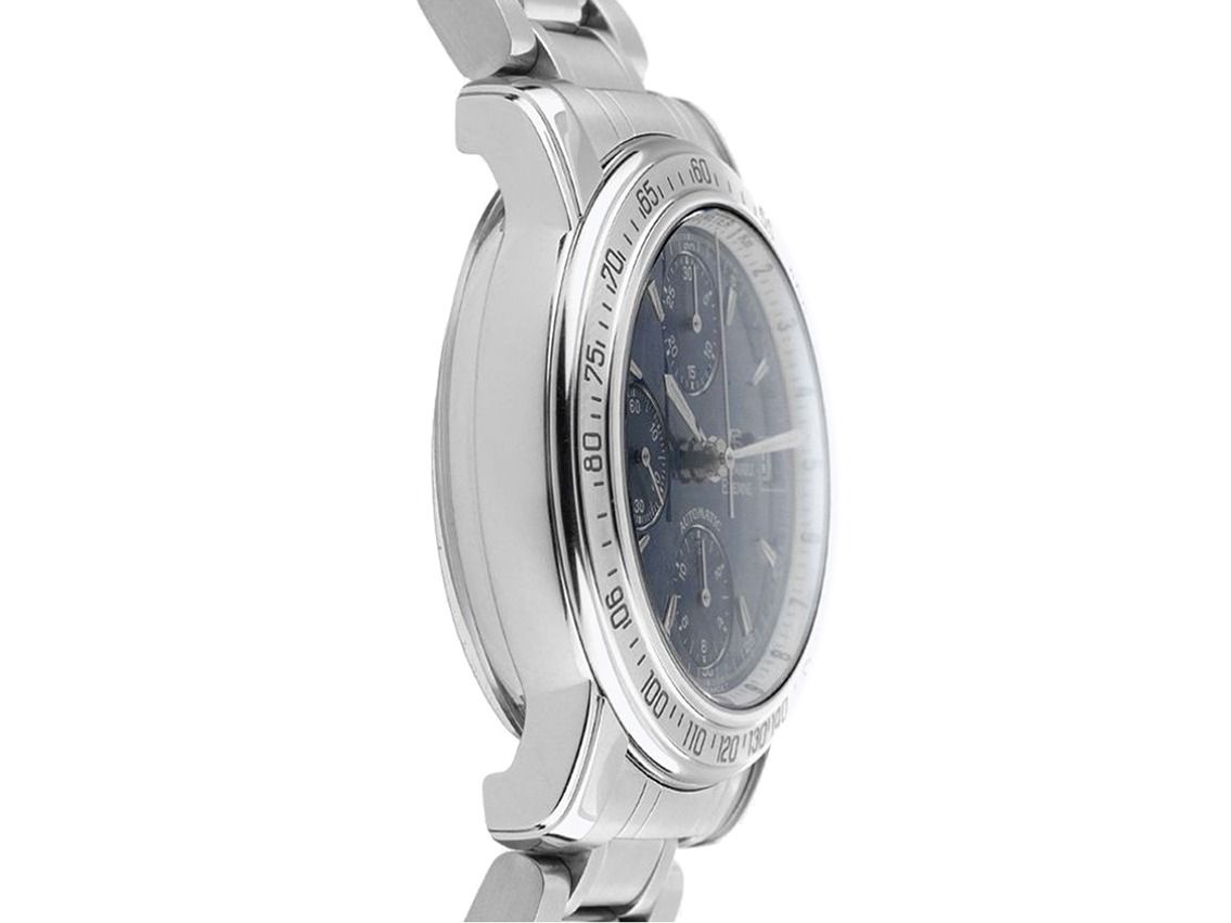 Gehäuse aus poliertem und satiniertem Edelstahl, Gehäusedurchmesser ohne Krone 39mm, Gehäusehöhe 13,7mm. Lünette aus Edelstahl mit gravierter Tachymeterskala. Armband aus satiniertem Edelstahl, Sicherheitsfaltschließe aus Edelstahl mit Hersteller-Logo. Zifferblatt blau mit aufgesetzten Edelstahl-Keilindexen und polierten Zeigern. Uhrwerk Automatik, Chronograph, Kaliber ETA Valjoux 7750 mit 26 Edelsteinen. Anzeige von Stunde und Minute über Zeiger aus der Mitte, kleine Sekunde mit Sekundenstopp zur sekundengenauen Einstellung der Uhrzeit bei 9 Uhr, Datumsanzeige mit Schnellverstellung bei 3 Uhr. Saphirglas gewölbt und kratzfest. Krone verschraubbar mit Flankenschutz und Hersteller-Logo. Boden aus Edelstahl 6-fach verschraubt und graviert mit Saphirglas-Sichtfenster. Gewicht der Uhr inklusive Armband 160g, Länge des Armbandes inklusive Gehäuse 190mm. Referenznummer: 585404, Gehäusenummer: XXX, Baujahr: 1998, ID: P209012001225H-3200, Artikelnummer: 10000083765. Mit Gangkontrolle und kompletter äußerlicher Aufarbeitung von Dezember 2025. Original Schwarz Etienne Box mit Umkarton und Beschreibung sowie original Rechnung über Glasboden von Schwarz Etienne sowie Watchregister-Auszug von Dezember 2025, The Watch Register Zertifikat / ohne Eintrag (Internationale Datenbank für verlorene oder gestohlene Uhren). Superschnäppchen, Kapitalanlage mit Wertsteigerungspotential, extrem seltenes Sammlerstück, Tresoruhr, fast nicht getragen. Sehr guter Zustand. Lieferzeit sofort.