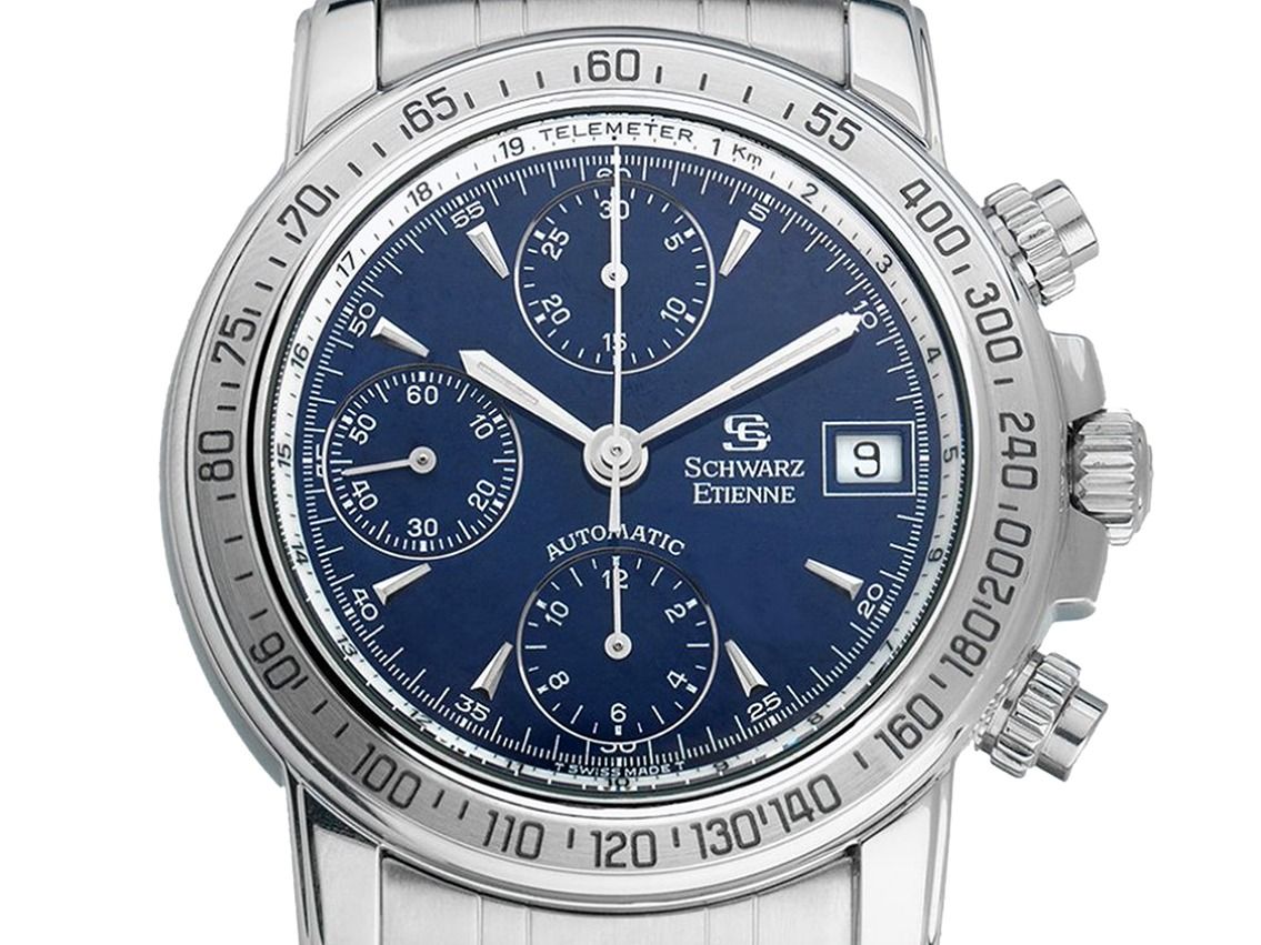 Schwarz Etienne Depose Stahl Automatik Chronograph Armband StahlGehäuse Edelstahl poliert und satiniert, Gehäusedurchmesser ohne Krone 39mm, Gehäusehöhe 13,7mm. Lünette Edelstahl mit gravierter Tachymeter Skala. Armband Edelstahl satiniert, Sicherheitsfaltschließe Edelstahl mit Hersteller-Logo. Zifferblatt blau mit aufgesetzten Edelstahl Keilindexen und polierten Zeigern. Uhrwerk Automatik, Chronograph, Kaliber ETA Valjoux 7750 mit 26 Edelsteinen. Anzeige von Stunde und Minute über Zeiger aus der Mitte, kleine Sekunde mit Sekundenstopp zur sekundengenauen Einstellung der Uhrzeit bei 9 Uhr, Datumsanzeige mit Schnellverstellung bei 3 Uhr. Saphirglas gewölbt und kratzfest. Krone verschraubbar mit Flankenschutz und Hersteller-Logo. Boden Edelstahl 6-fach verschraubt und graviert mit Saphirglas Sichtfenster. Gewicht der Uhr inklusive Armband 160g, Länge des Armbandes inklusive Gehäuse 190mm. Referenznummer: 585404, Gehäusenummer: XXX, Baujahr: 1998, ID: P209012001225H-3200, Artikelnummer: 10000083765. Mit Gangkontrolle und kompletter äußerlicher Aufarbeitung von Dezember 2025. Original Schwarz Etienne Box mit Umkarton und Beschreibung sowie original Rechnung über Glasboden von Schwarz Etienne sowie Watchregister Auszug von Dezember 2025, The Watch Register Zertifikat / ohne Eintrag (Internationale Datenbank für verlorene oder gestohlene Uhren). Superschnäppchen, Kapitalanlage mit Wertsteigerungspotential, extrem seltenes Sammlerstück, Tresoruhr, fast nicht getragen. Sehr guter Zustand. Lieferzeit sofort.