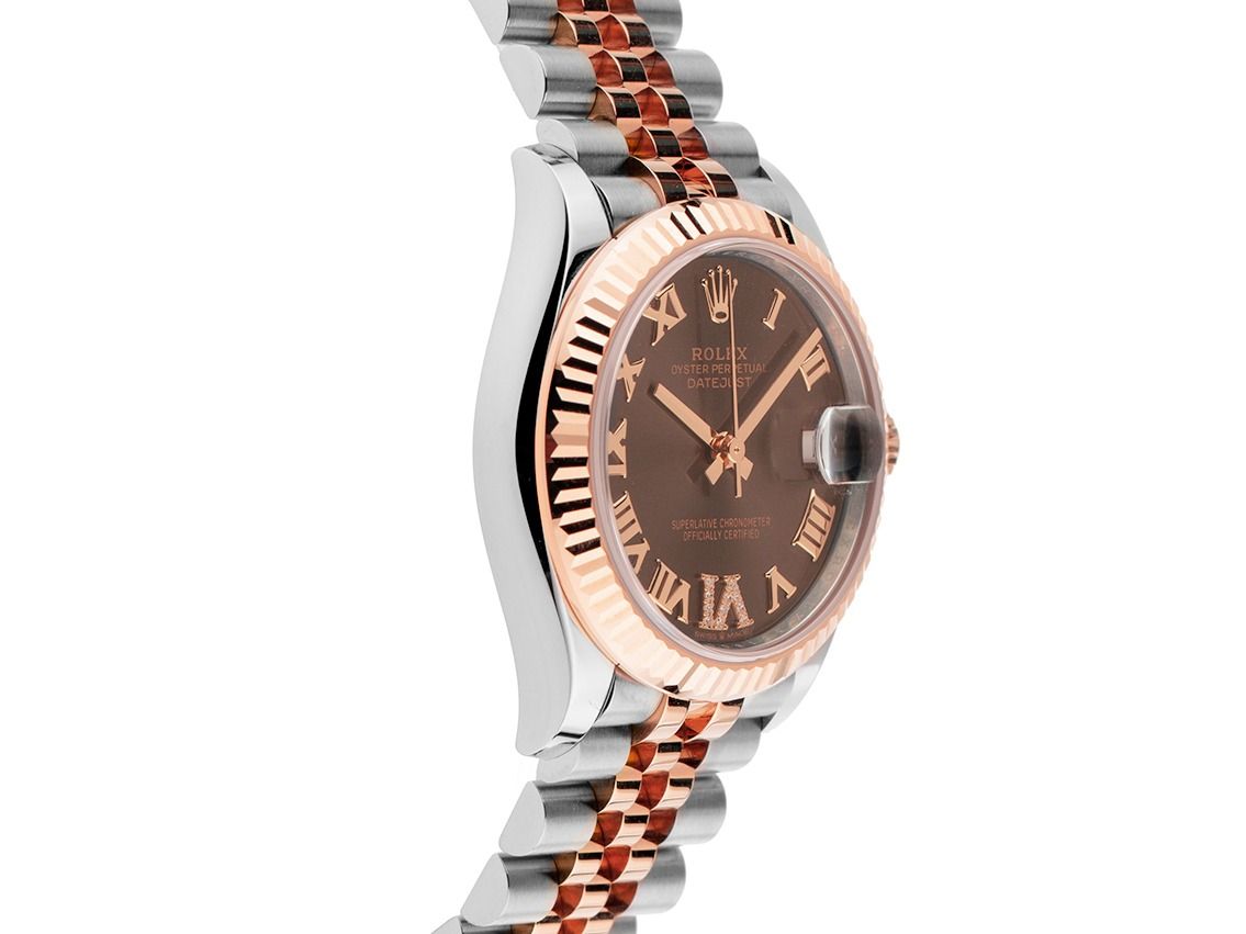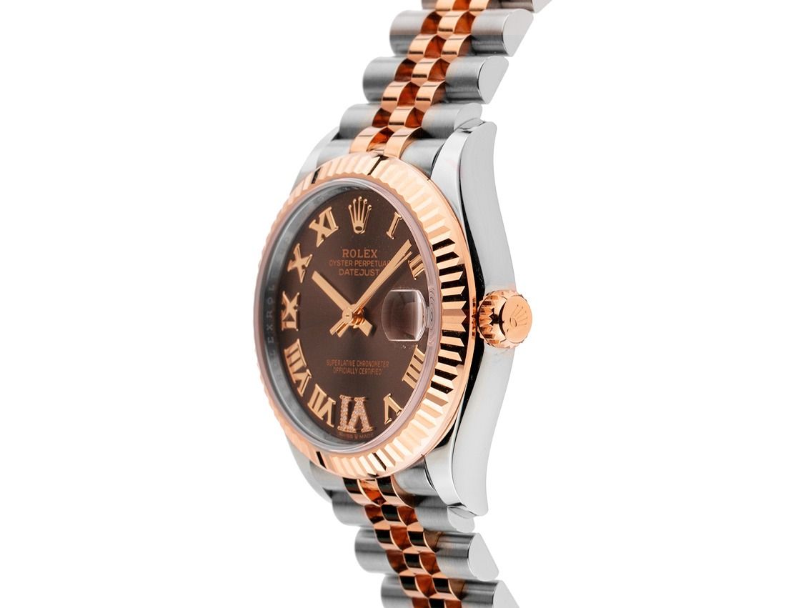 Gehäuse aus poliertem und satiniertem Edelstahl, Gehäusedurchmesser ohne Krone 31mm, Gehäusehöhe 10,5mm. Lünette aus 18kt Roségold Everose, geriffelt und poliert. Armband Jubilé aus poliertem und satiniertem Edelstahl / 18kt Roségold Everose, Rolex verdeckte Faltschließe mit Hersteller-Logo. Zifferblatt schokobraun mit aufgesetzten roségoldenen römischen Ziffern und "VI" mit 11 Diamanten sowie roségoldenen Zeigern. Uhrwerk Automatik, Chronometer mit Zeugnis, Rolex Manufakturkaliber 2235 mit 31 Edelsteinen. Anzeige von Stunden, Minuten und Sekunden über Zeiger aus der Mitte mit Sekundenstopp zur sekundengenauen Einstellung der Uhrzeit, Datumsanzeige mit Schnellverstellung unter Glaslupe bei 3 Uhr. Saphirglas kratzfest. Krone aus 18kt Roségold Everose, verschraubbar mit Hersteller-Logo. Boden aus Edelstahl, verschraubt. Gewicht der Uhr inklusive Armband 97g, Länge des Armbandes inklusive Gehäuse 170mm. Referenznummer 278271, ID: P2126265001225H-17800/14500, Artikelnummer: 10000083945. Original Rolex Box mit Umkarton und Garantie-Papieren von November 2021, neue Rolex Garantiekarte ohne Ländercode sowie Beschreibung, Ledermäppchen und Rolex Chronometer-Siegel sowie Watchregister-Auszug von Dezember 2025, The Watch Register Zertifikat / ohne Eintrag (Internationale Datenbank für verlorene oder gestohlene Uhren), Full Set. Superschnäppchen, Kapitalanlage mit Wertsteigerungspotential. Ungetragen. Lieferzeit sofort.