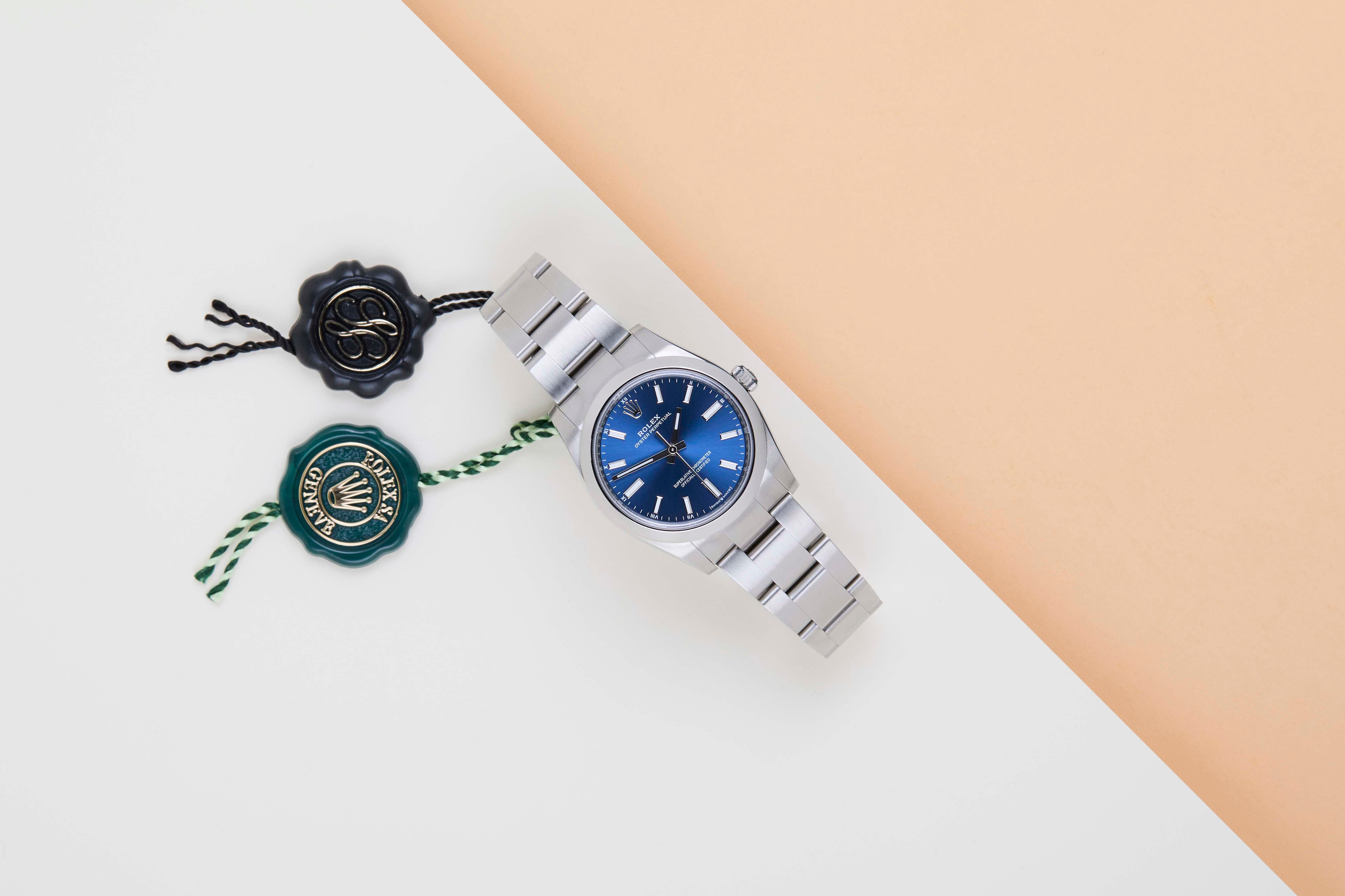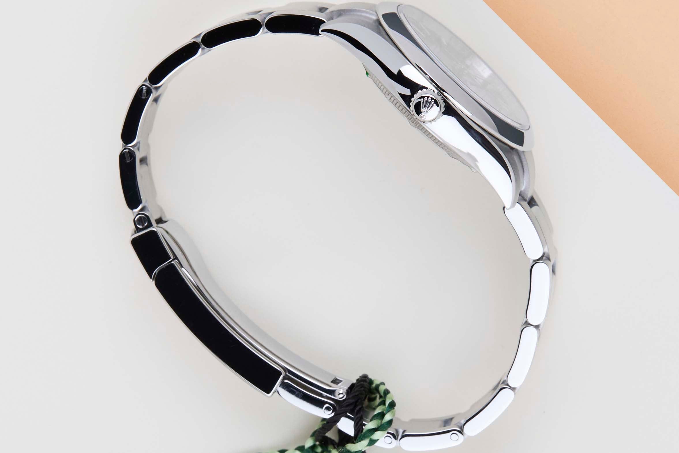 Diese Rolex Oyster Perpetual 34 ist in neuem und ungetragenem Zustand und wird mit der originalen Rolex-Garantiekarte und der Box geliefert. Darüber hinaus hat die Uhr noch eine weltweite Rolex-Garantie bis September 2030.